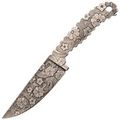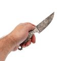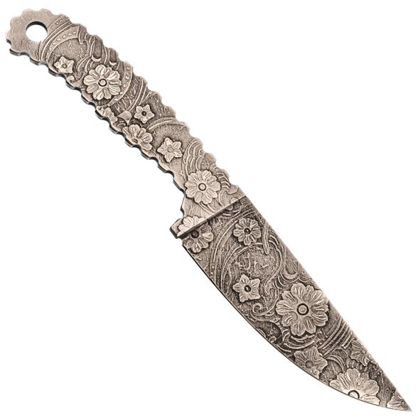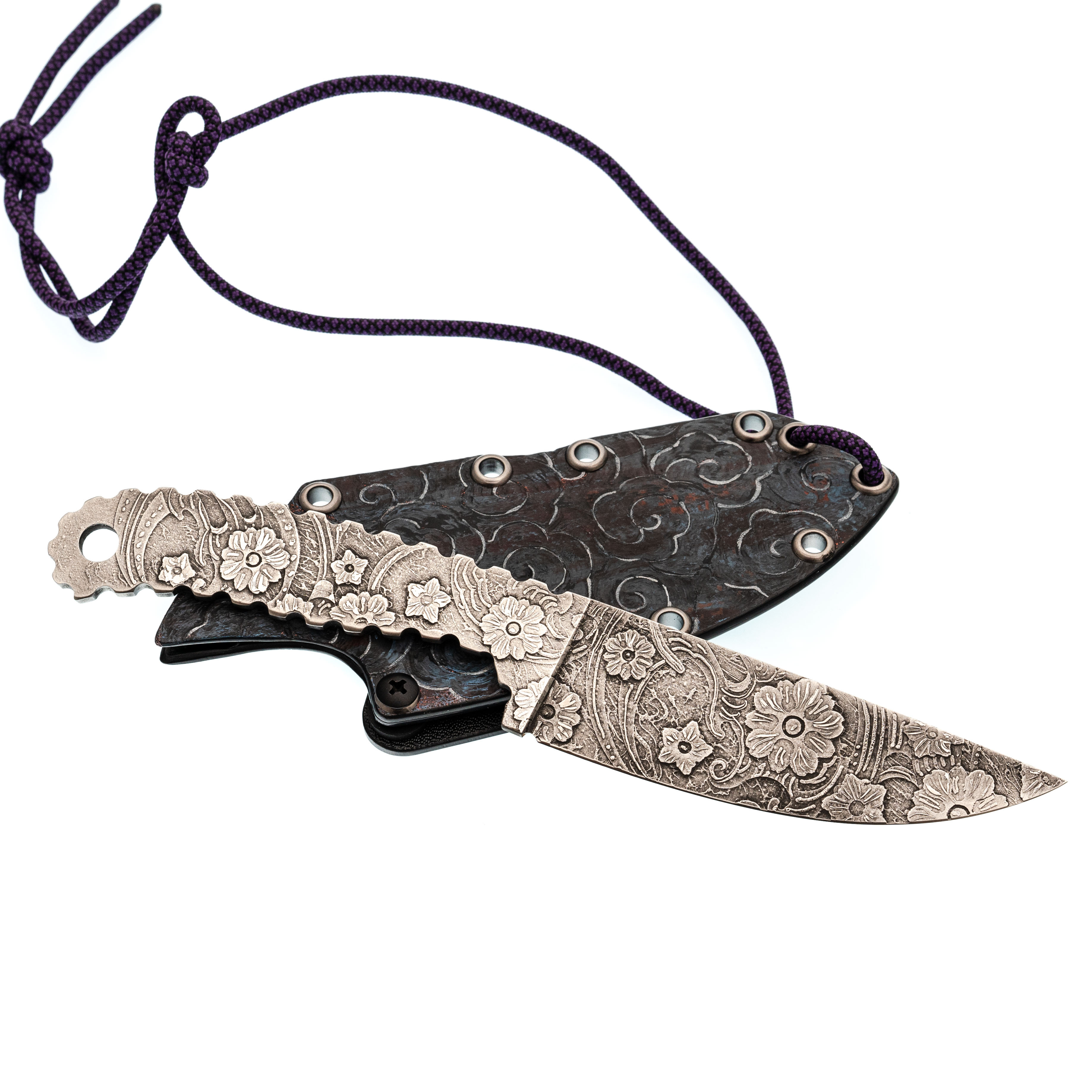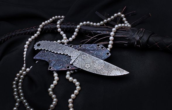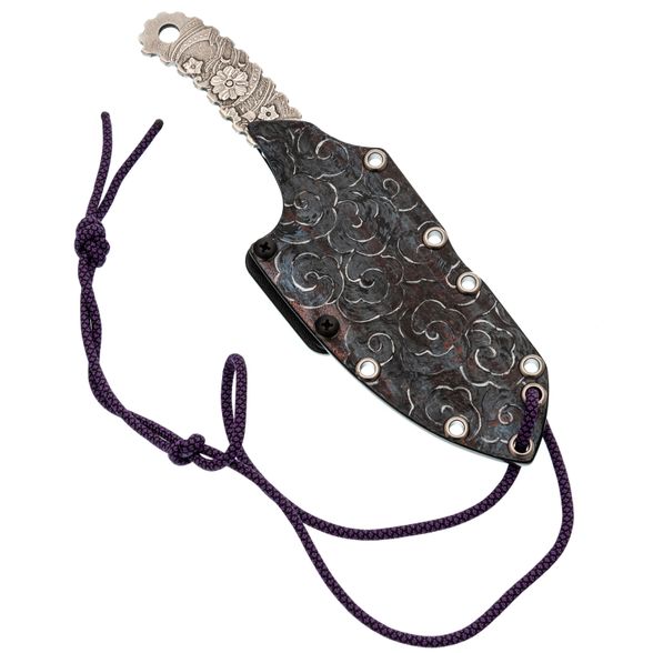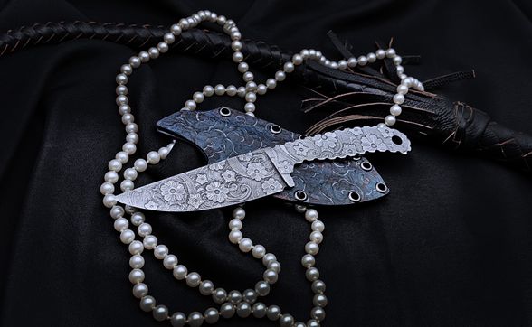 Ножны из Kydex плотно удерживают нож за счёт точной подгонки формы: клинок входит с характерным щелчком и так же уверенно извлекается. В комплект входит клипса для ношения на ремне, что удобно для повседневного использования и небольших выездов за город. Отдельный штрих - ручная роспись ножен цветами в единой с клинком тематике. Это делает комплект цельным и узнаваемым: практичный инструмент, который выглядит так же интересно, как и работает.