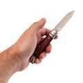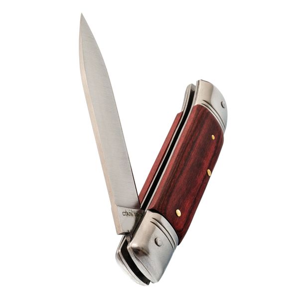 Рукоять сочетает металл с деревянными вставками. За счёт своей толщины она надёжно ложится в ладонь и не выскальзывает. Классическая конструкция с больстером и навершием придаёт модели аккуратный и цельный вид.