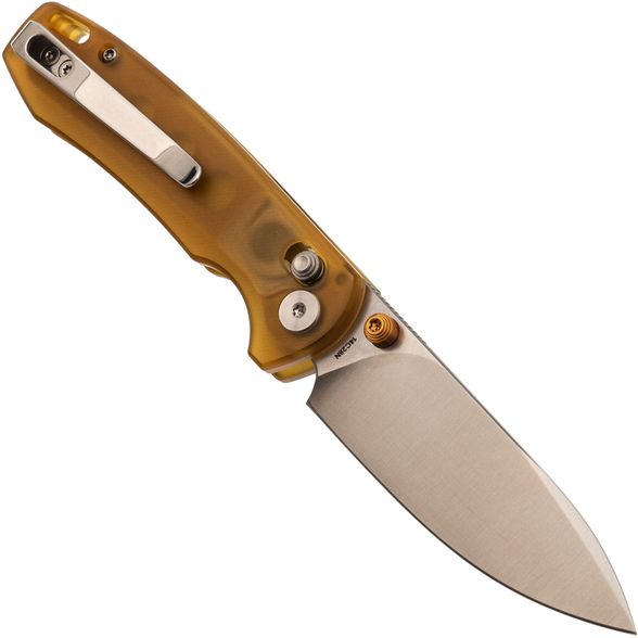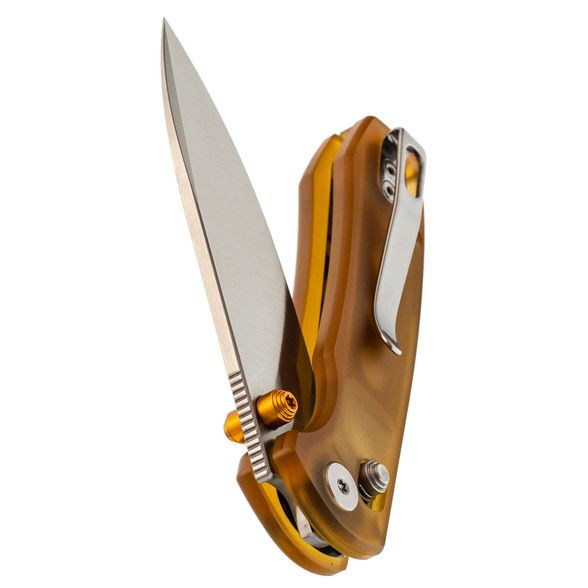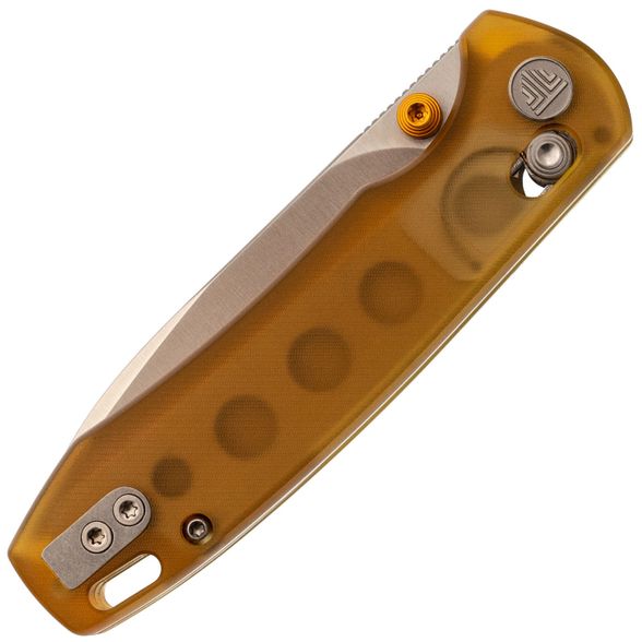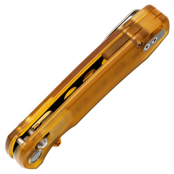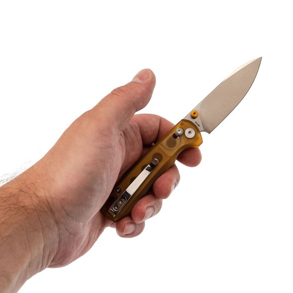 Рукоять ножа имеет удобную форму, обеспечивающую надежный хват и комфорт даже при длительном использовании. Прозрачные накладки из Ultem не только смотрятся стильно, но и дают возможность видеть внутренний механизм. В конструкции предусмотрено темлячное отверстие и переставляемая клипса, что делает нож универсальным и удобным как для правшей, так и для левшей.