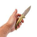 Форма Clip-Point делает нож удобным для точной работы и уверенного реза. Высокие прямые спуски обеспечивают чистый срез и лёгкий вход в материал. Клинок средней длины - универсальный формат, подходящий и для кухни на природе, и для повседневных мелочей. Плавник обеспечивает быстрое открытие одной рукой, а Frame-Lock надёжно фиксирует лезвие при работе.