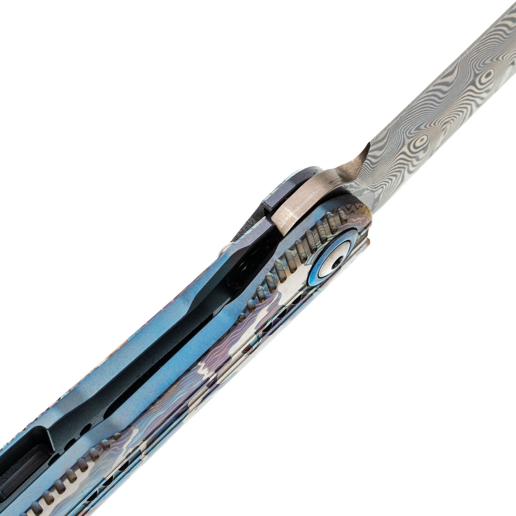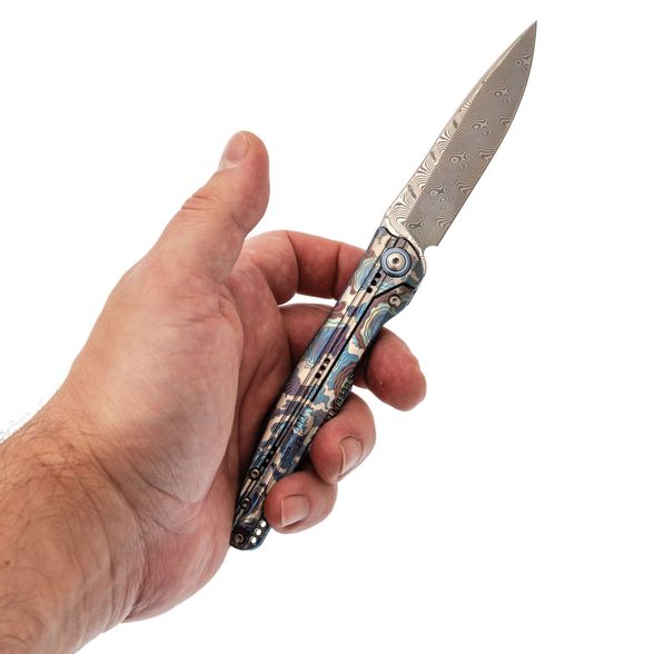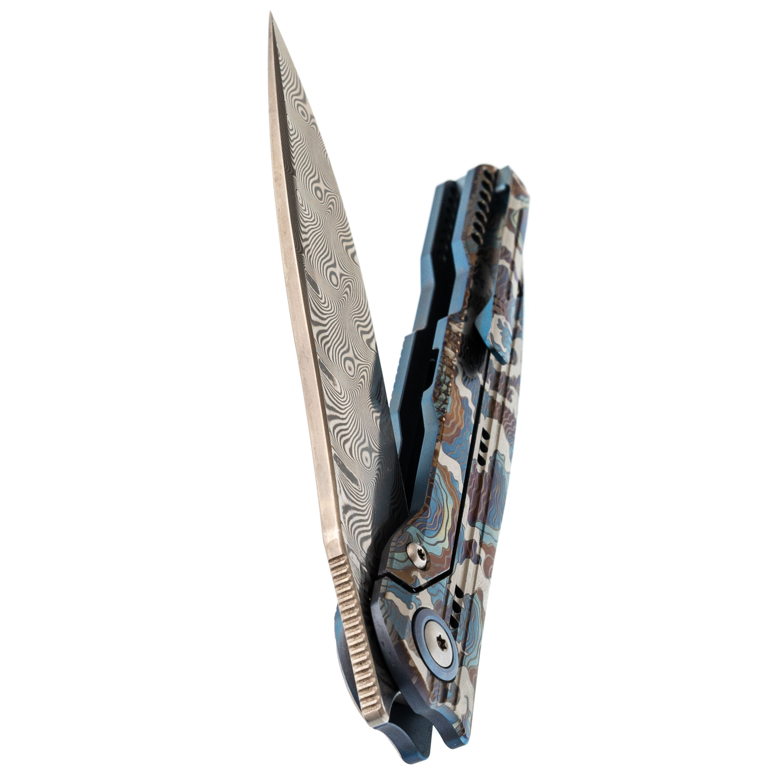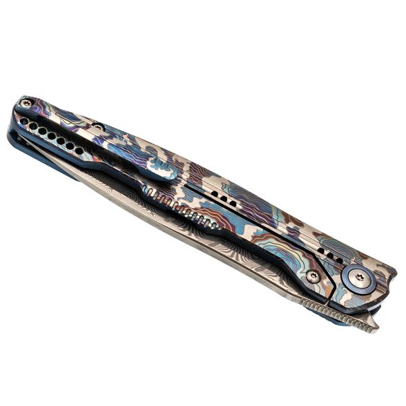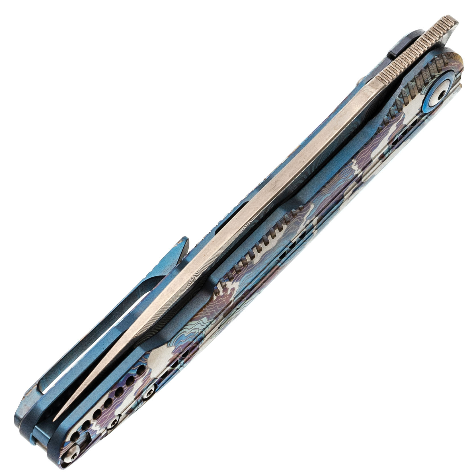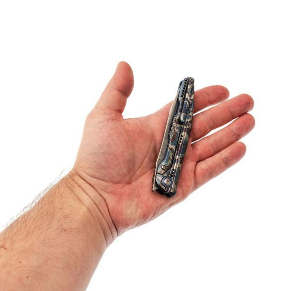 Тонкая титановая рукоять с гравировкой под камуфляж выглядит стильно и неброско. Замок Frame-Lock надёжно фиксирует клинок, а клипса позволяет удобно закрепить нож в кармане. Плоский профиль делает его почти незаметным при ношении - он не мешает, но всегда к месту.