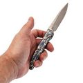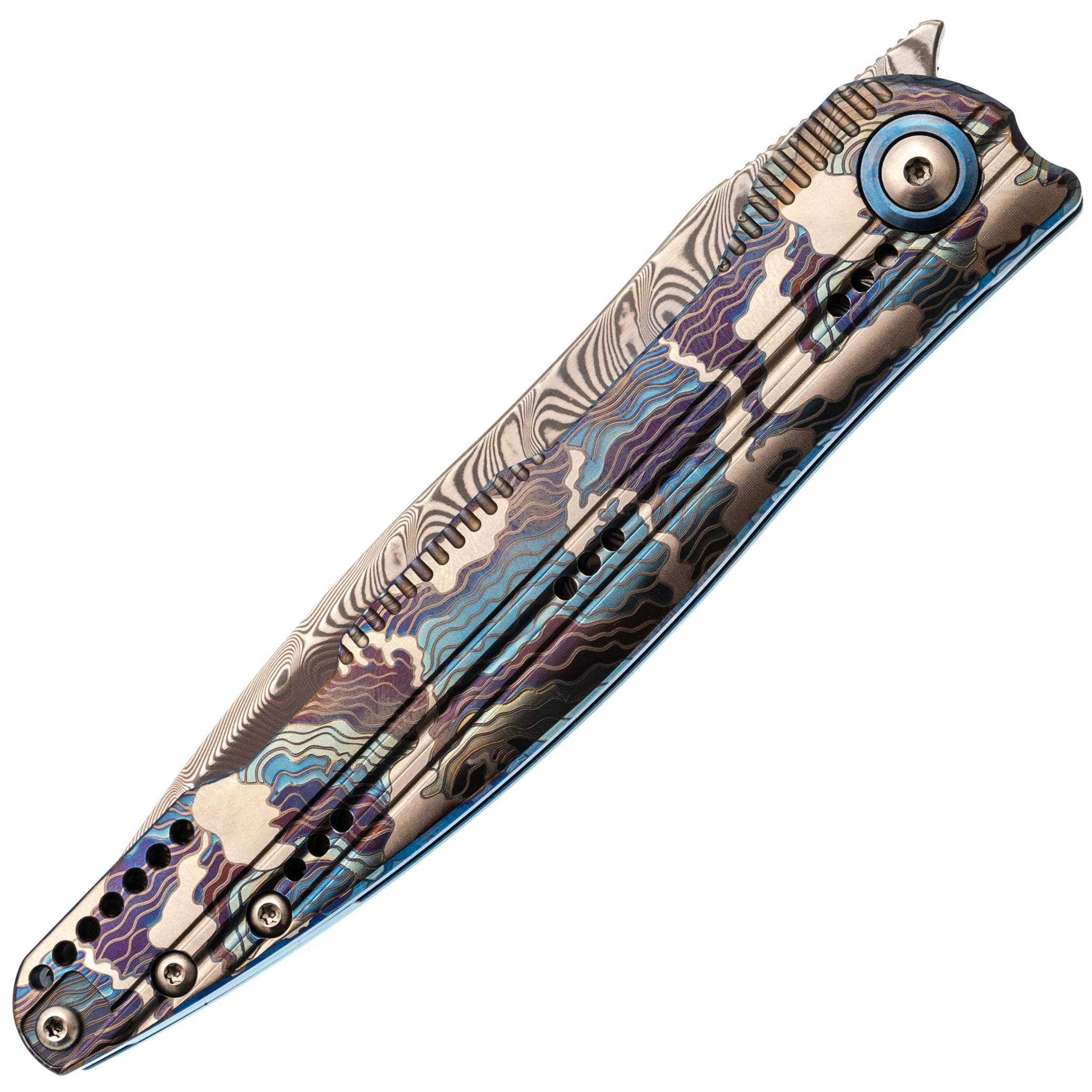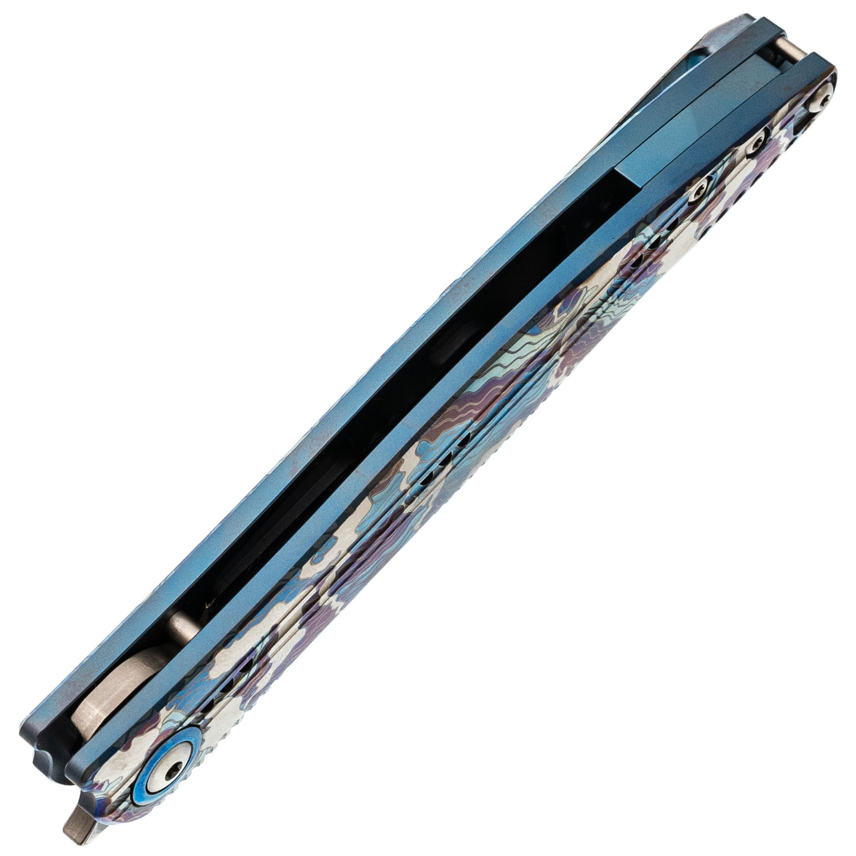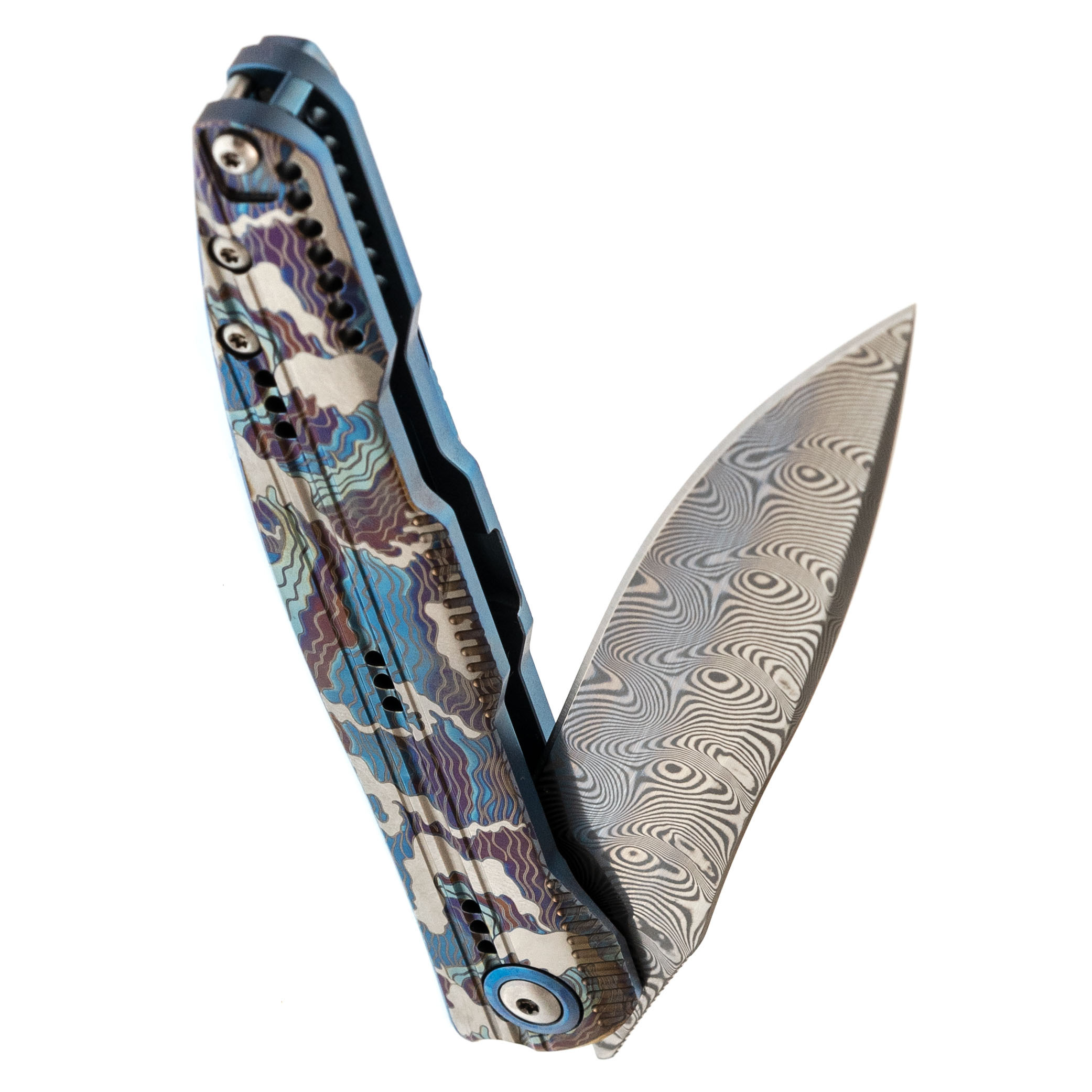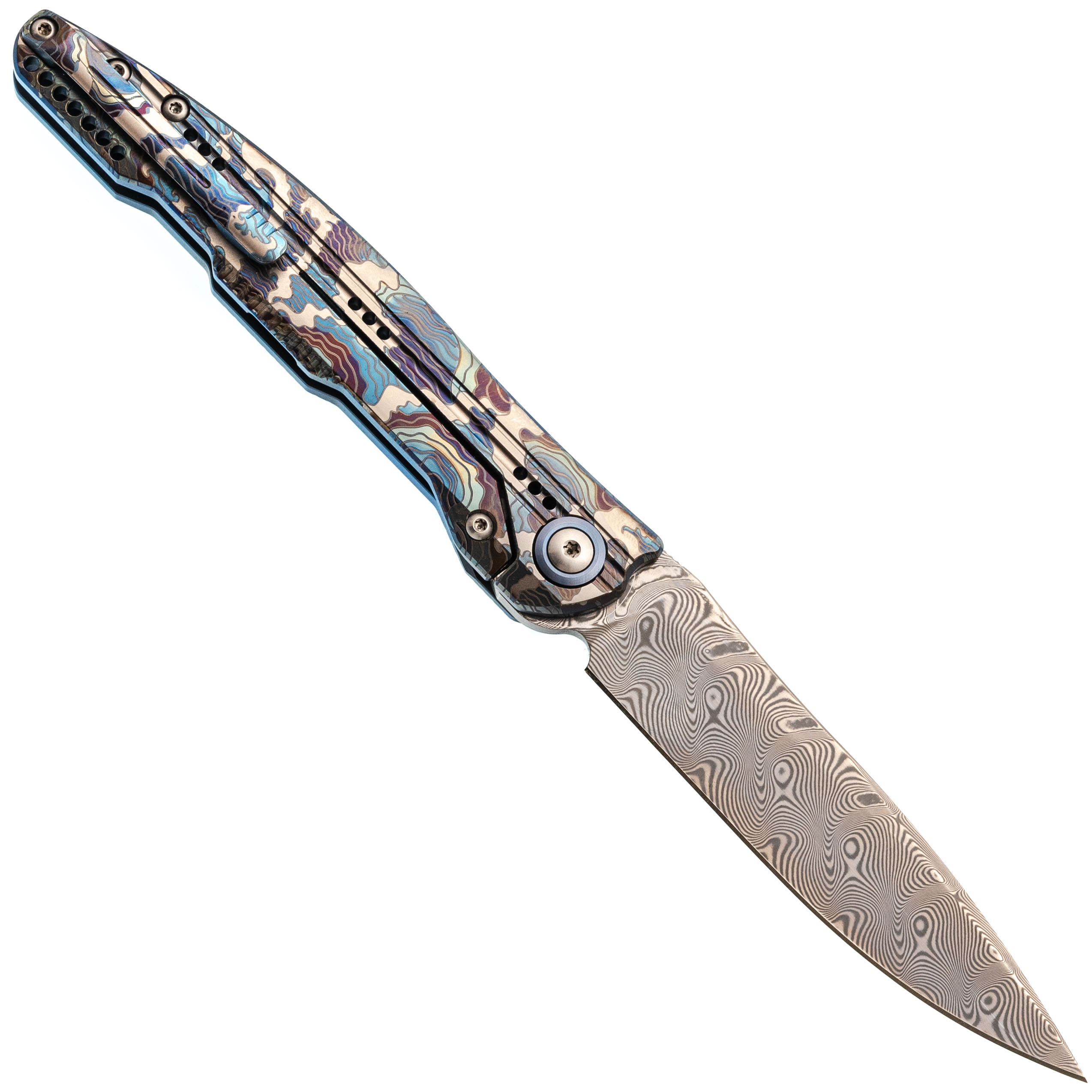 Тонкая титановая рукоять с гравировкой под камуфляж выглядит стильно и неброско. Замок Frame-Lock надёжно фиксирует клинок, а клипса позволяет удобно закрепить нож в кармане. Плоский профиль делает его почти незаметным при ношении - он не мешает, но всегда к месту.
