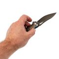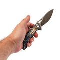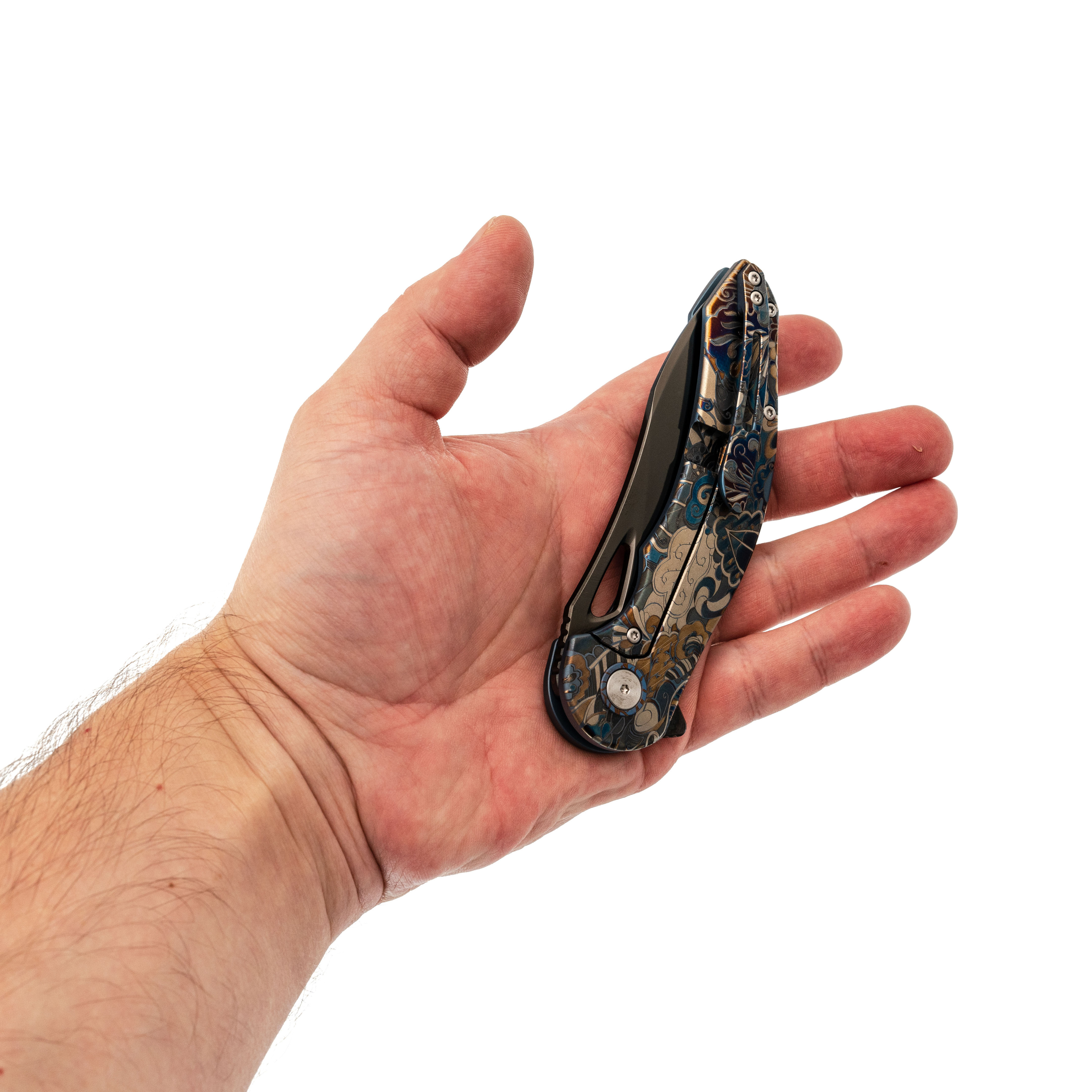 Эргономичная форма с подпальцевой выемкой делает хват уверенным и комфортным. Поверхность титана приятно холодит ладонь, а гравировка добавляет лёгкое сцепление. Флиппер и отверстие для открытия позволяют выбрать привычный способ, а клипса надёжно удерживает нож на кармане - без люфта и потери.