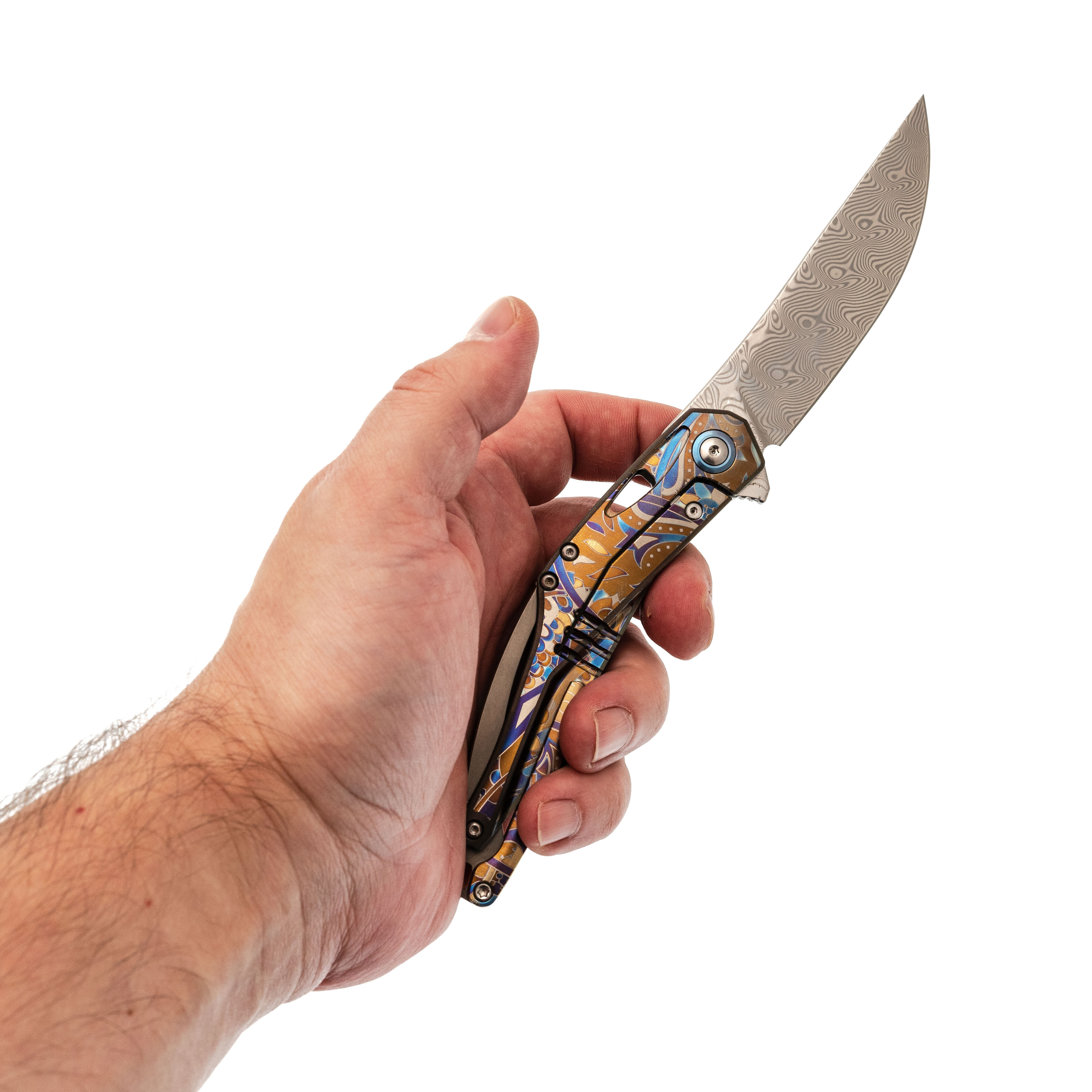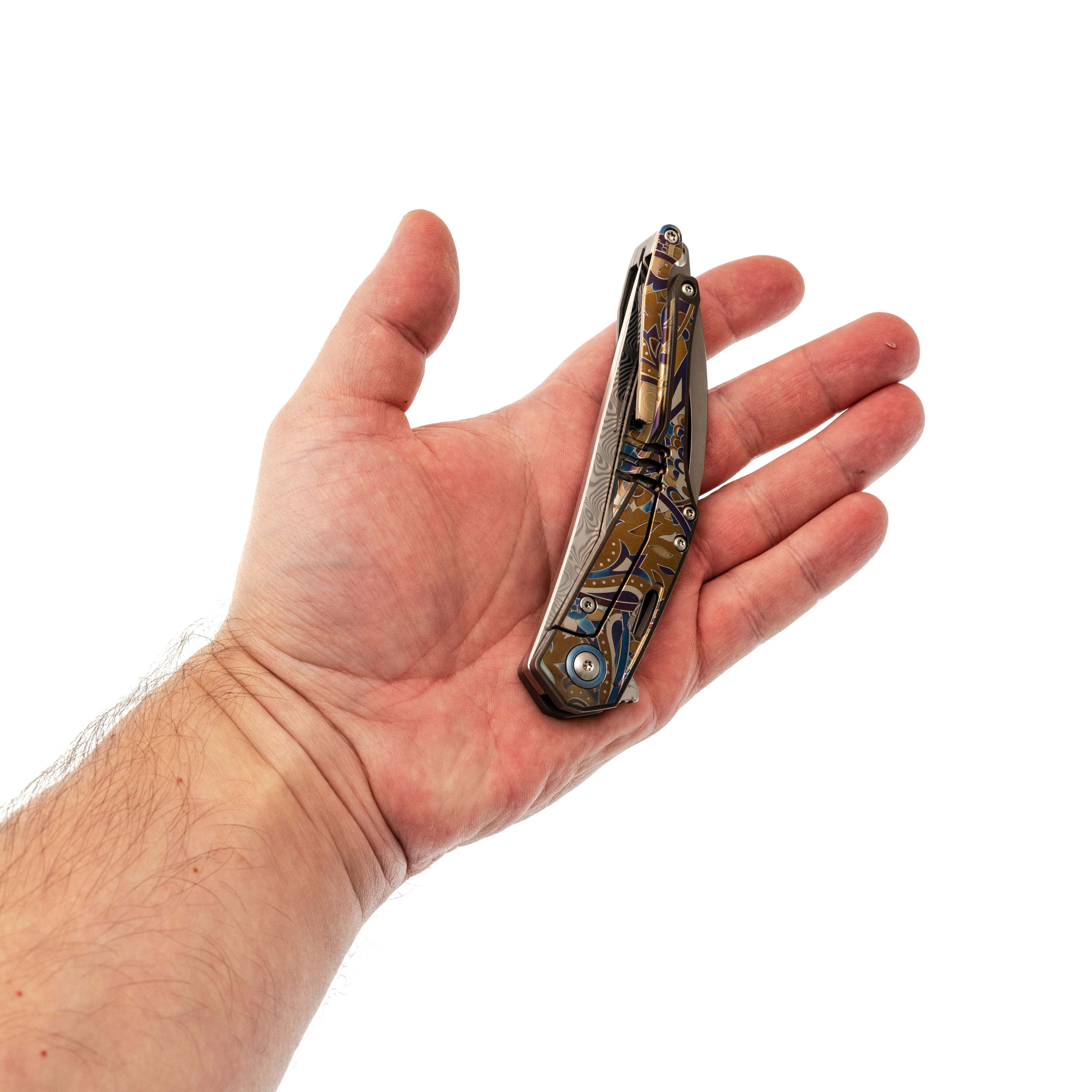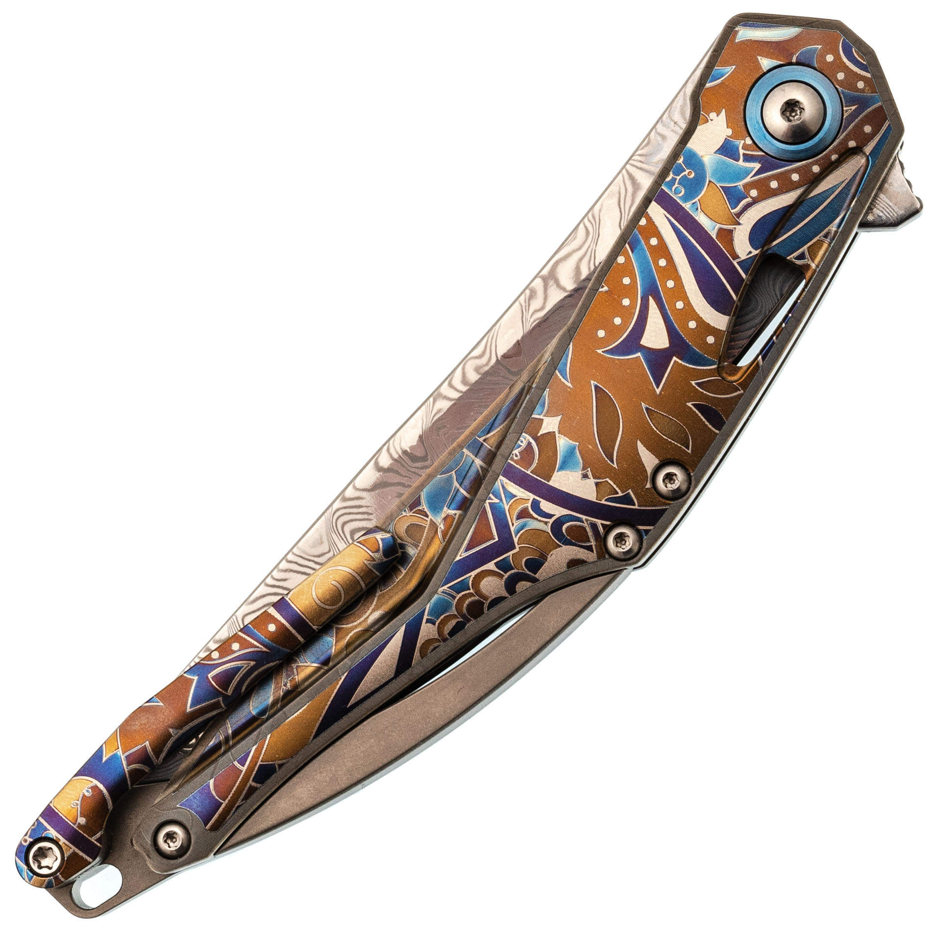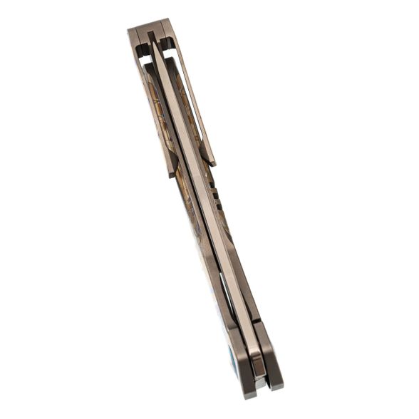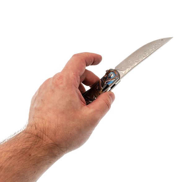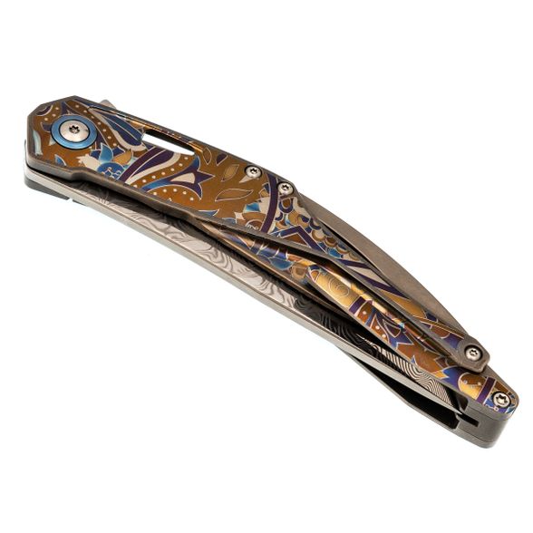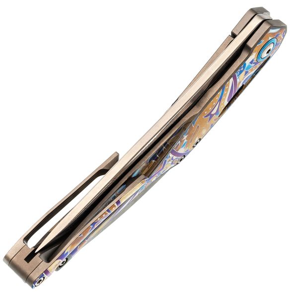 Изогнутая титановая рукоять удобно ложится в ладонь и не скользит. Облегчения и фрезеровка снижают вес, сохраняя прочность. Особое внимание заслуживает лазерная гравировка с узором - тонкая, многоцветная, она добавляет ножу изысканности и делает каждый экземпляр чуть особенным. Две клипсы позволяют закрепить нож так, как удобно именно вам - мелочь, которая в итоге решает многое.