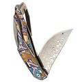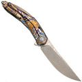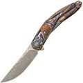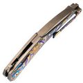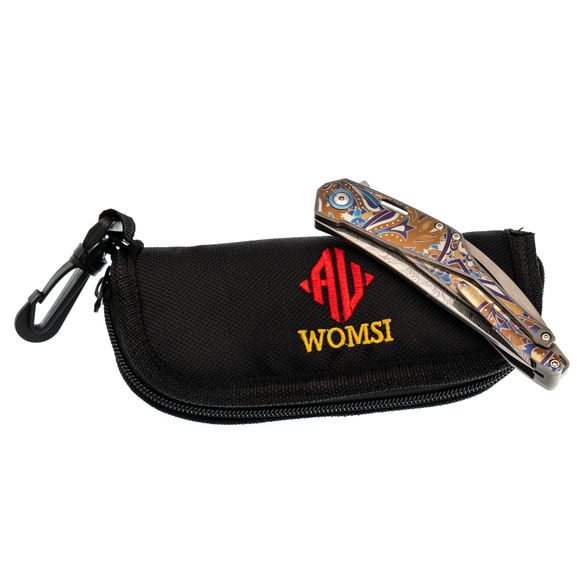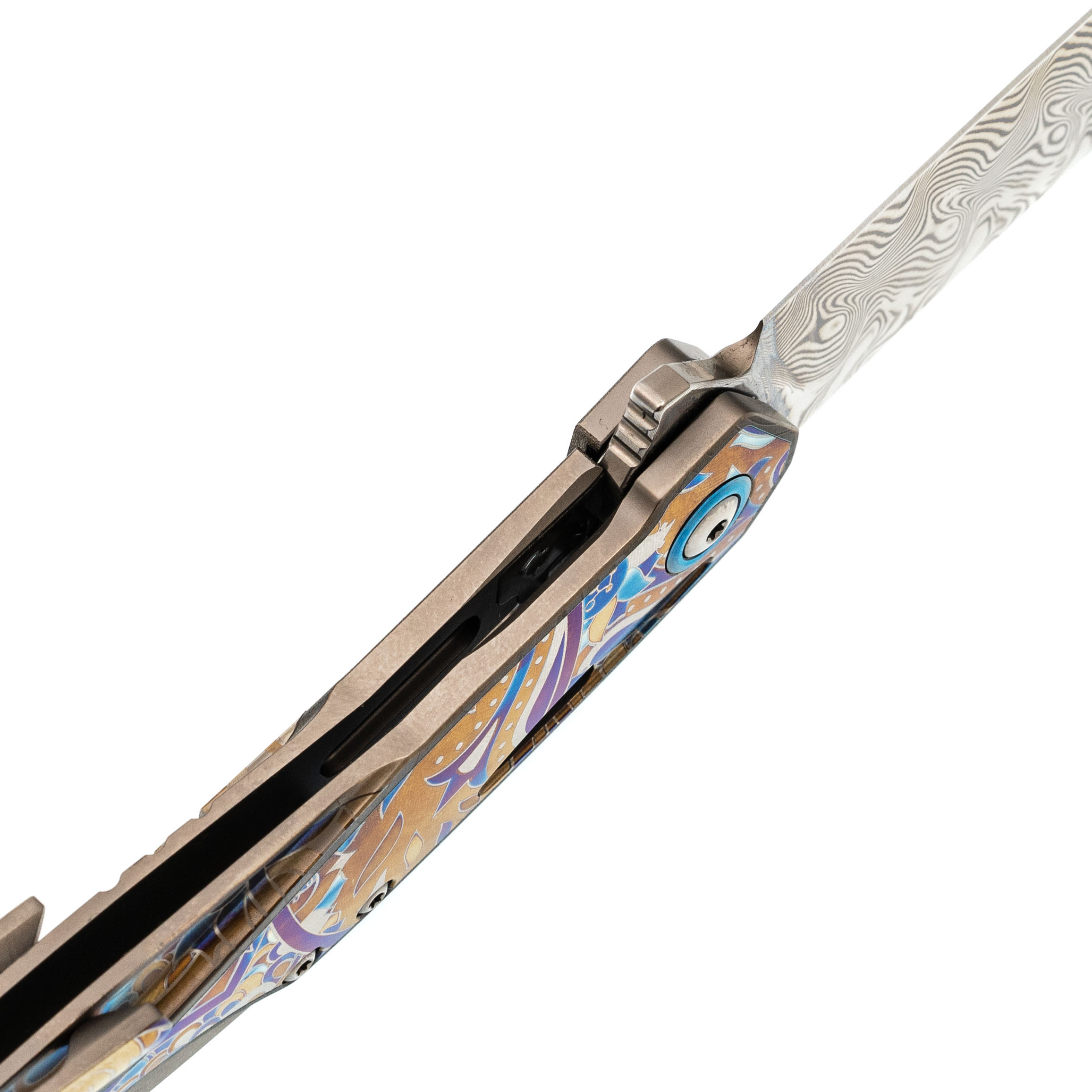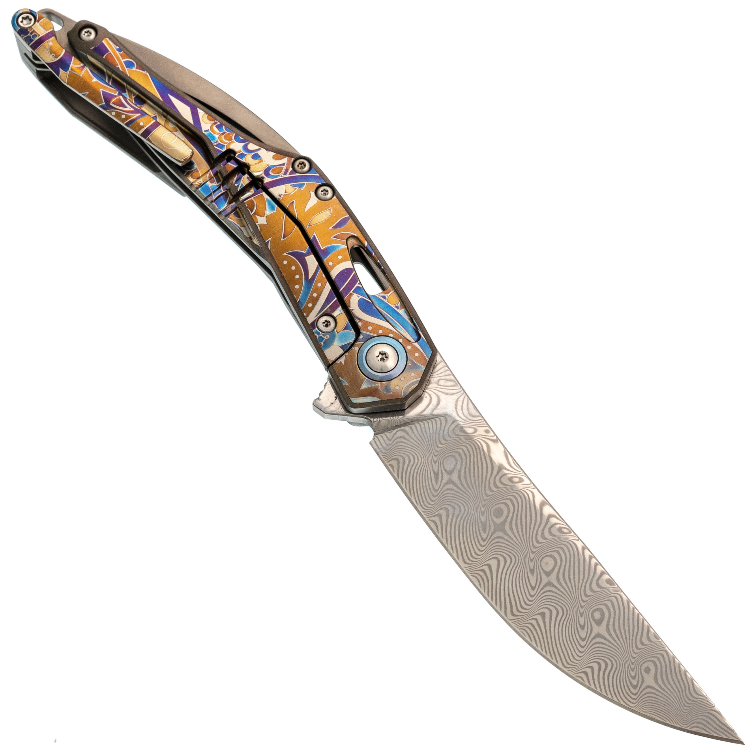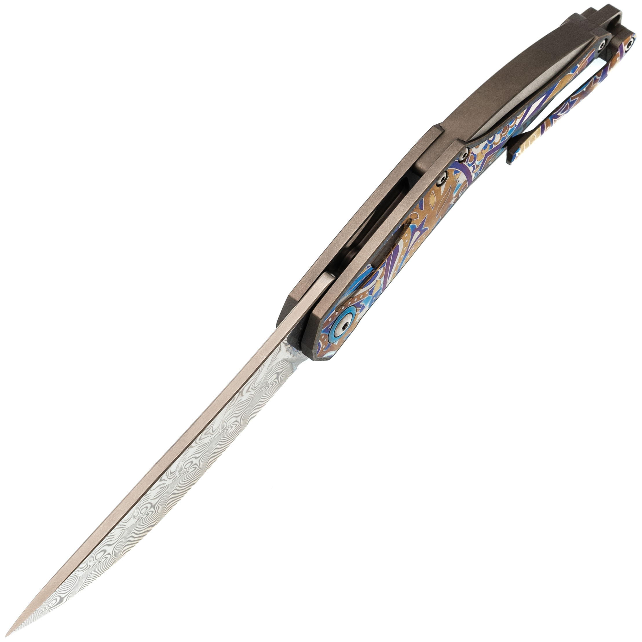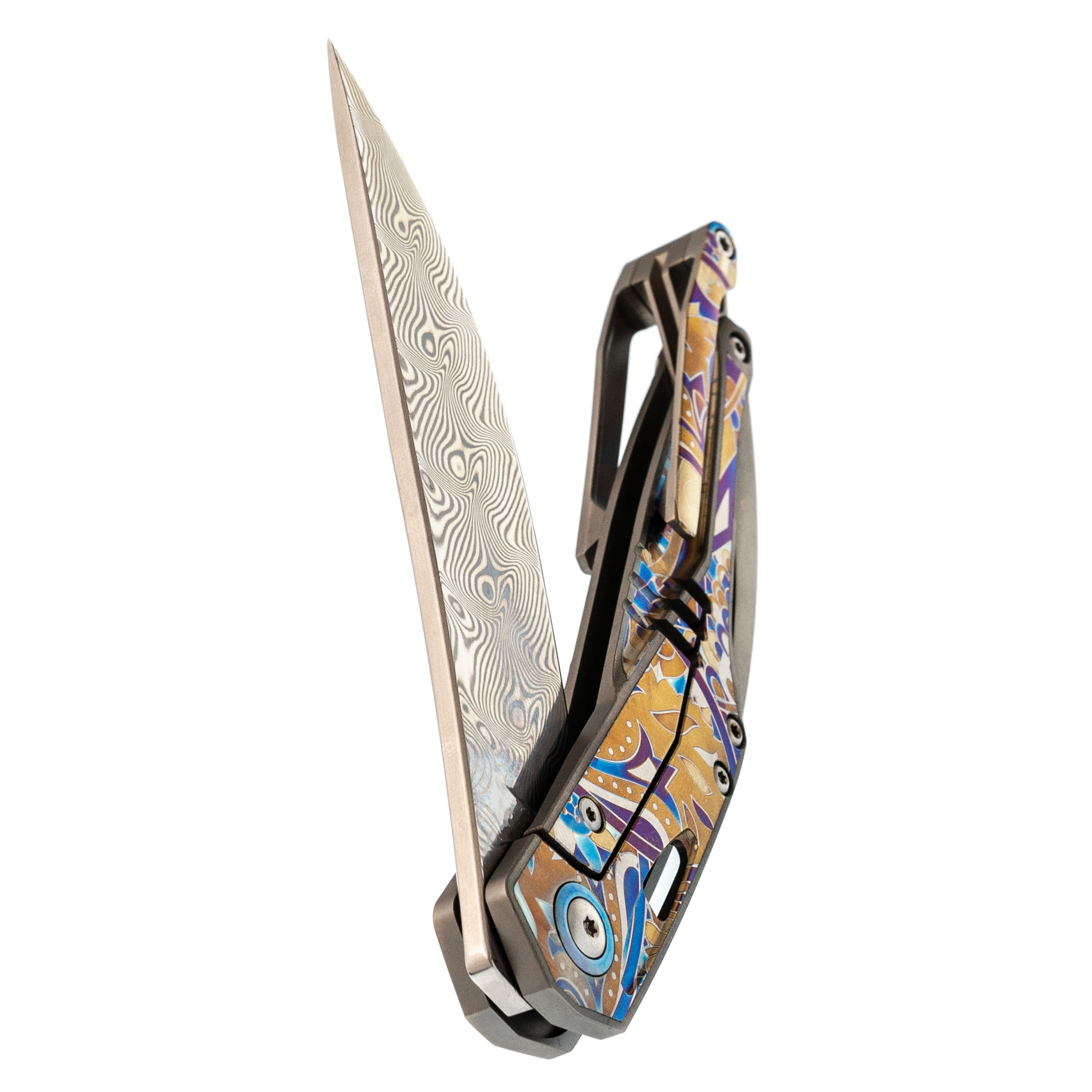 Изогнутая титановая рукоять удобно ложится в ладонь и не скользит. Облегчения и фрезеровка снижают вес, сохраняя прочность. Особое внимание заслуживает лазерная гравировка с узором - тонкая, многоцветная, она добавляет ножу изысканности и делает каждый экземпляр чуть особенным. Две клипсы позволяют закрепить нож так, как удобно именно вам - мелочь, которая в итоге решает многое.
