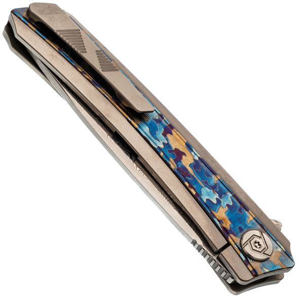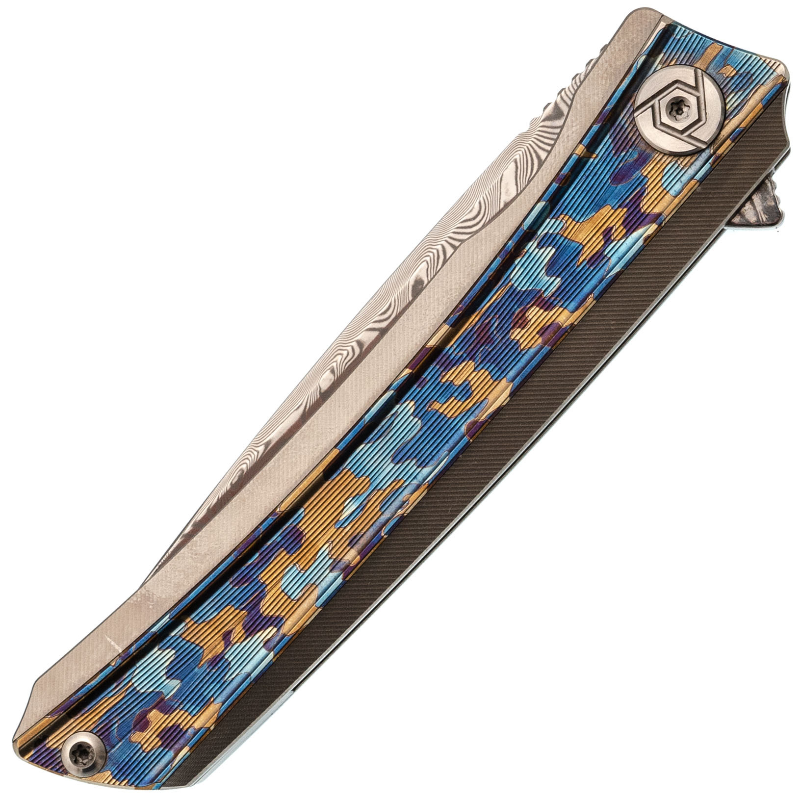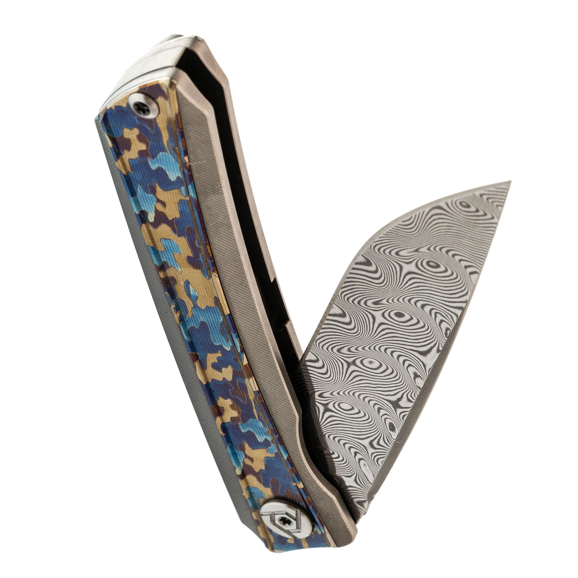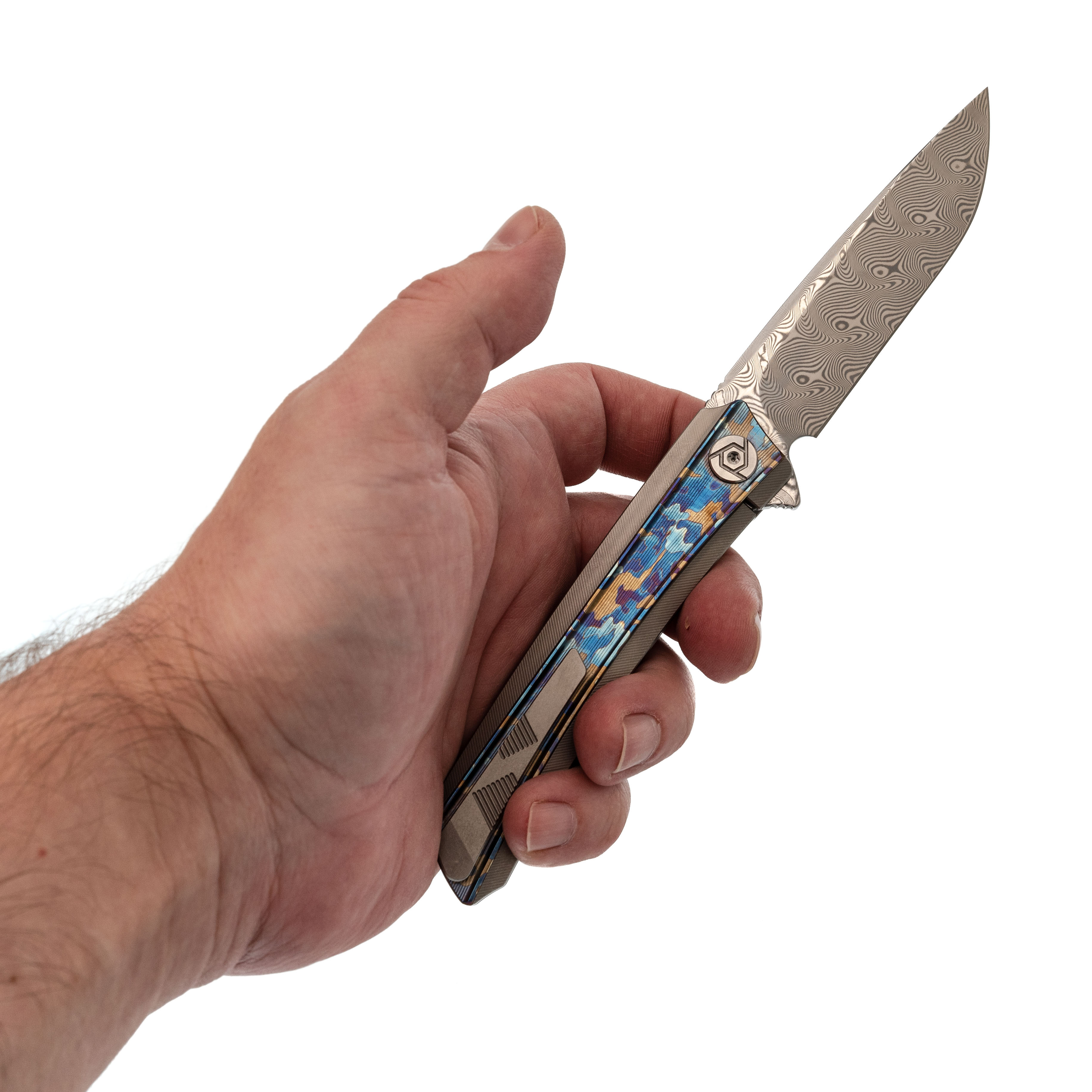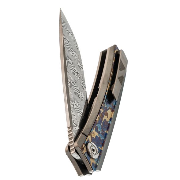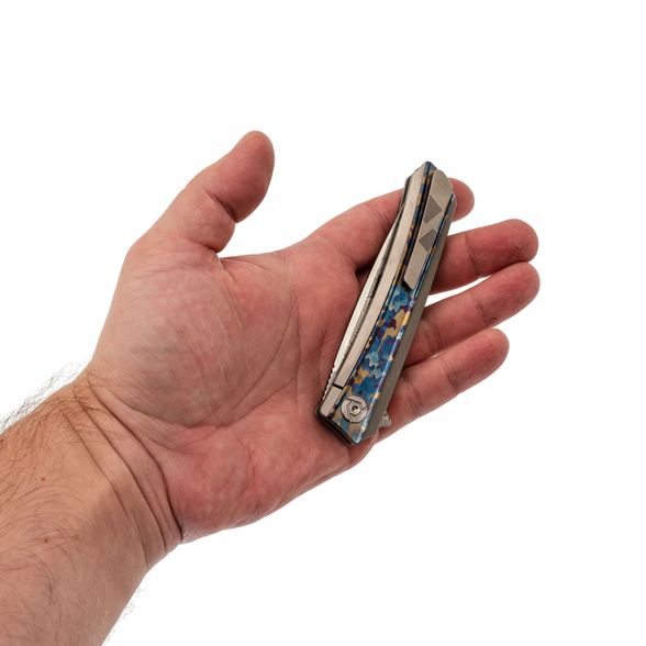 Титановая рукоять приятно ложится в ладонь, фрезеровка добавляет цепкости, а многоцветная лазерная гравировка с камуфляжем придаёт индивидуальность. Клипса аккуратная, держит уверенно - нож всегда под рукой, но не мешает в кармане.