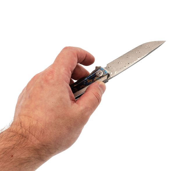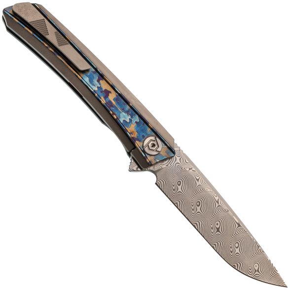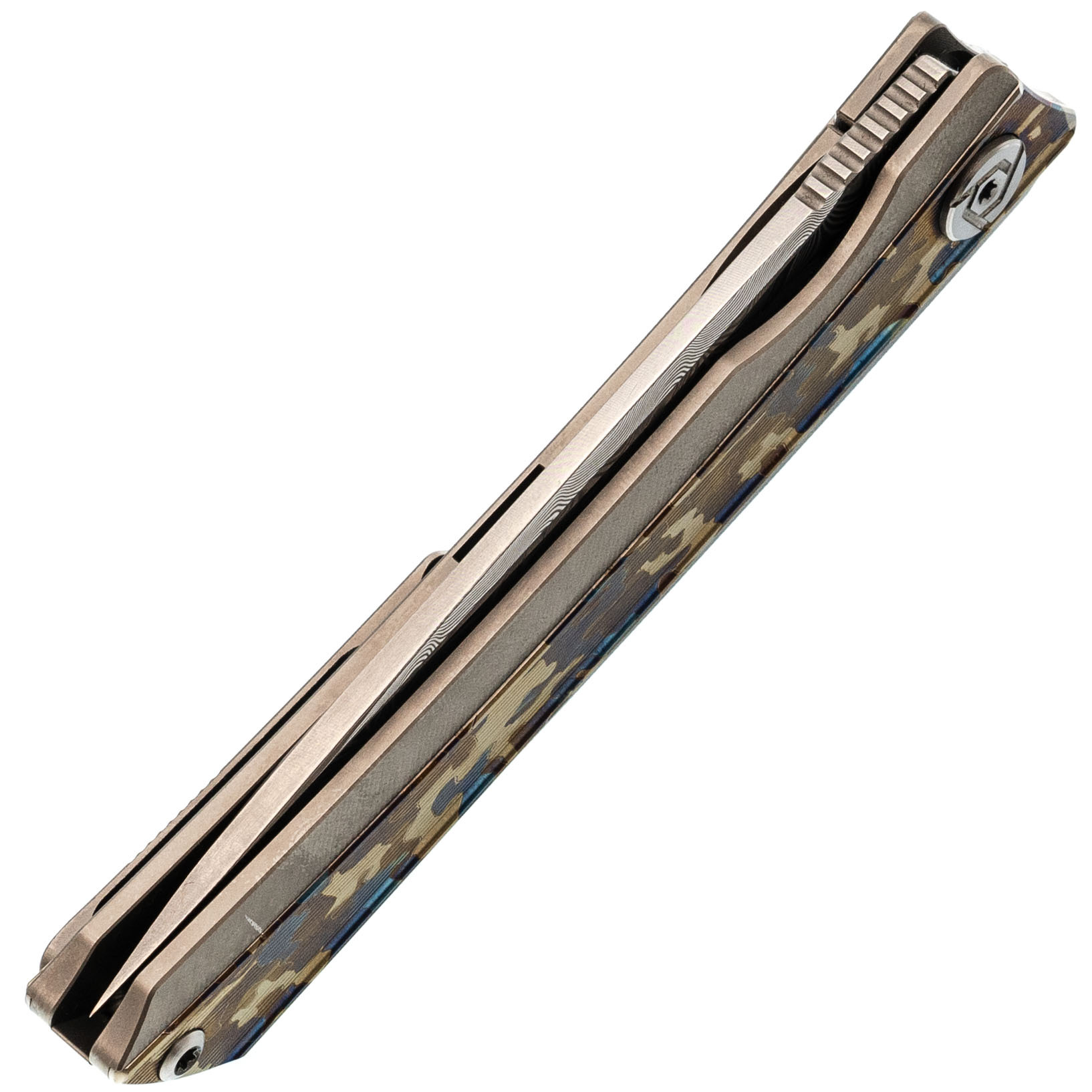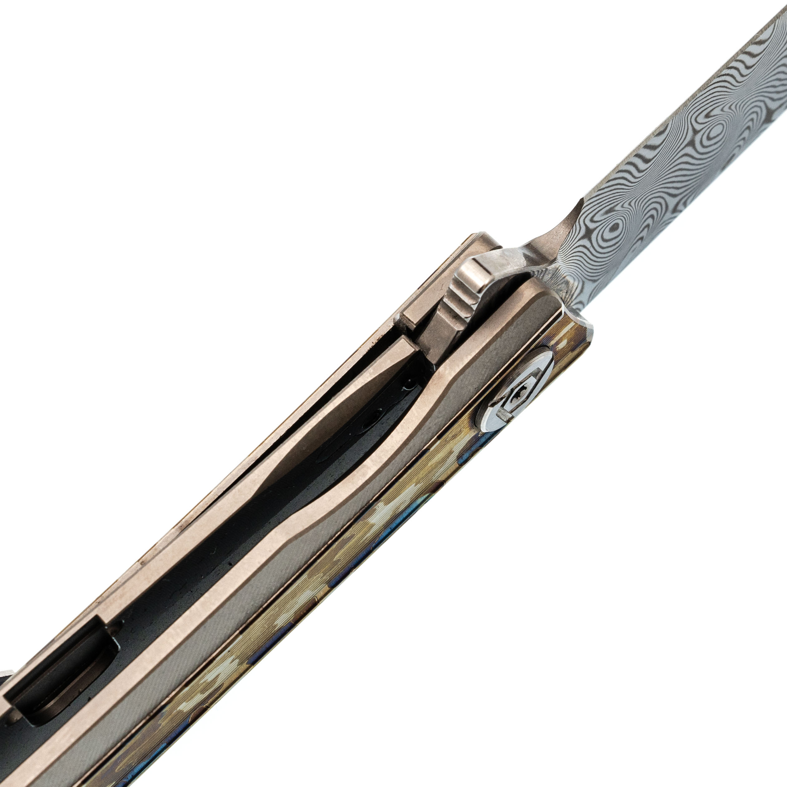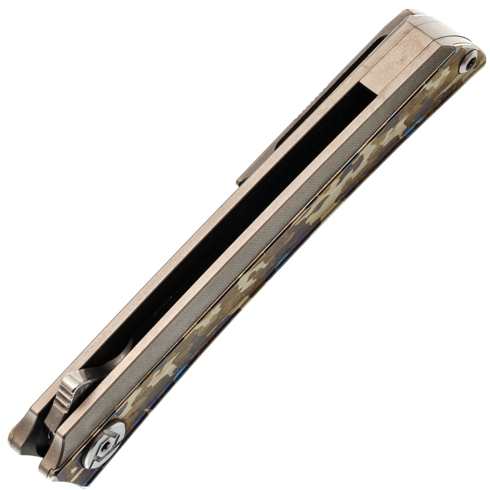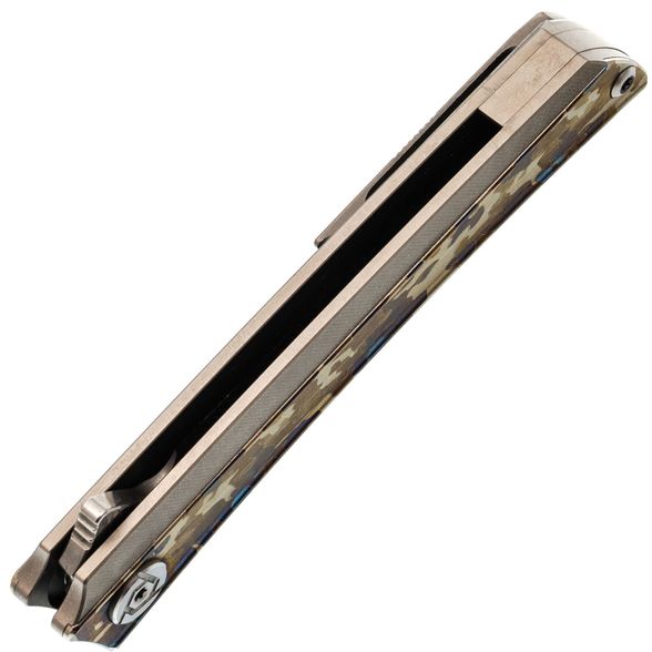 Титановая рукоять приятно ложится в ладонь, фрезеровка добавляет цепкости, а многоцветная лазерная гравировка с камуфляжем придаёт индивидуальность. Клипса аккуратная, держит уверенно - нож всегда под рукой, но не мешает в кармане.