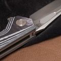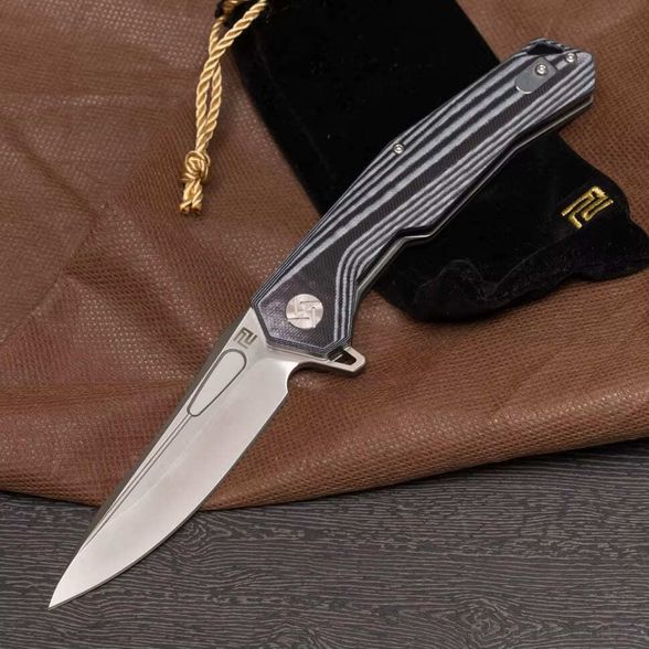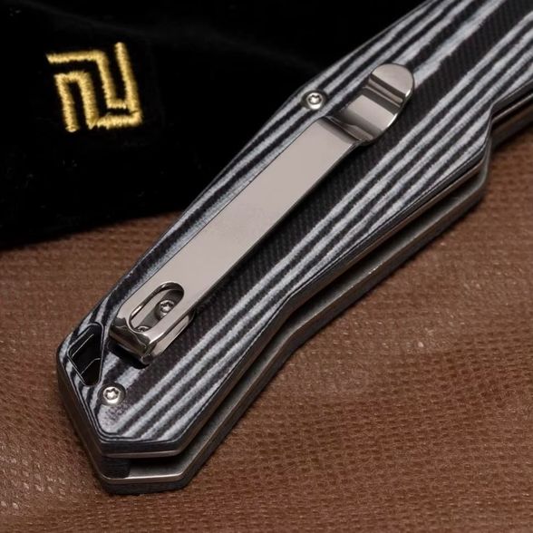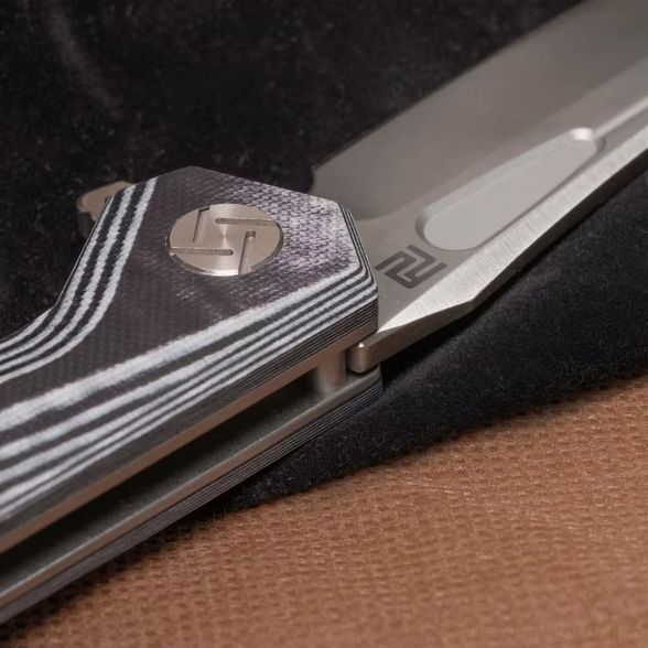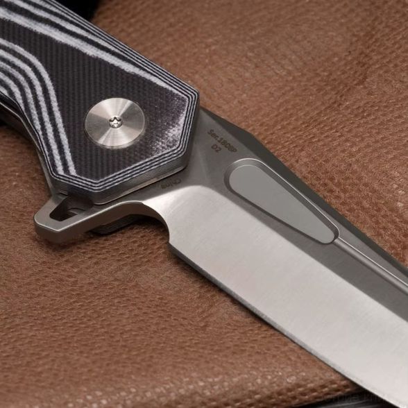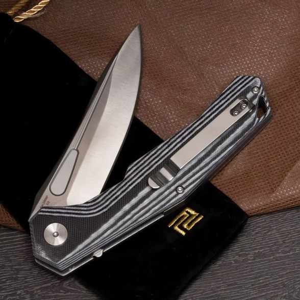 Artisan Zumwalt - это крупный нож с уникальным, футуристичным дизайном. Его внешний вид привлекает внимание сочетанием плавных линий и острых граней. Клинок изготовлен из инструментальной стали D2, обеспечивающей высокую твердость и отличную удерживаемость остроты. Геометрия ножа включает высокие прямые спуски и голомень, что обеспечивает оптимальный баланс между прочностью и резкостью. Рукоять изготовлена из многослойного материала G10 с черными и белыми слоями, придавая ей необычный и привлекательный вид. Замок Liner-Lock гарантирует надежную фиксацию клинка. Нож легко и быстро открывается благодаря керамическим подшипникам в осевом узле и флипперу, который служит механизмом открытия.