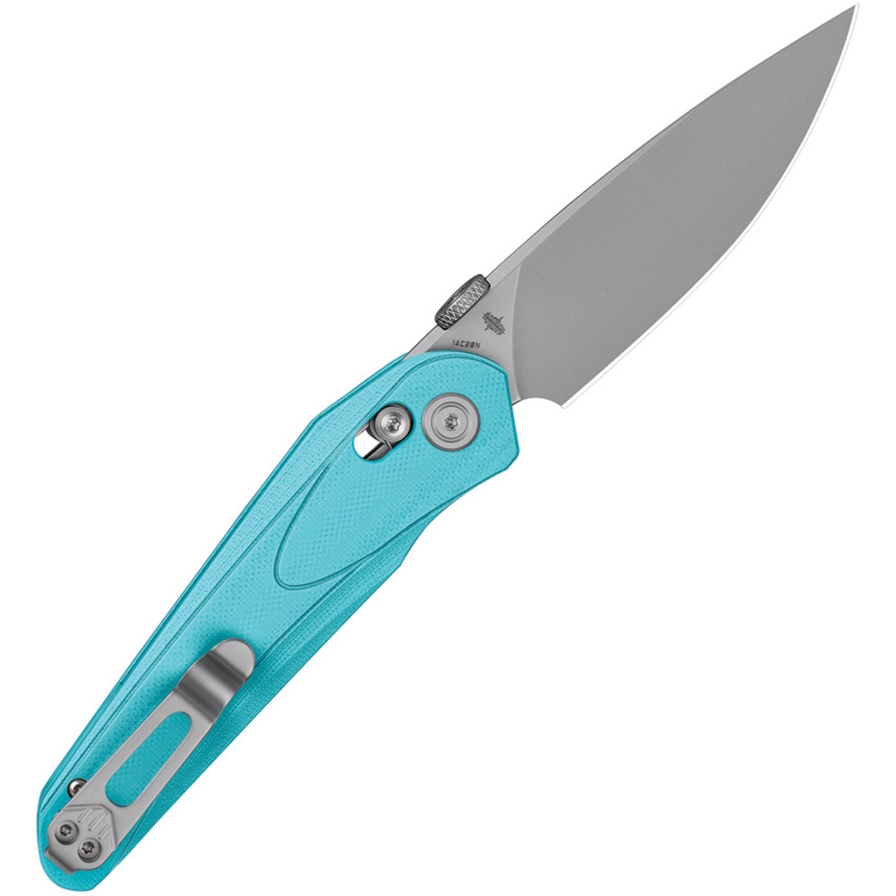 Рукоять цвета Tiffany Blue выполнена из G10 и отличается выраженной текстурой, обеспечивающей надёжный хват даже в условиях повышенной влажности. Анатомическая форма способствует комфортному удержанию, снижая нагрузку на кисть при длительном использовании. Конструкция продумана с учётом баланса между компактностью и удобством, а геометрия корпуса позволяет уверенно контролировать инструмент при работе. Цветовое решение подчёркивает сдержанную индивидуальность модели, оставаясь при этом практичным и уместным в любой обстановке.