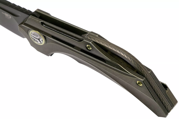 Lanyard Hole — отверстие или приспособление в рукояти ножа для страховочного корда или ремня., Titanium Pocket clip — титановая клипса для ношения ножа на поясе или кармане, Бэкспейсер из титанового сплава 6Al4V Titanium, Ограничитель хода фрейма, Система защиты от случайного открытия (Detent ball)
