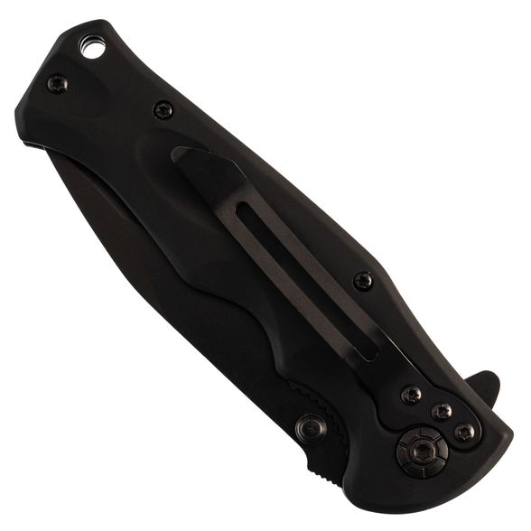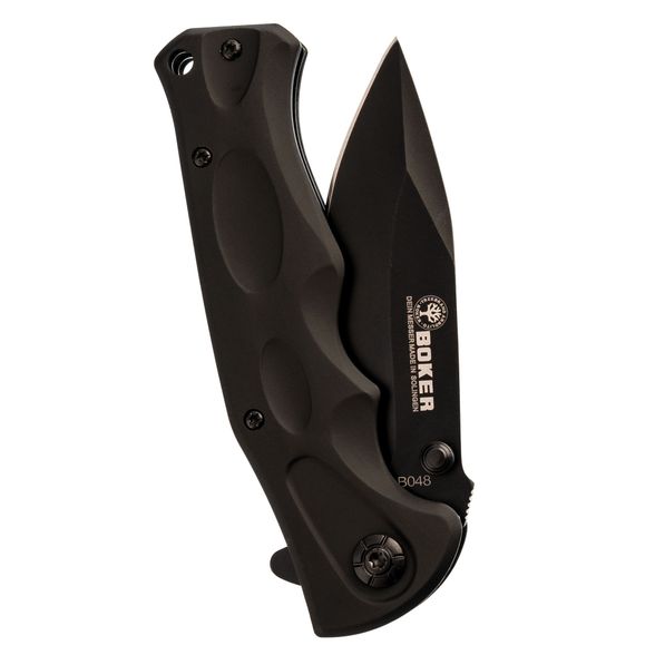 В конструкции изделия арт. B048 применена простая система выкидывания лезвия – Flipper, то есть есть плавник, надавив на который происходит открытие. Дополнительно предусмотрен шпенек для обеих рук. Производитель использовал шарнир из оси и фторопластовых шайб с двух сторон.