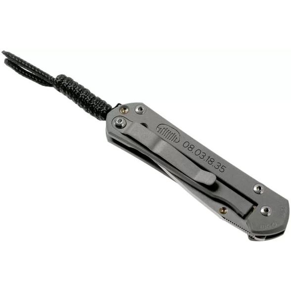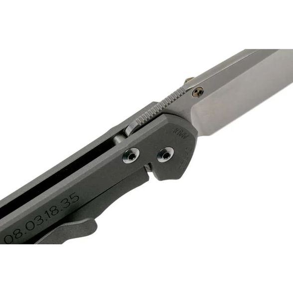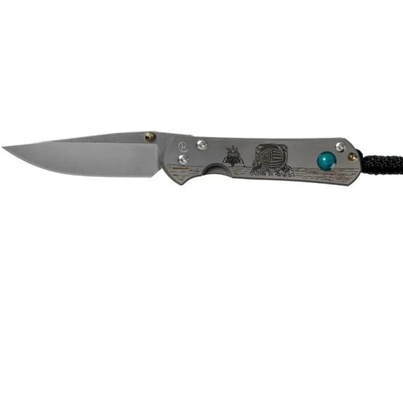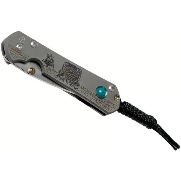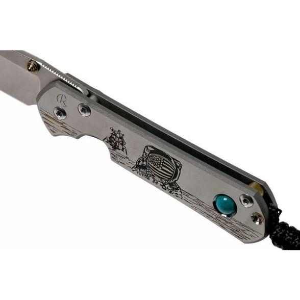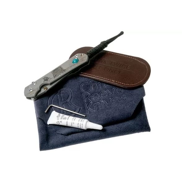 Lanyard Hole — отверстие или приспособление в рукояти ножа для страховочного корда или ремня., Titanium Pocket clip — титановая клипса для ношения ножа на поясе или кармане, Закаленный торец титанового фрейма, Рукоять ножа инкрустирована хризоколлой, обработанным методом кабошон, Система защиты от случайного открытия (Detent ball)