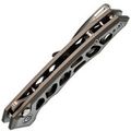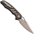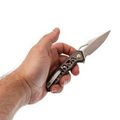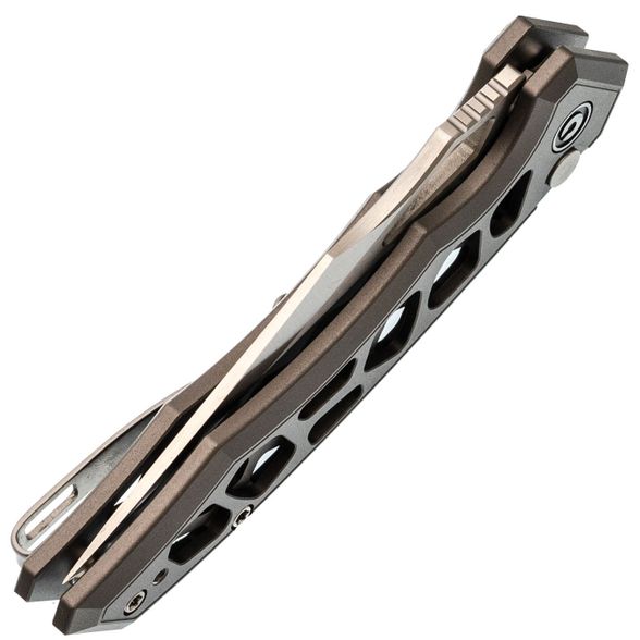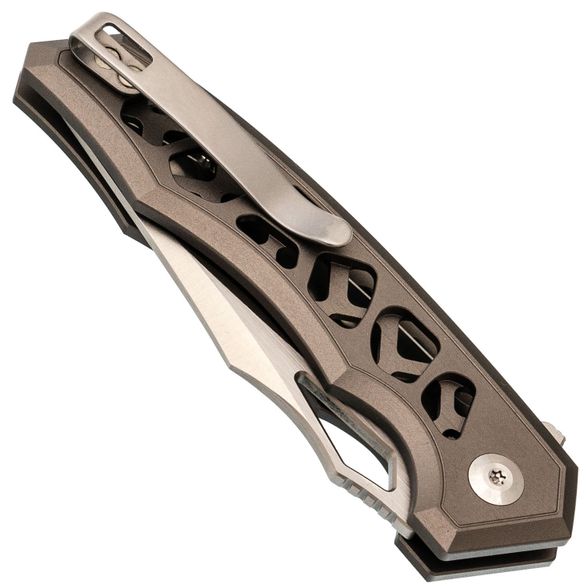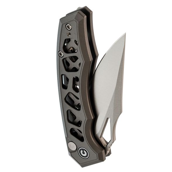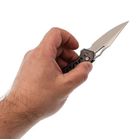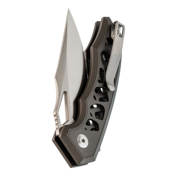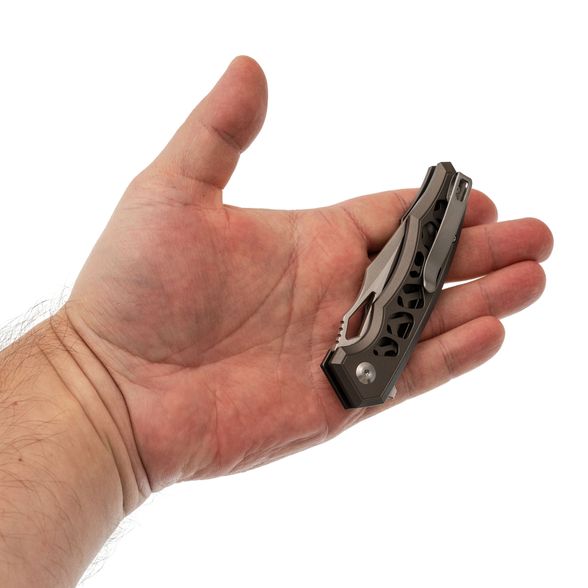 Рукоять изготовлена из прочного авиационного алюминия, анодированного в стильный серый цвет. Скелетированный дизайн не только добавляет визуальной лёгкости, но и снижает общий вес ножа. Эргономика продумана до мелочей - нож уверенно и удобно лежит в руке.