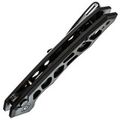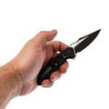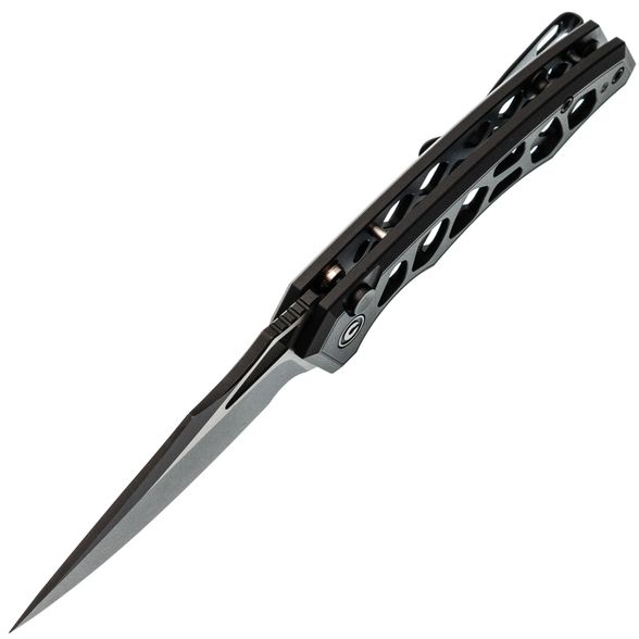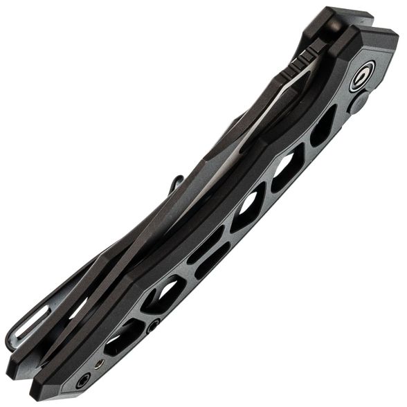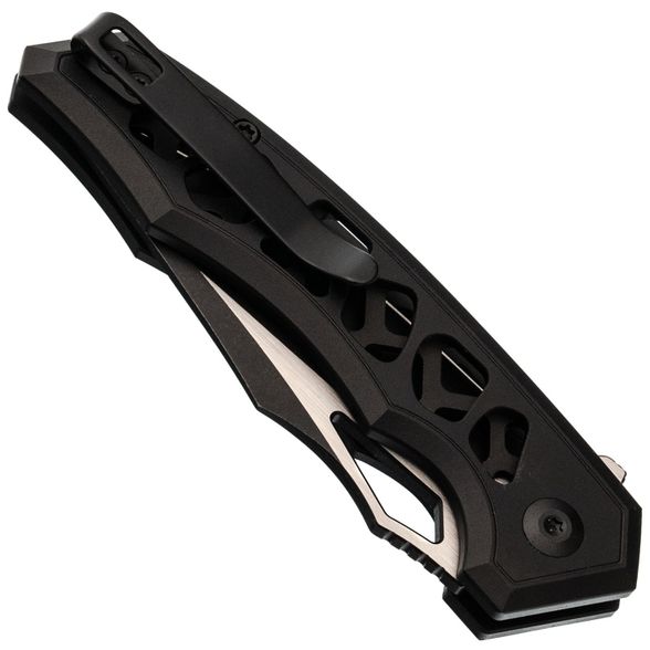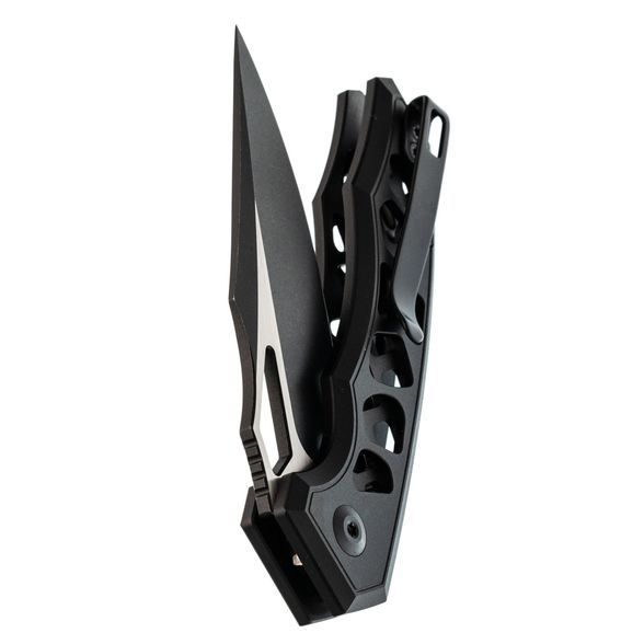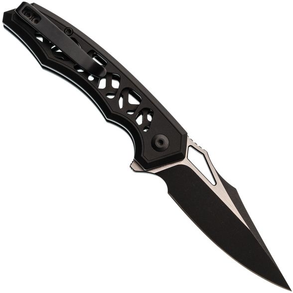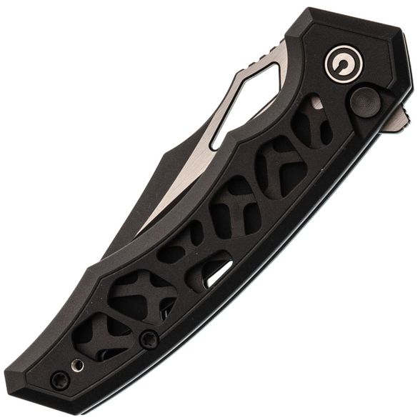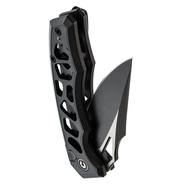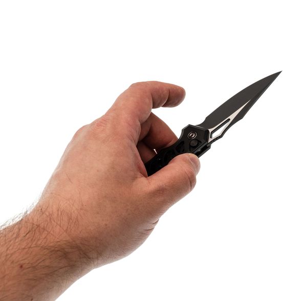Рукоять из прочного авиационного алюминия, анодированного в глубокий чёрный цвет, выделяется продуманной эргономикой и скелетированной конструкцией, что делает нож особенно лёгким - всего около 62 грамм. Она привлекает внимание своим индустриальным стилем и удобно ложится в ладонь.