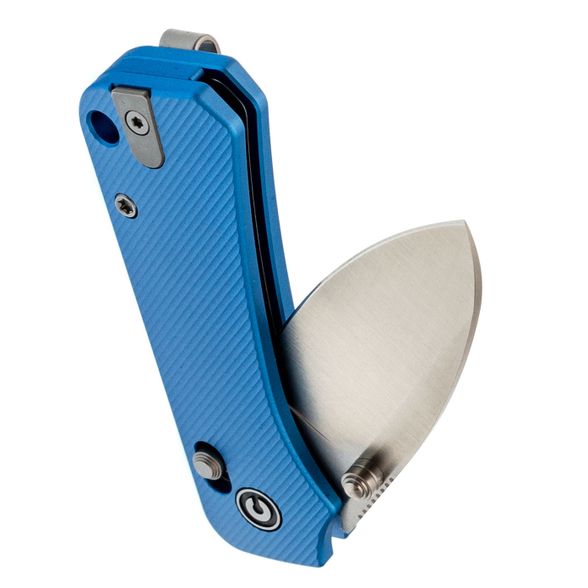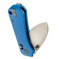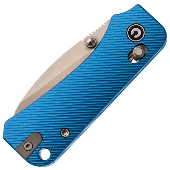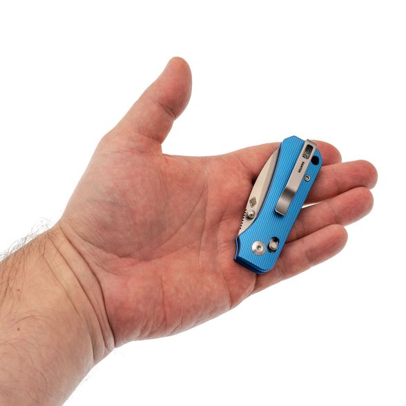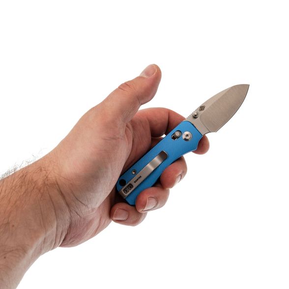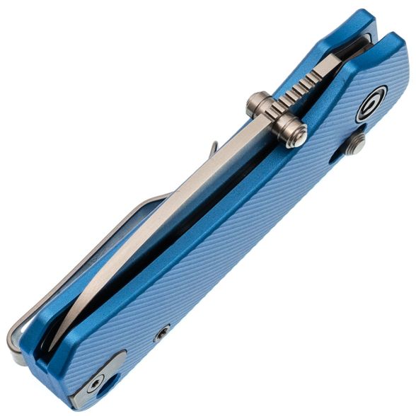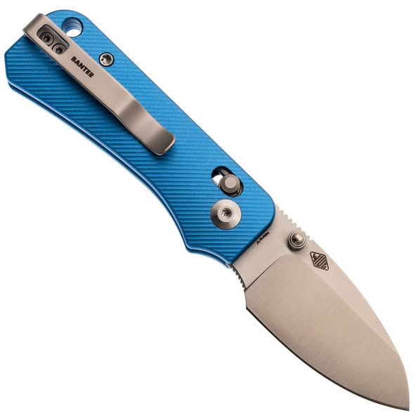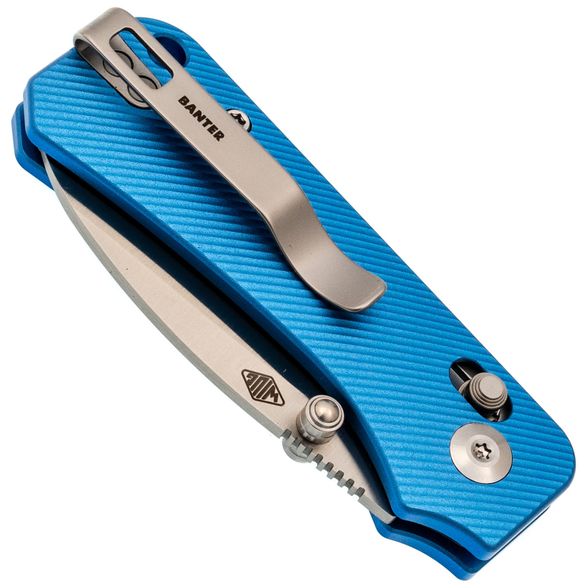 Рукоять ножа выполнена из анодированного алюминия ярко-синего цвета — это любимый цвет Ben Peterson, который отсылает к самым первым версиям Banter. Алюминий — это легкий и прочный материал, который обеспечивает долговечность и удобство использования. Поверхность рукояти имеет цепкую текстуру, предотвращающую скольжение в руке. Благодаря продуманному дизайну и крупному чойлу даже небольшой нож удобно лежит в руке, а Crossbar-Lock обеспечивает надежное и интуитивное управление одной рукой. Переставляемая карманная клипса и шпеньки делают нож удобным для правшей и левшей, а темлячное отверстие позволяет украсить модель или сделать хват удобнее с помощью темляка.