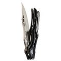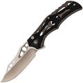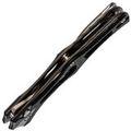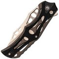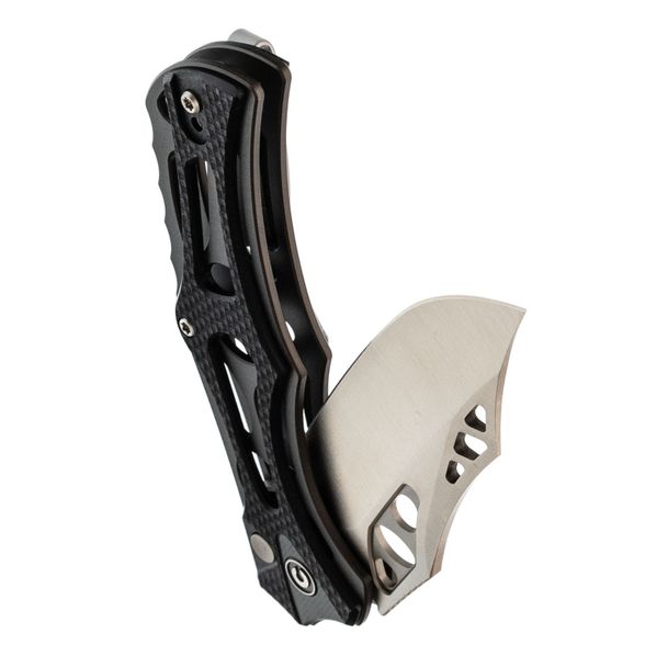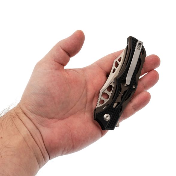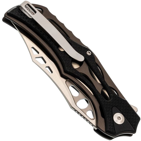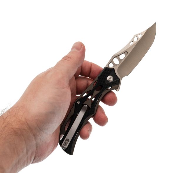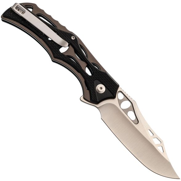Клинок выполнен из стали Nitro-V, которая обладает высокой прочностью, устойчивостью к коррозии и легко затачивается. Несмотря на декоративные элементы, форма клинка — классический Clip-Point, а вогнутые спуски обеспечивают хорошую проникающую способность. Для открытия ножа предусмотрены флиппер и отверстия в клинке, что позволяет выбрать удобный способ приведения в рабочее положение.