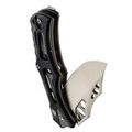 Рукоять изготовлена из алюминия и торцевого G10, что делает ее легкой, прочной и удобной. Алюминий придает конструкции жесткость, а G10 обеспечивает надежное сцепление благодаря своей текстуре. Нож оснащен замком Button-Lock, который надежно фиксирует клинок и позволяет безопасно закрывать его инерционным способом. Для удобного ношения предусмотрена карманная клипса, а одно из отверстий может использоваться для крепления темляка, хотя его назначение не до конца ясно.