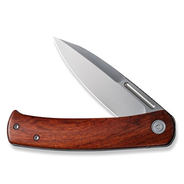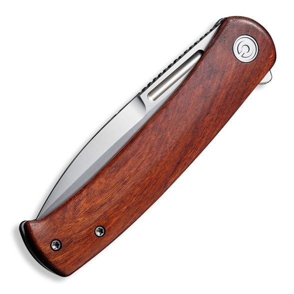 Классный нож от Сививи, качество исполнения на высоте, механика тоже очень приятная. Из того, на что стоит обратить внимание 1) рукоять довольно узкая, не под каждую руку зайдет; 2) "плавник" меньше чем на аналогичных ножах, требует более резкого нажатия для выброса клинка. В остальном отличный нож, в дереве смотрится супер