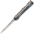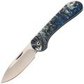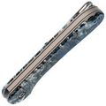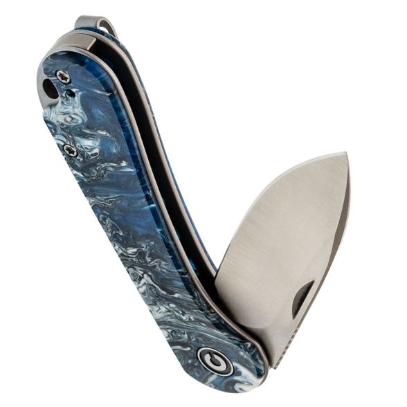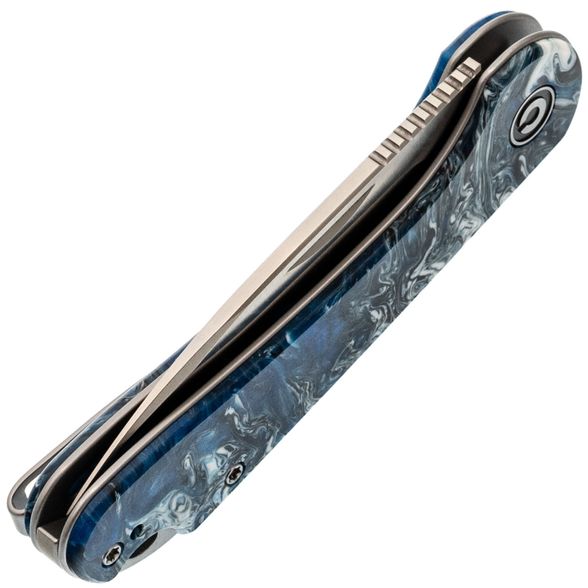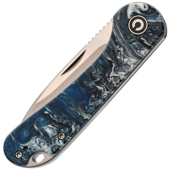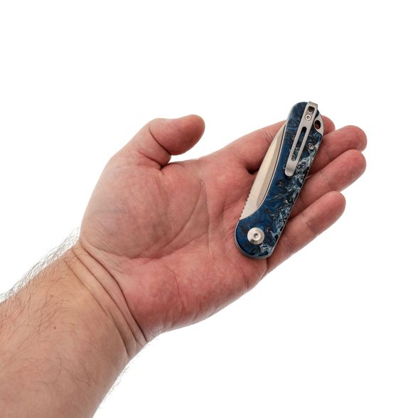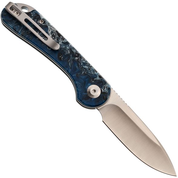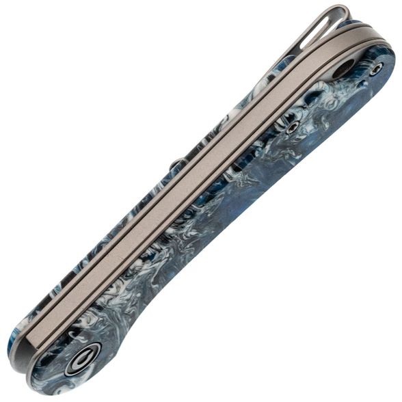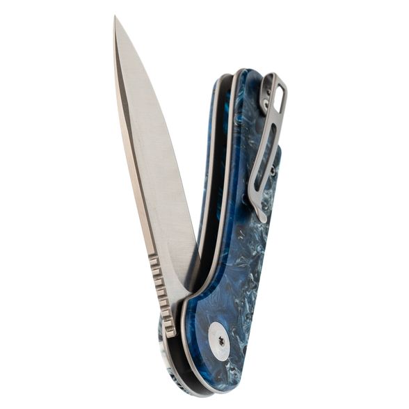 Рукоять изготовлена из эпоксидной смолы с добавлением красителей, благодаря чему материал надёжен и устойчив к воздействию воды и резким перепадам температур. Неровное распределение синих и белых красителей создаёт текстуру, напоминающую морские волны, что придаёт рукояти особый характер без излишеств. Эргономичная форма, дополненная наличием клипсы для ношения и темлячного отверстия, делает нож удобным для переноски и использования в любых условиях.