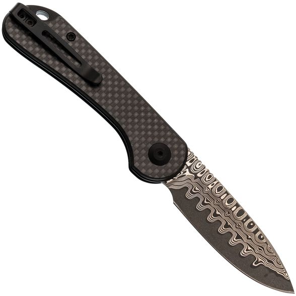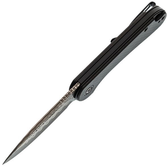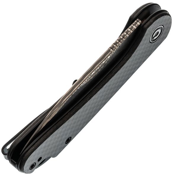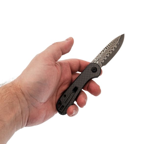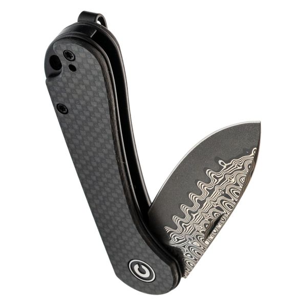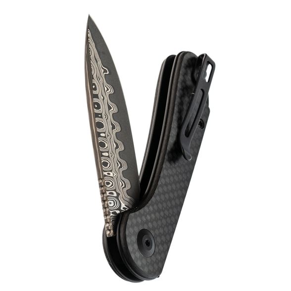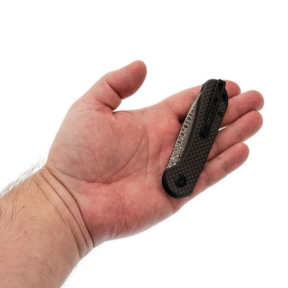 Рукоять этого ножа изготовлена из прочного карбона, что гарантирует легкость и высокую износостойкость. Её выверенная нейтральная форма обеспечивает удобство использования для большинства пользователей. Для ношения нож оснащён удобной карманной клипсой, а наличие темлячного отверстия позволяет украсить изделие стильным темляком.