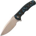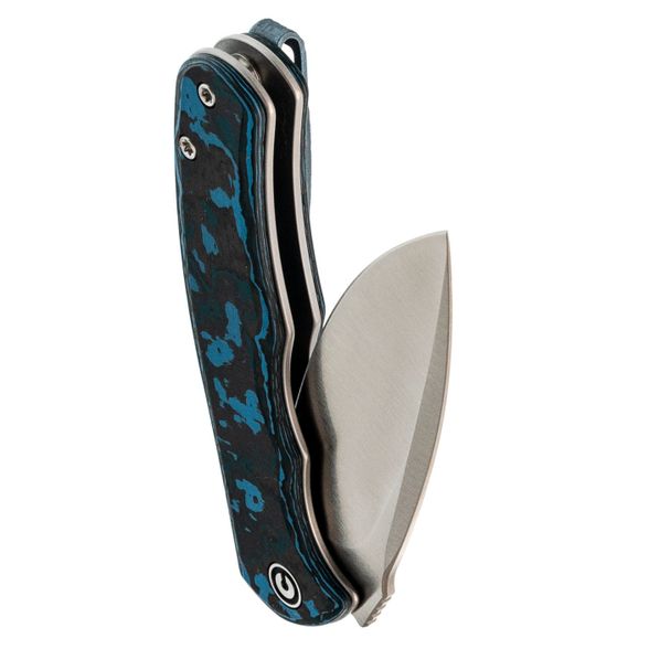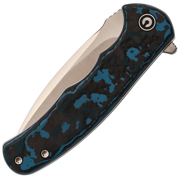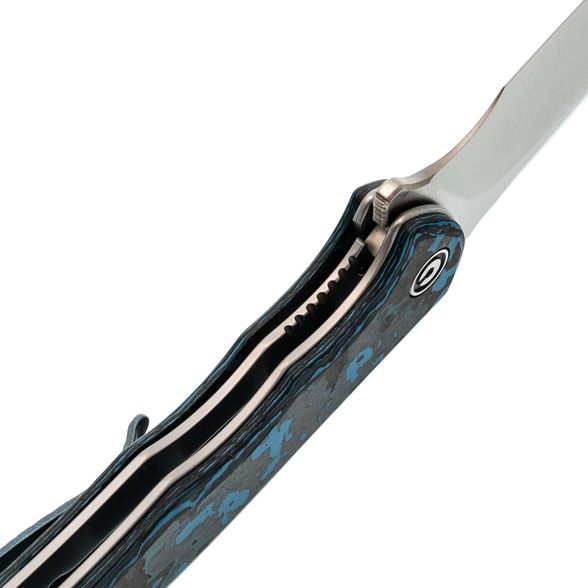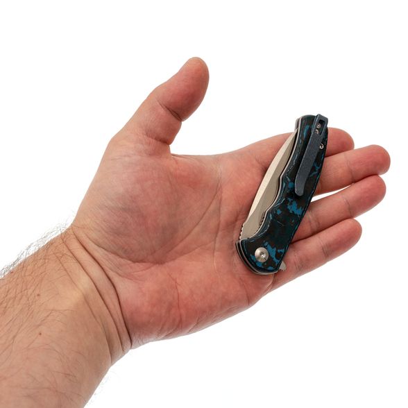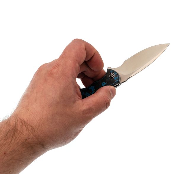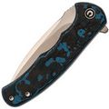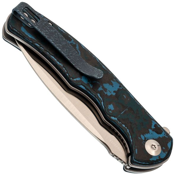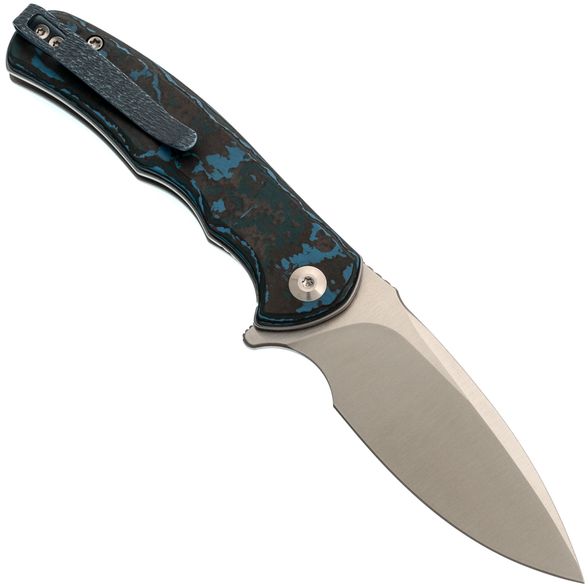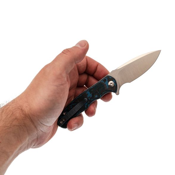 - Рукоять: карбон Fat Carbon с хаотичным узором из синего, чёрного, серого и зелёного цветов — каждый нож уникален, рисунок накладок не повторяется.