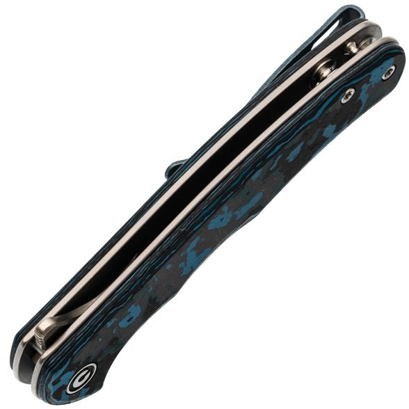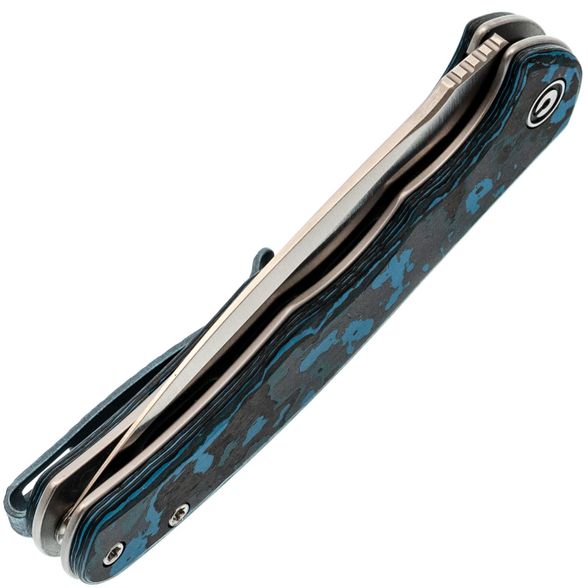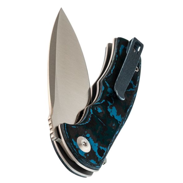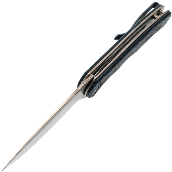 - Клипса: титан с анодированием в синий цвет и фактурой под древесную кору — лёгкая, прочная и визуально дополняет рукоять.