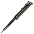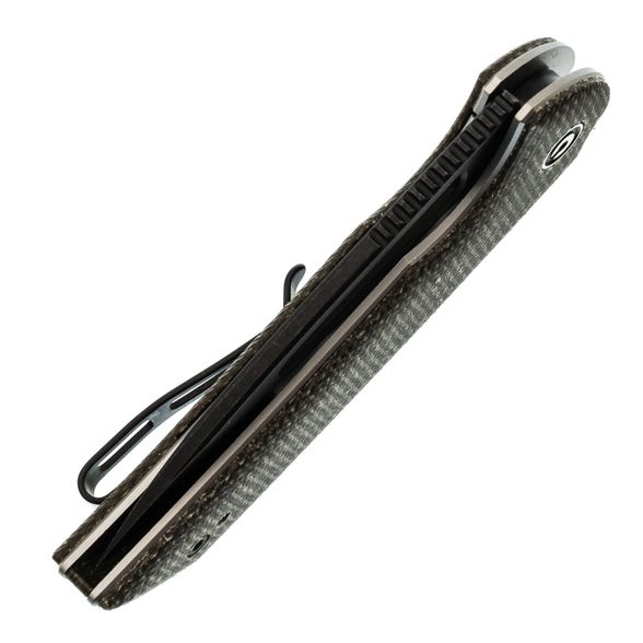 Флиппер и отверстие для большого пальца с бронзовыми поворотными шайбами; текстурированные и контурные темно-зеленые чешуйки рукояти из микарты.