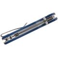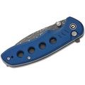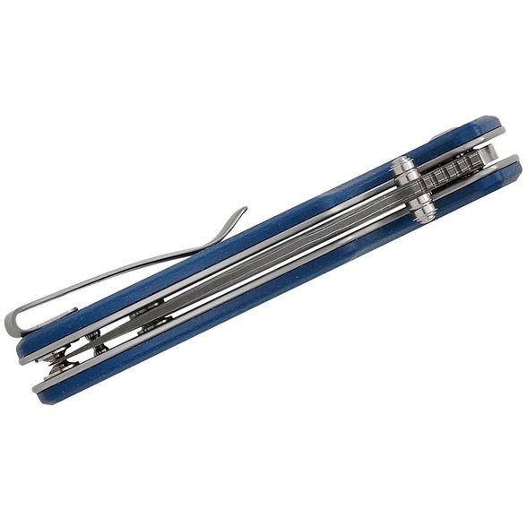 Синяя микарта выделяет нож среди других, а её рельефная текстура и продуманная форма гарантируют уверенный хват. Отверстия в рукояти снижают общий вес, добавляя оригинальности внешнему виду. Подпальцевая выемка и плавные линии способствуют точному контролю в работе. Надёжный кнопочный замок предотвращает случайные открытия и легко управляется одной рукой.