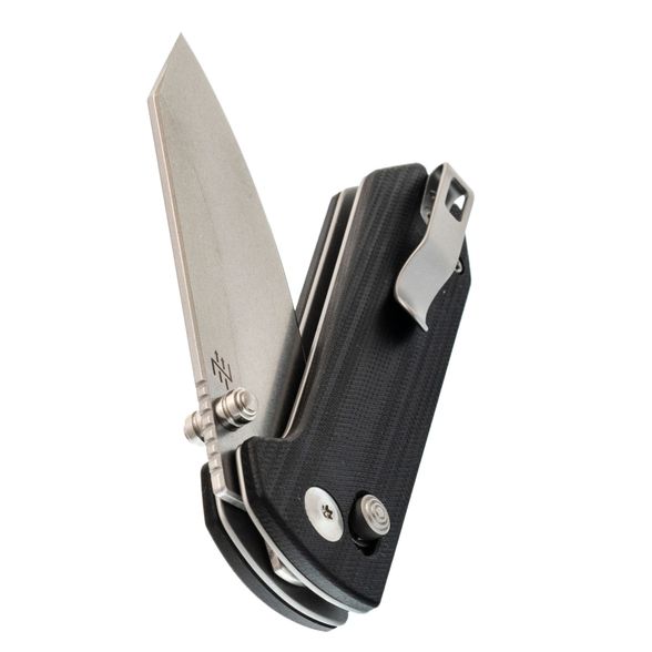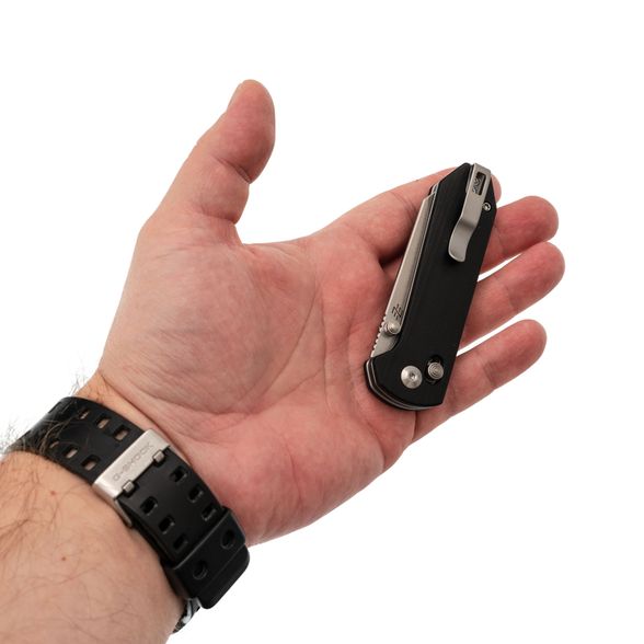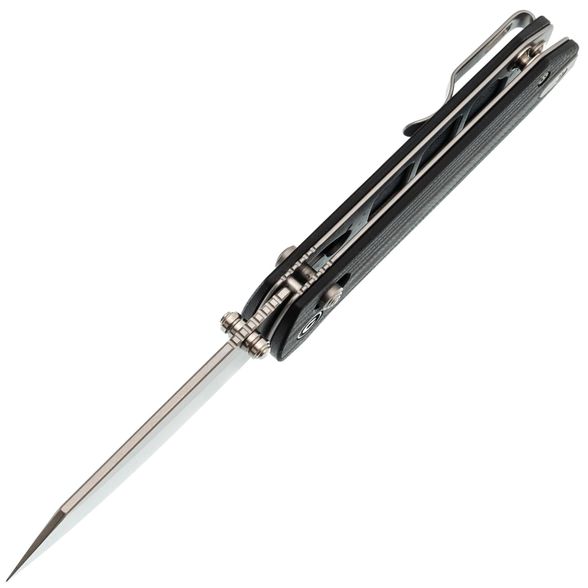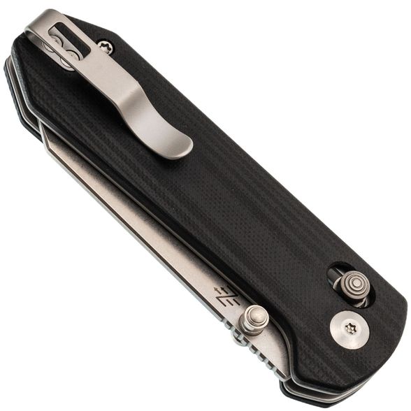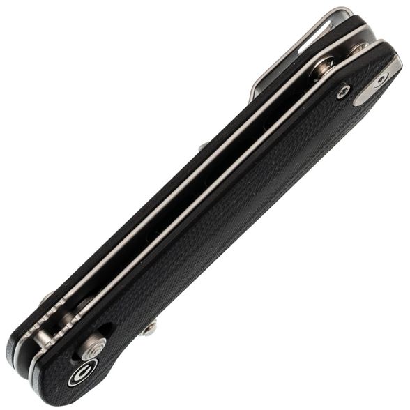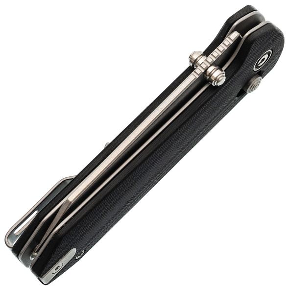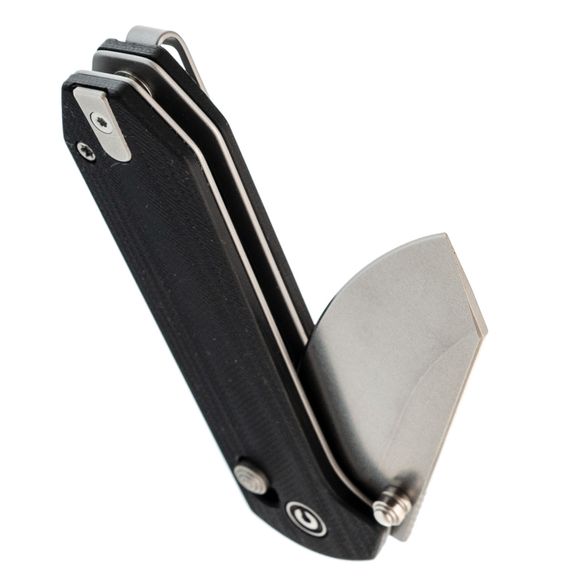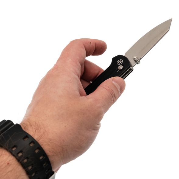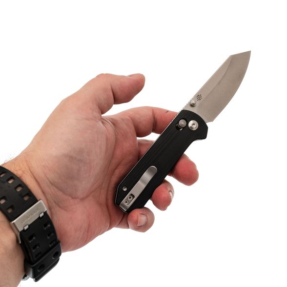 Рукоять имеет компактные размеры и универсальную форму, подходящую для разных размеров рук. Она изготовлена из G10 - стеклотекстолита, известного своей прочностью, устойчивостью к выцветанию и влагостойкостью. Этот материал обеспечивает надежный и комфортный хват. Рукоять оснащена переставляемой клипсой, позволяющей носить нож в разных положениях, что удобно для левшей и правшей. Органы управления ножом дублируются с обеих сторон, что также делает нож универсальным для пользователей с любой ведущей рукой. Такой дизайн так же позволяет удобно и быстро открывать и закрывать нож одной рукой.
