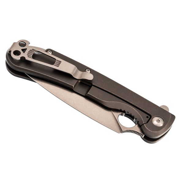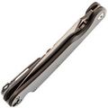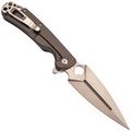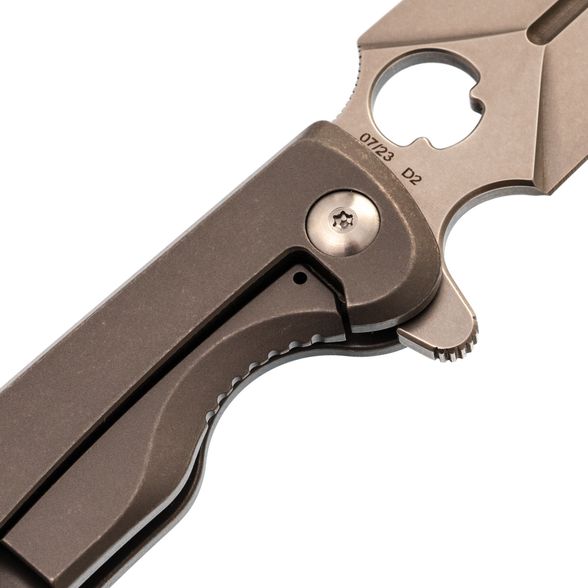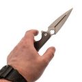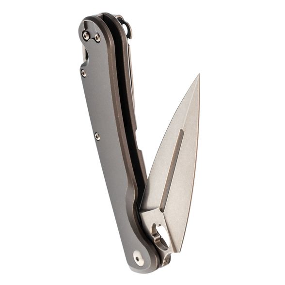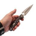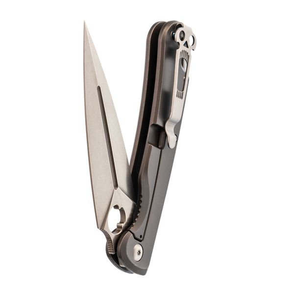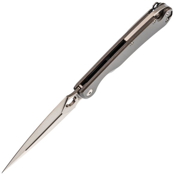 Dagger Arrow Gray - мощный и стильный, идеально подходящий для любителей складных ножей с характером. Клинок имеет брутальную кинжальную форму, обеспечивающую великолепную проникающую способность, и выполнен из марки стали D2 с длиной 99 мм. Общая длина ножа составляет 219 мм. Толщина обуха составляет 3.1 мм, а твердость стали 59-60 HRC. Вес ножа составляет 167 грамм, что делает его внушительным, но не запредельно тяжелым в виду рукояти из стали. Клинок обработан методом Stone Wash, что делает его практически невосприимчивым к царапинам.