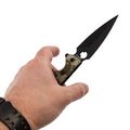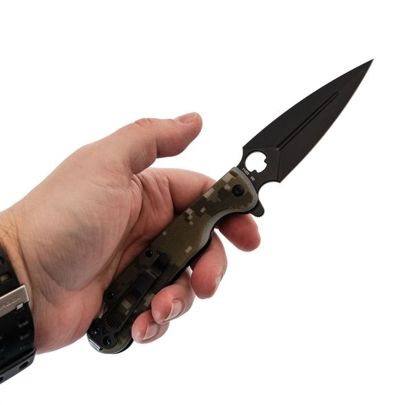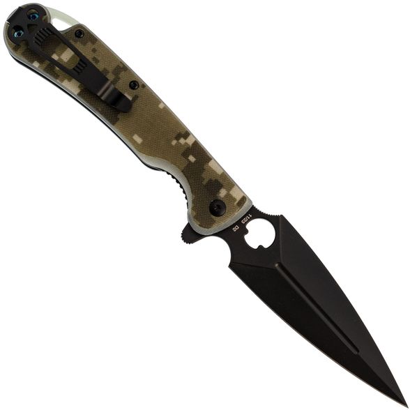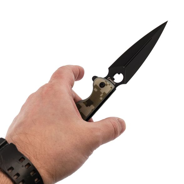 Складной нож Daggerr Arrow выделяется благодаря кинжальной форме клинка, которая придает ему выдающуюся проникающую способность, в то время как деликатное острие обеспечивает аккуратные надрезы. Тактически профилированный клинок длиной 99 мм, выполнен из прочной инструментальной стали D2, известной своей удивительной способностью долго держать заточку и агрессивностью при резе. Алмазоподобное покрытие DLC на клинке не только придает ножу воинственный вид, но и служит надежной защитой от коррозии, позволяя сохранить исключительное качество лезвия даже при самых суровых условиях эксплуатации.