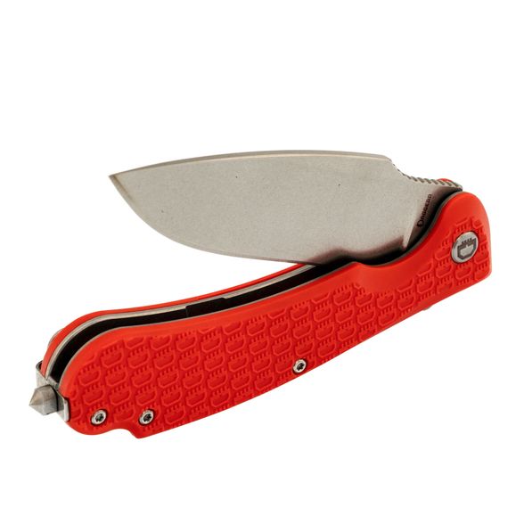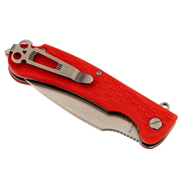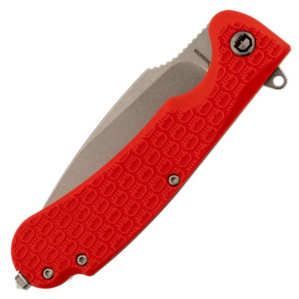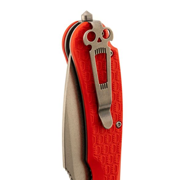 Рукоять ножа обладает универсальной формой, идеально подходящей для рук любого размера. Накладки из прочного и легкого термопластика FRN имеют текстуру в виде черепков Daggerr, что не только придает ножу стильный вид, но также повышает цепкость при использовании. Клипса глубокой посадки позволяет удобно закрепить нож на одежде или снаряжении. Дополнительным функциональным элементом является стеклобой - он может быть использован как куботан. В целом, эта рукоять сочетает в себе эргономичность, прочность и функциональность для комфортного использования в различных условиях.