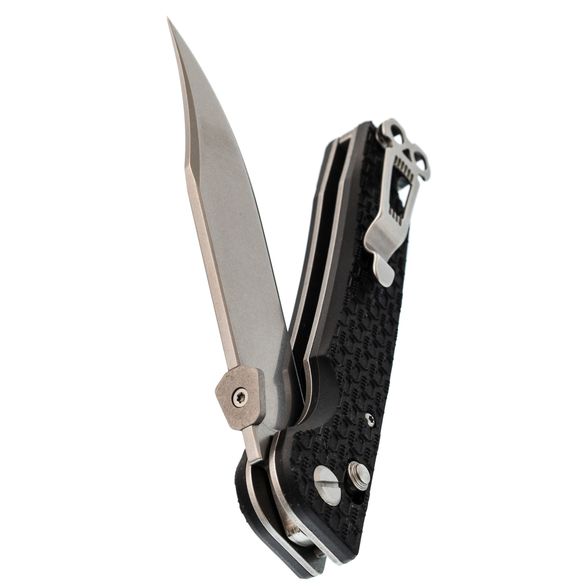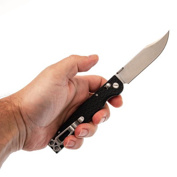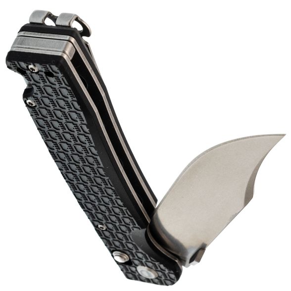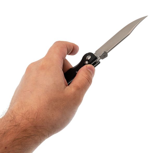 Клинок выполнен в профиле Bowie, что обеспечивает универсальность: он одинаково удобен для контролируемого реза и более требовательных операций. Толщина обуха 3,2 мм повышает жесткость конструкции, а обработка Stonewash придает поверхности матовый вид, эффективно скрывая следы эксплуатации и подчеркивая рабочий характер изделия.