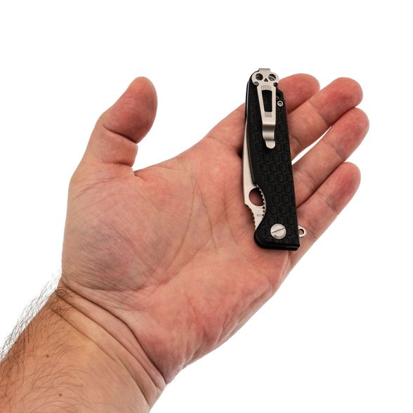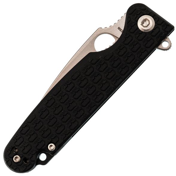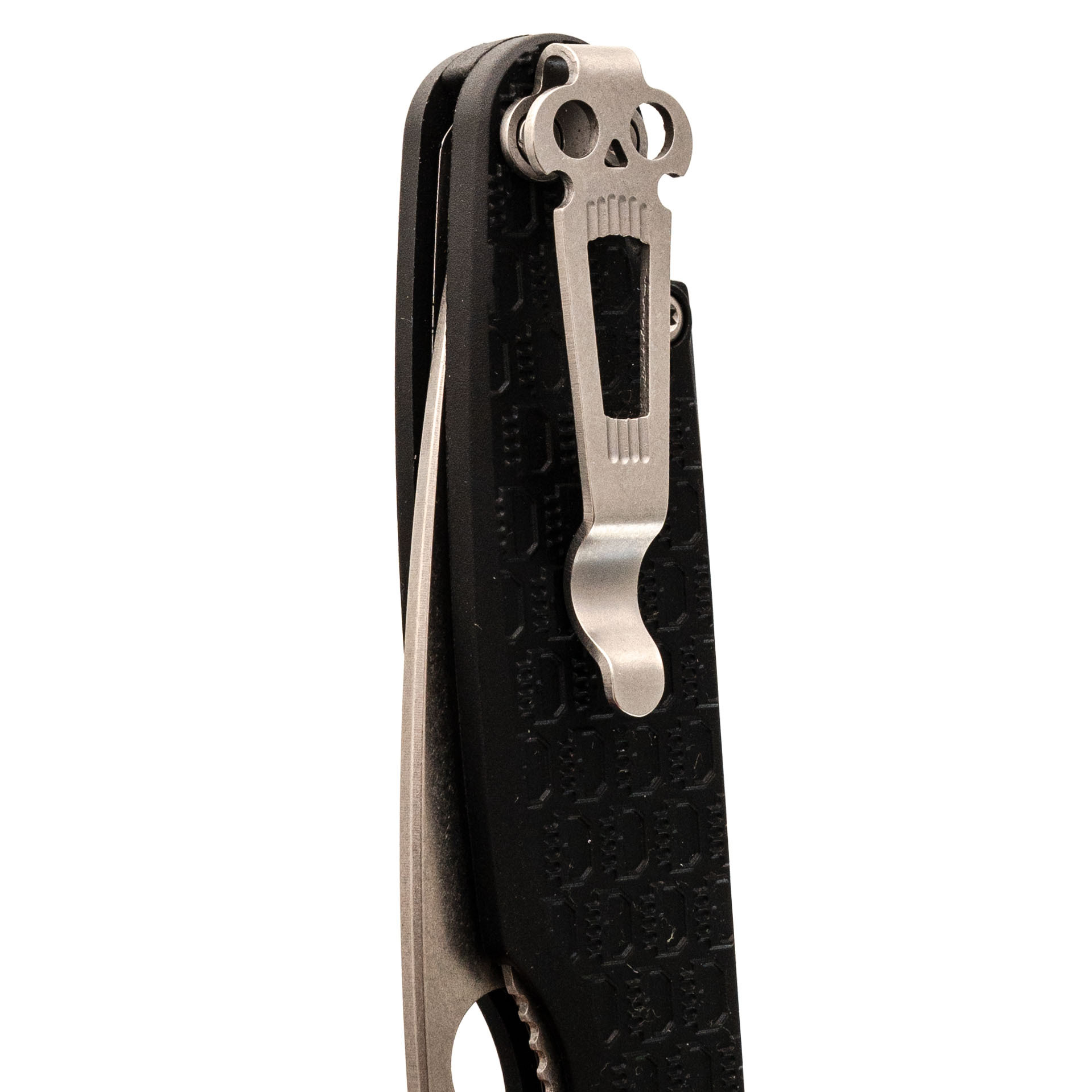 Рукоять Piranha спроектирована с максимальной эргономичностью. Лайнеры из стали придают конструкции прочность, а накладки из термопластика с текстурой обеспечивают комфортный захват. Замок Liner-Lock надежно фиксирует клинок в открытом положении. Темлячное отверстие и клипса с черепом делают этот нож не только практичным, но и стильным аксессуаром.