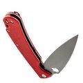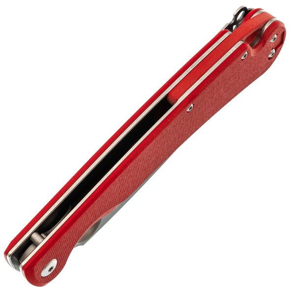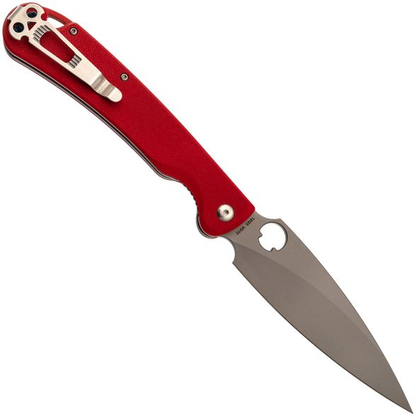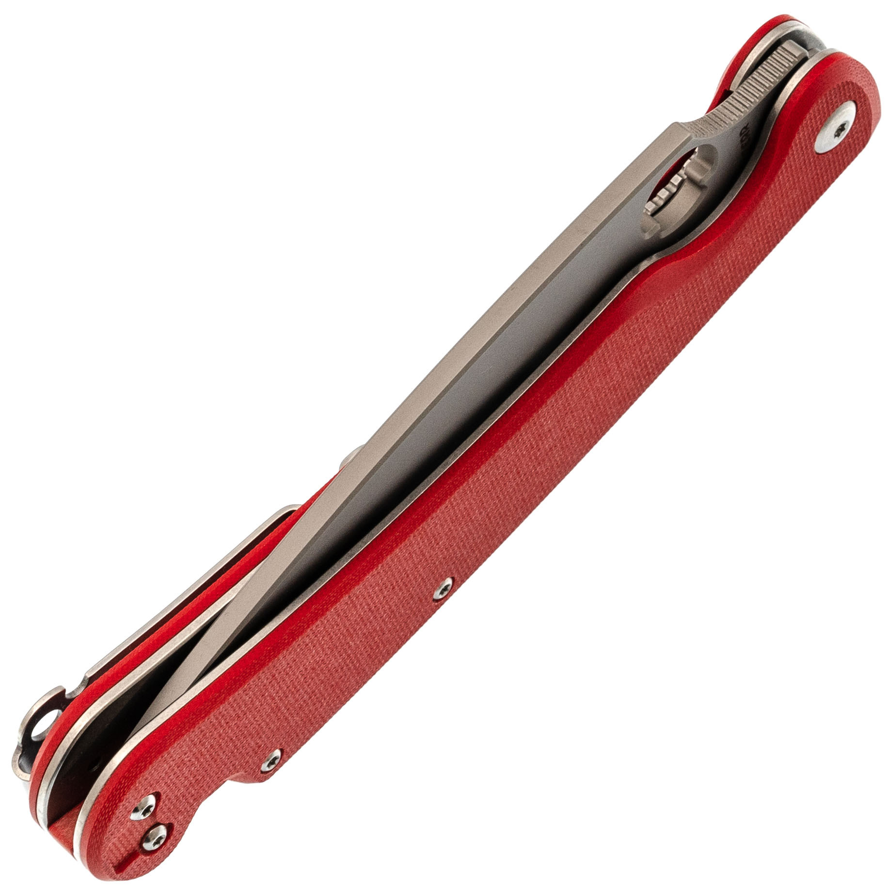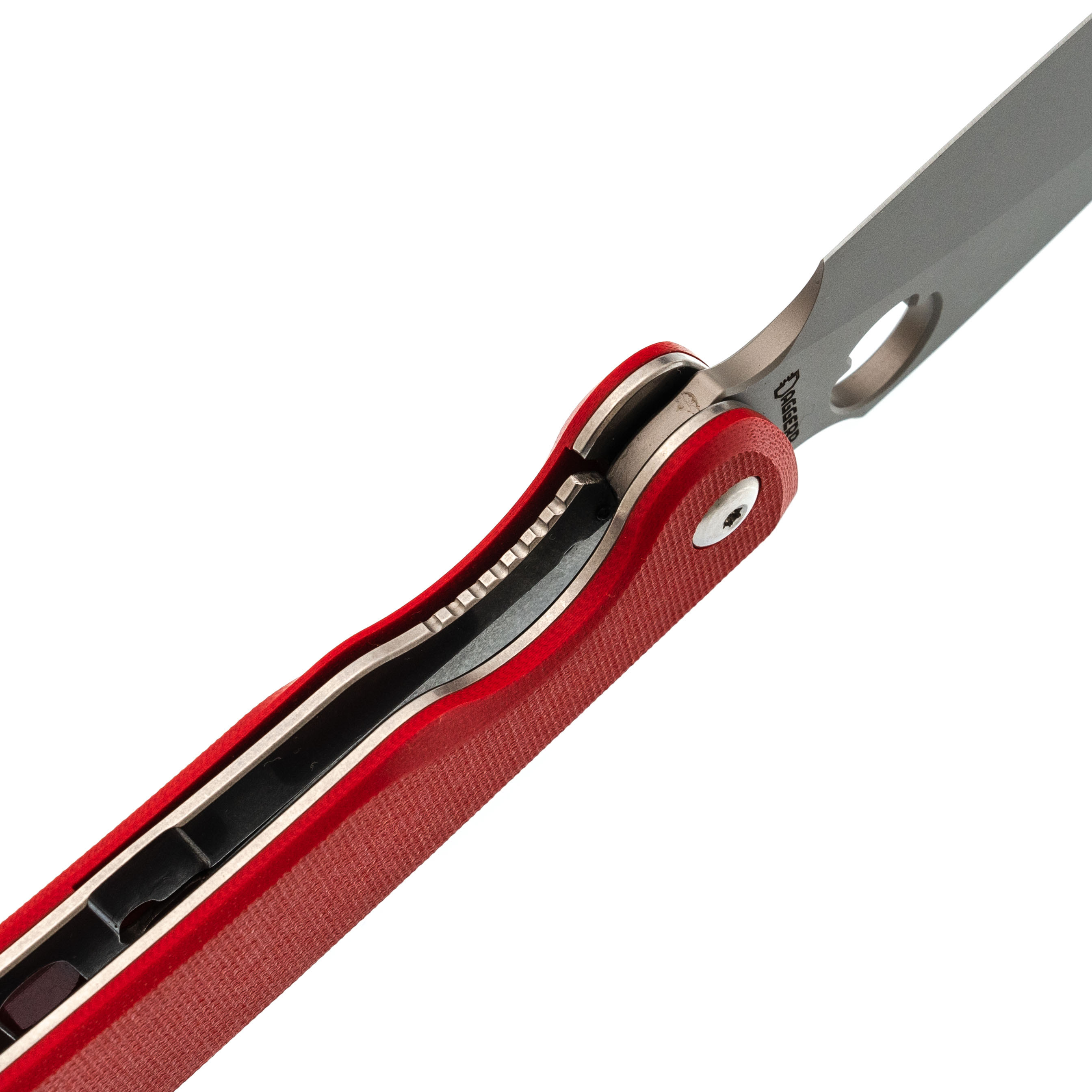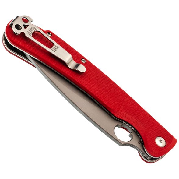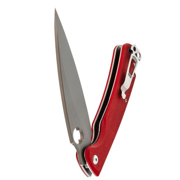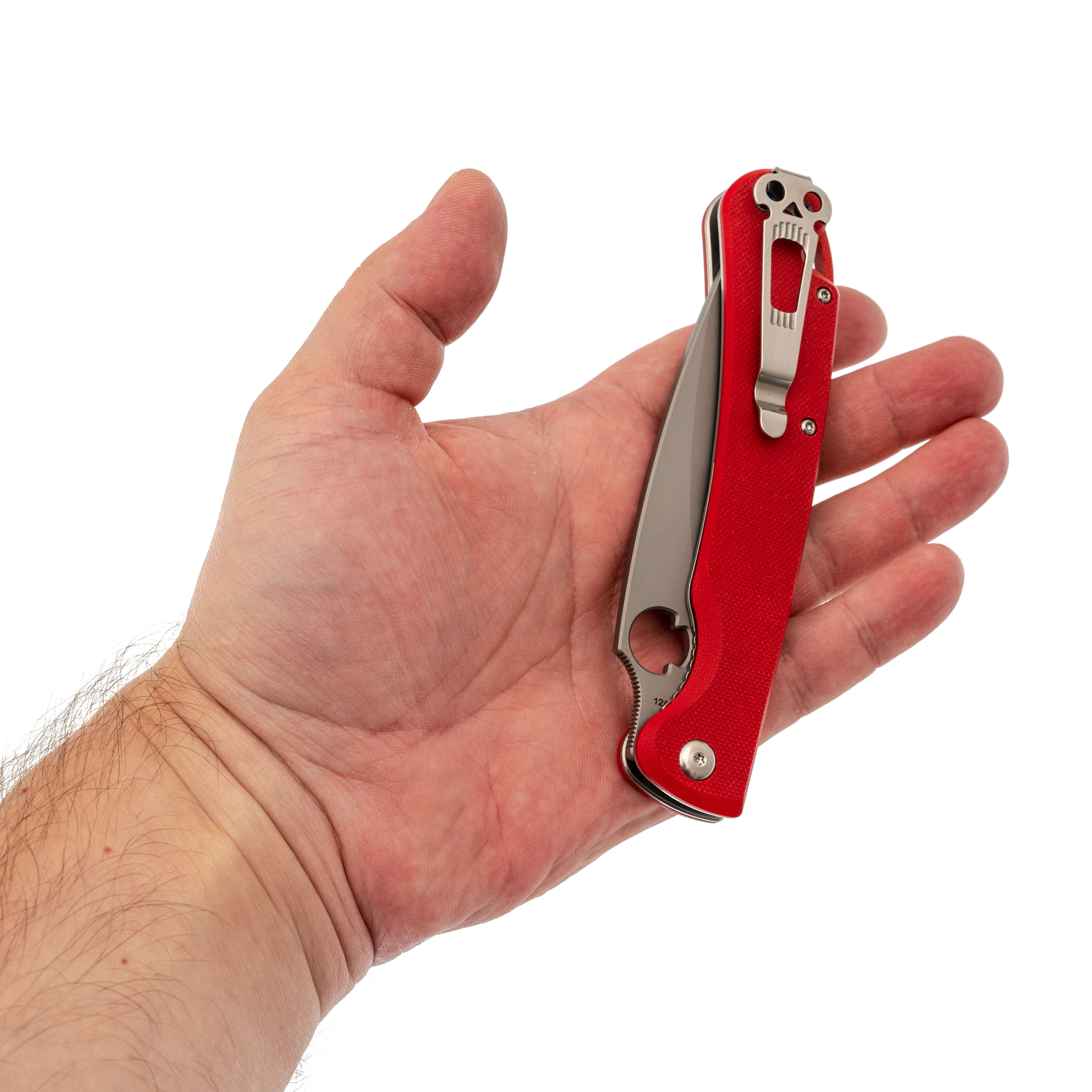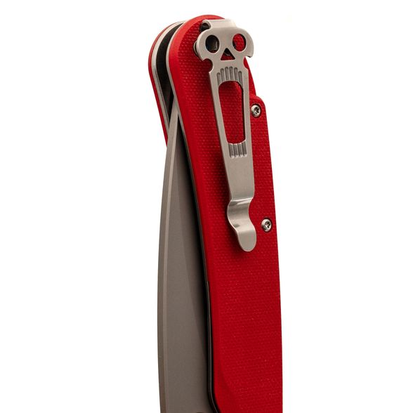 Красная G10 не только выделяется, но и отлично лежит в руке. Текстура накладок цепкая, даже в перчатках. Подпальцевый упор обеспечивает уверенный хват, а фирменная клипса с черепом добавляет узнаваемости. Есть отверстие под темляк - мелочь, а приятно.