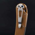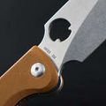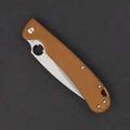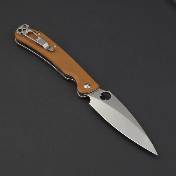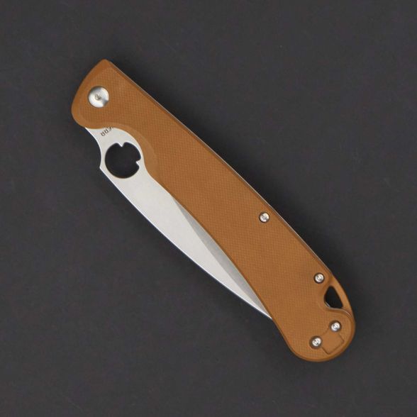 Рукоять ножа выполнена из стеклотекстолита G10 цвета Coyote — прочного и лёгкого материала, обеспечивающего надёжный хват даже во влажных условиях. Эргономичная форма рукояти с глубокой подпальцевой выемкой гарантирует удобное и безопасное удержание ножа в руке, предотвращая соскальзывание пальцев на клинок.