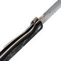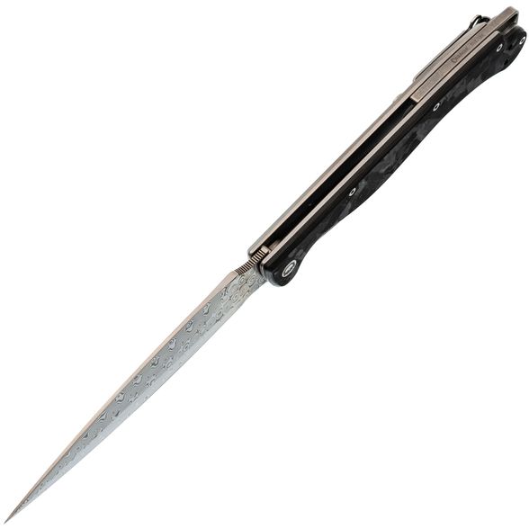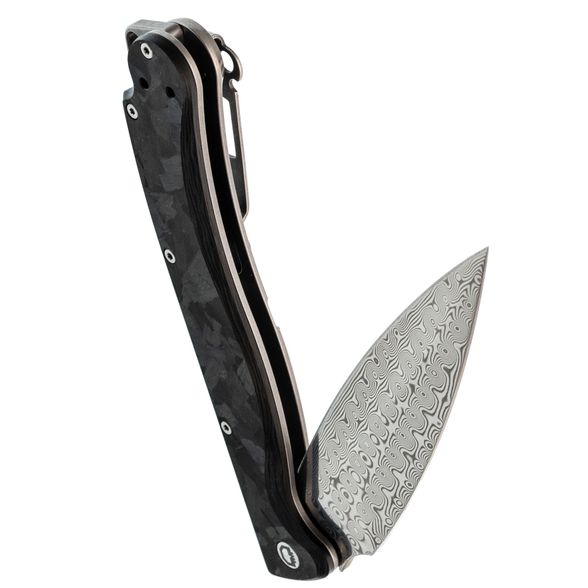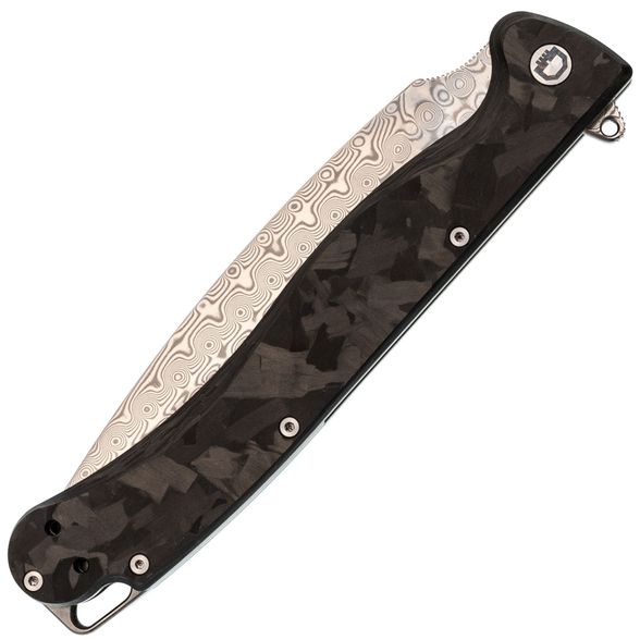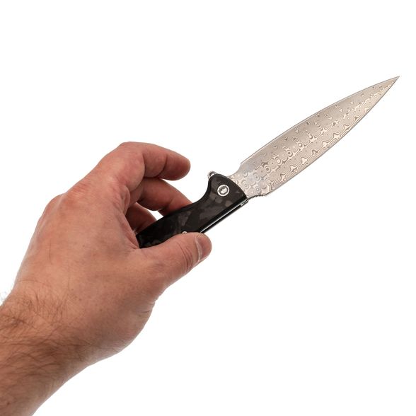 Рукоять выполнена из карбона и стали, а клинок — из дамасской стали: