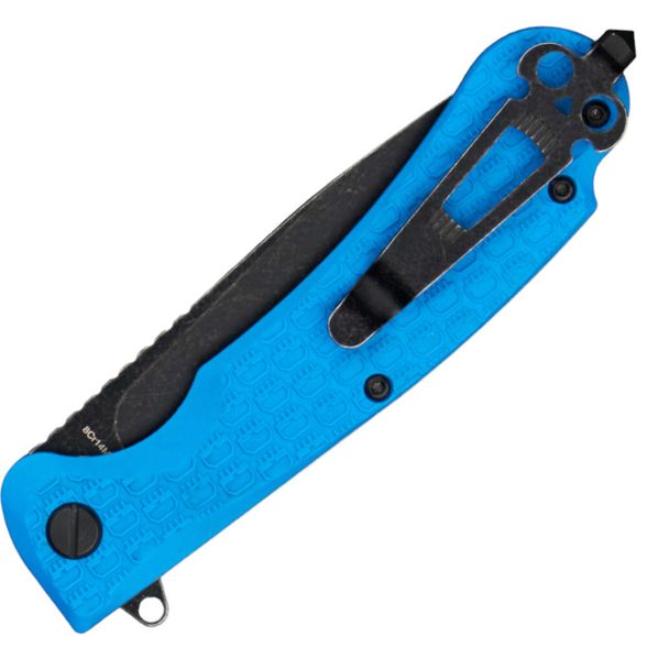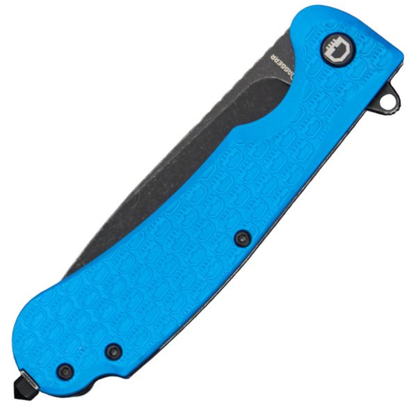 Эргономичная форма рукояти обеспечивает комфортное и надежное удержание. Изготовленные из прочного и легкого термопластика FRN, накладки для ножа имеют оригинальную текстуру в виде черепков Daggerr, данный элемент дизайна не только придает ножу элегантный вид, но также обеспечивает отличное сцепление в процессе использования. Нож оснащён фирменной клипсой с кричащим черепом. Так же нож оснащён стеклобоем, который можно использовать как куботан.