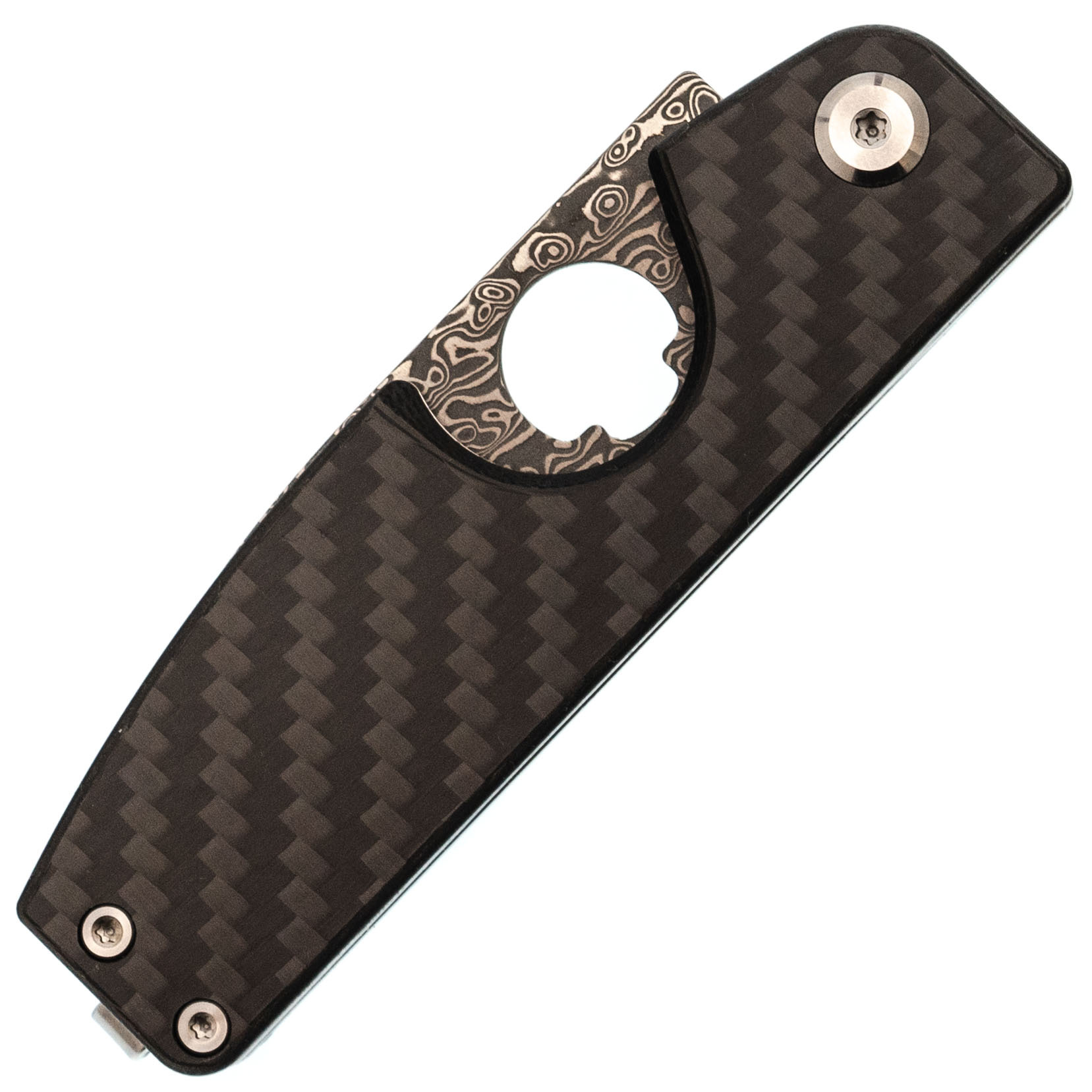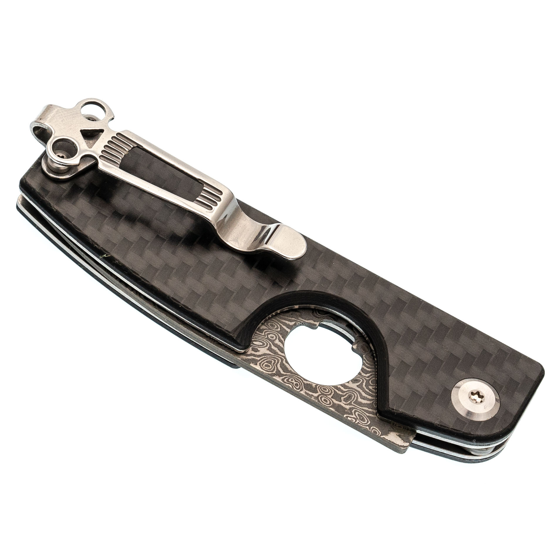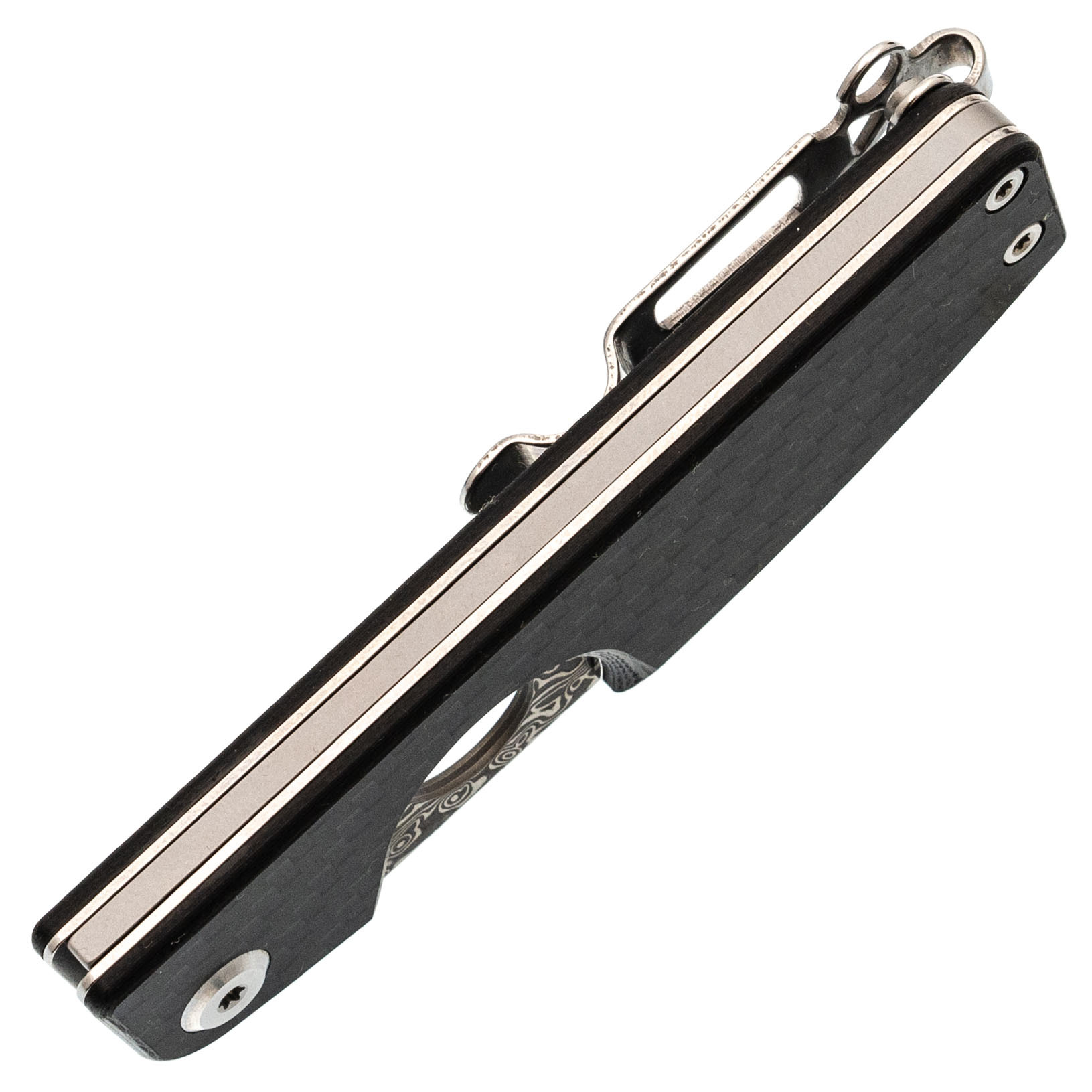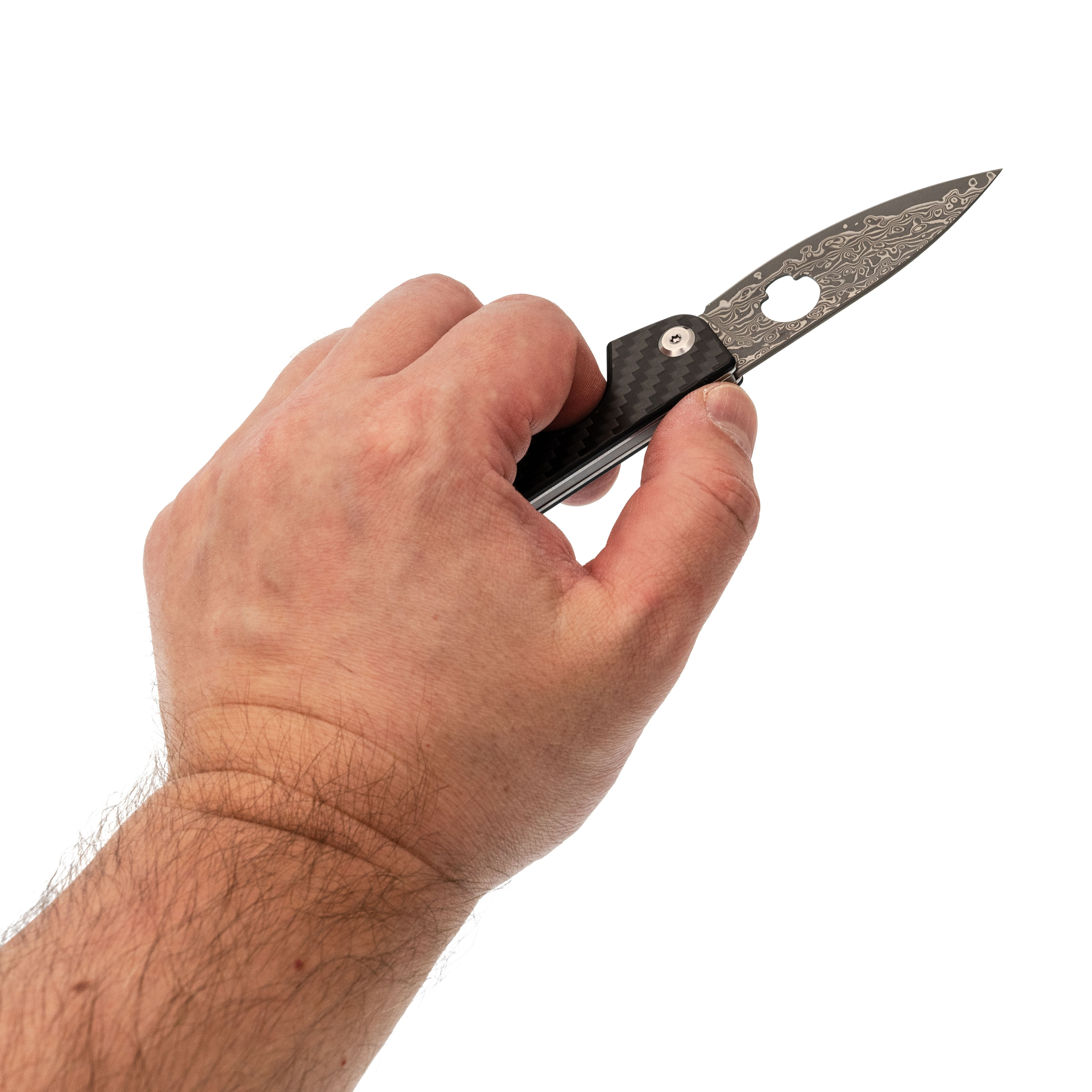 G10 с верхним слоем карбона - устойчивый к внешним воздействиям материал. Ламинат не впитывает влагу, не выцветает и долго сохраняет форму. Карбон делает рукоять визуально строгой, почти деловой.