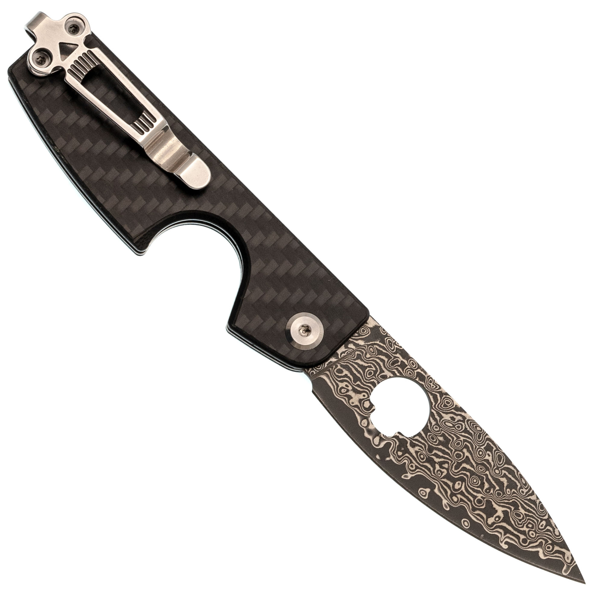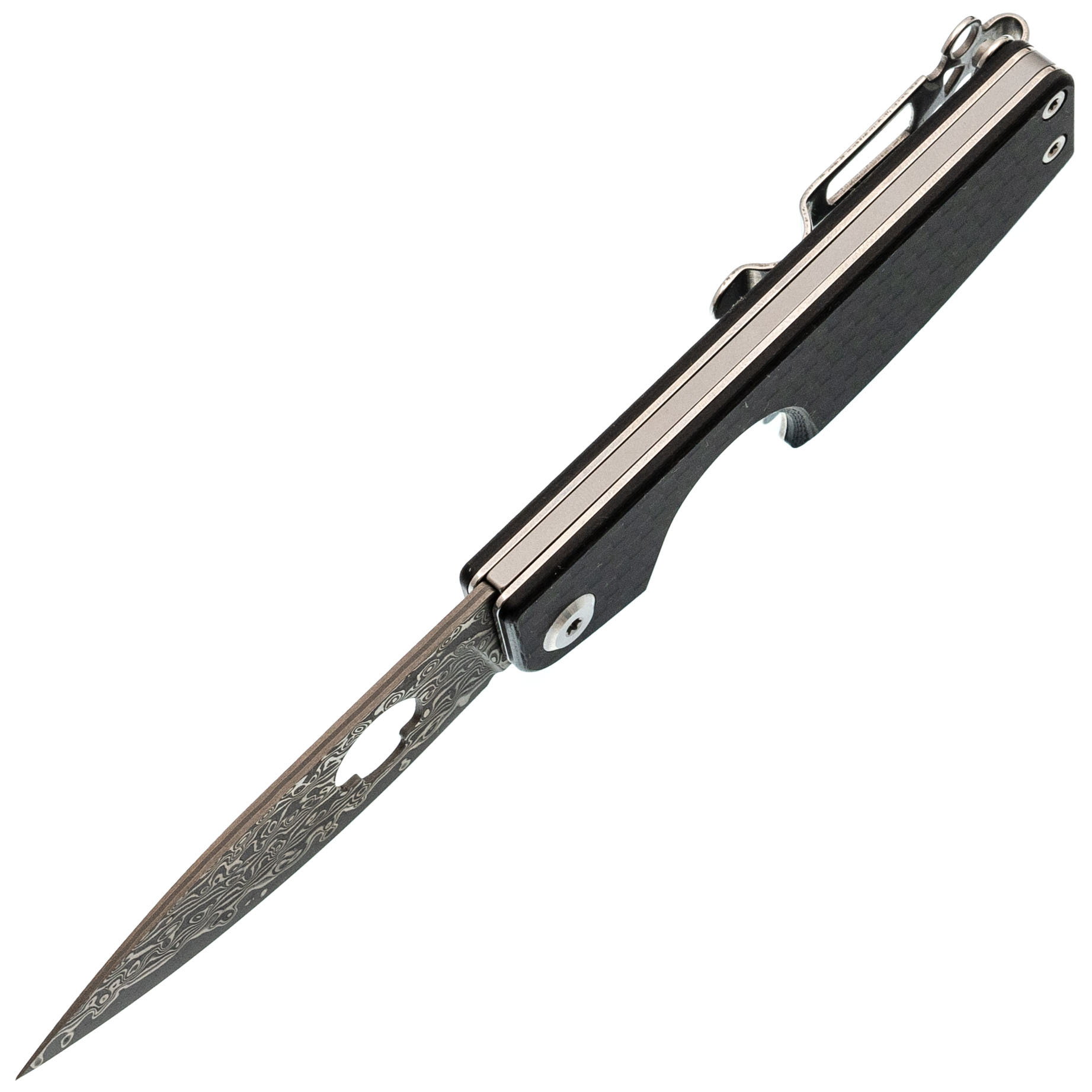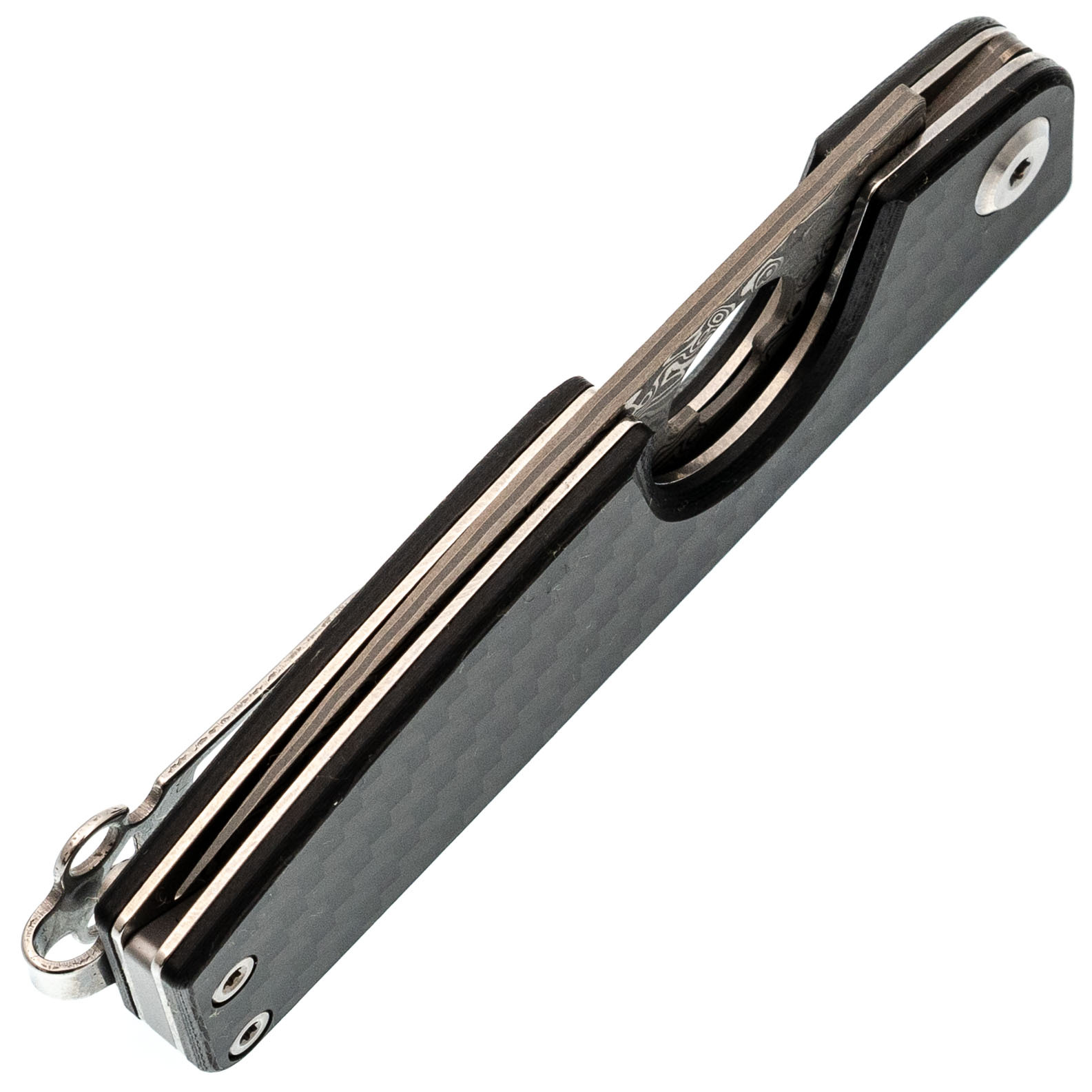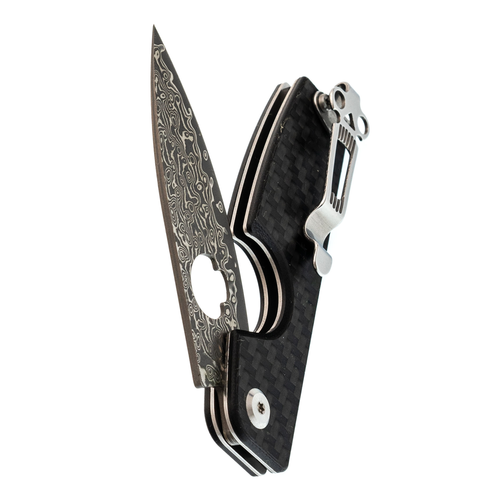 G10 с верхним слоем карбона - устойчивый к внешним воздействиям материал. Ламинат не впитывает влагу, не выцветает и долго сохраняет форму. Карбон делает рукоять визуально строгой, почти деловой.