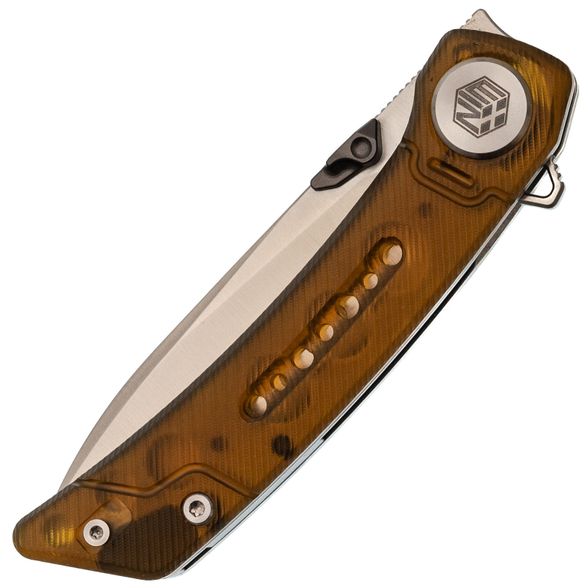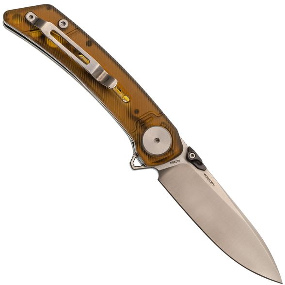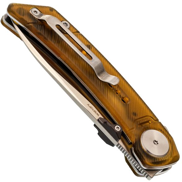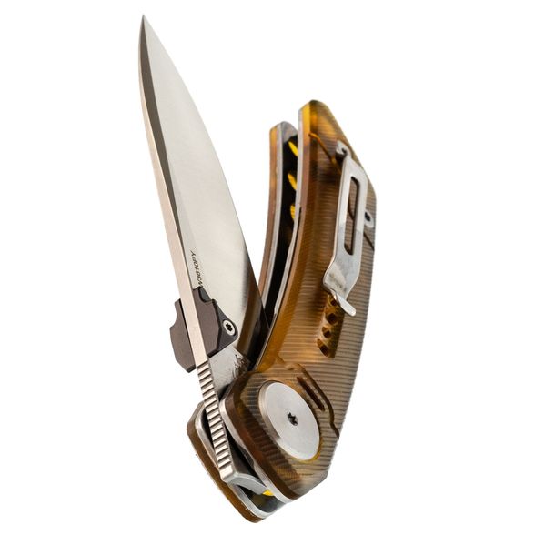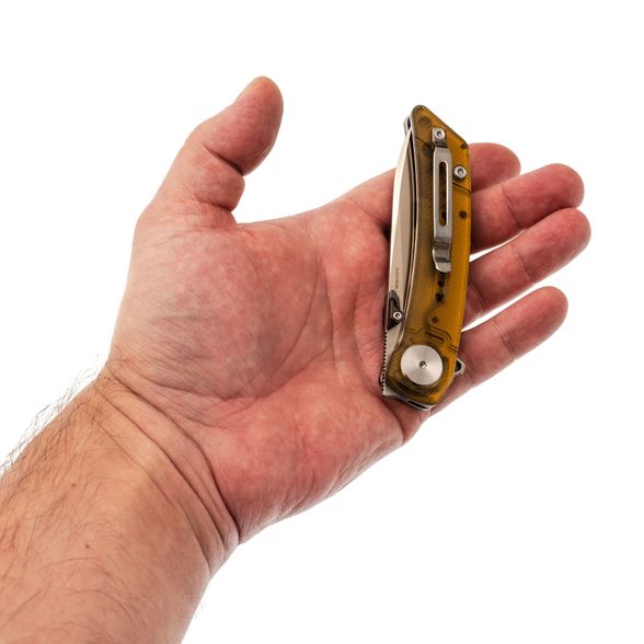 Рукоять с накладками из PEI выглядит современно и нестандартно. Простая эргономичная форма и надёжный хват делают нож удобным в длительном использовании. В наличии удобная клипса и темлячное отверстие для персонализации и ношения.