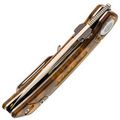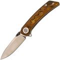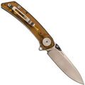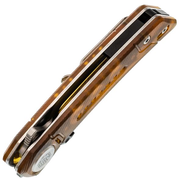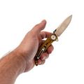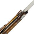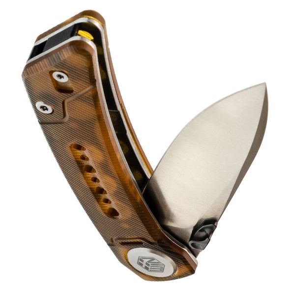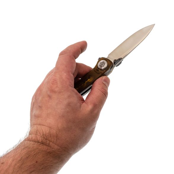 Клинок открывается моментально благодаря флипперу и подшипникам, дополнительно есть удобные шпеньки с обеих сторон. Геометрия Drop-Point с высокими прямыми спусками обеспечивает универсальность реза и хорошую управляемость.
