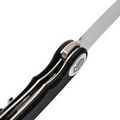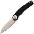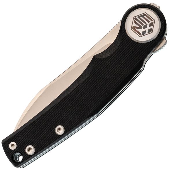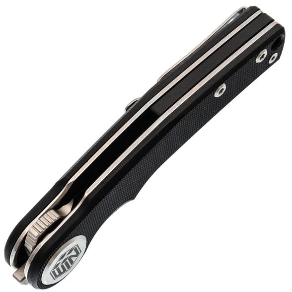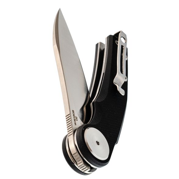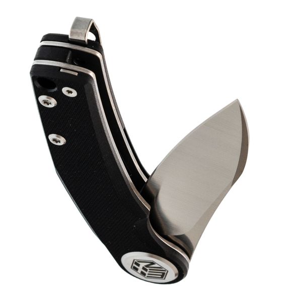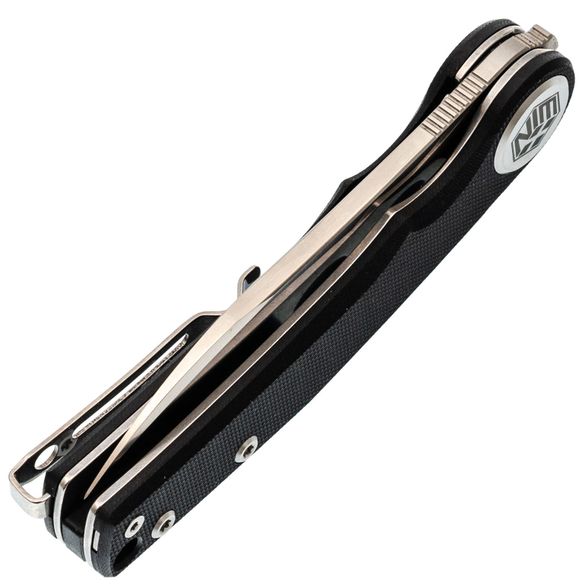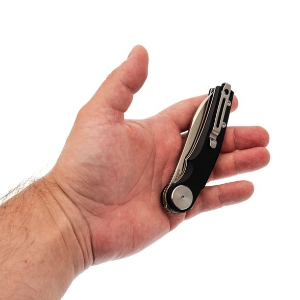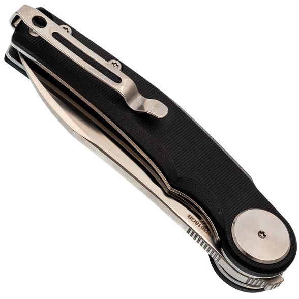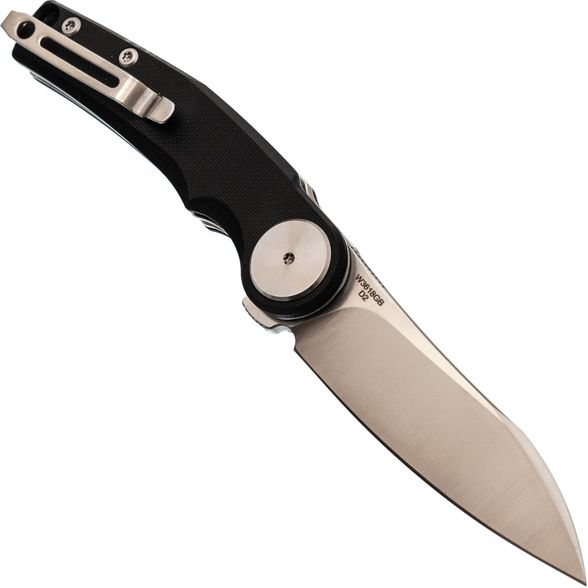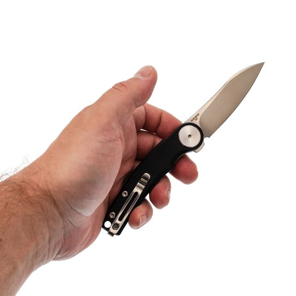Накладки из чёрного G10 делают нож универсальным по внешнему виду - он уместен как в повседневном использовании, так и в рабочем контексте. Форма рукояти с лёгким изгибом способствует комфортному хвату, а крупный осевой узел добавляет аккуратности общему стилю. Предусмотрена клипса с возможностью перестановки и отверстие под темляк.