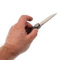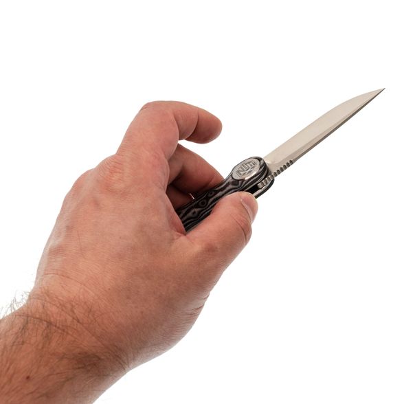 Drop-Point легко справляется с большинством задач. Прямые спуски улучшают режущие свойства. Сатинированный финиш делает клинок менее марким, устойчивым к коррозии. Длинное фальшлезвие добавляет визуального акцента и облегчает общую массу.