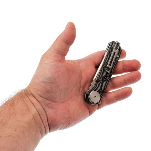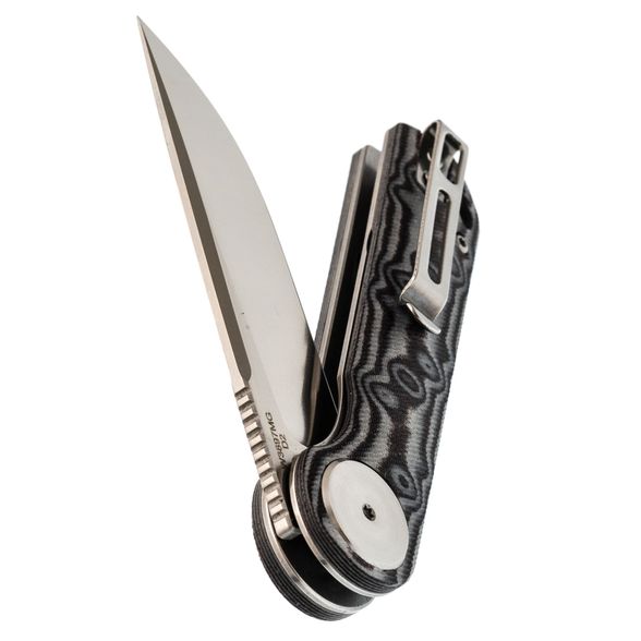 Рукоять продумана с учётом длительного использования. Выемки и форма позволяют работать в перчатках. Микарта не скользит, даже если рука влажная. Переставляемая клипса и темлячное отверстие делают нож универсальным и настраиваемым под владельца.