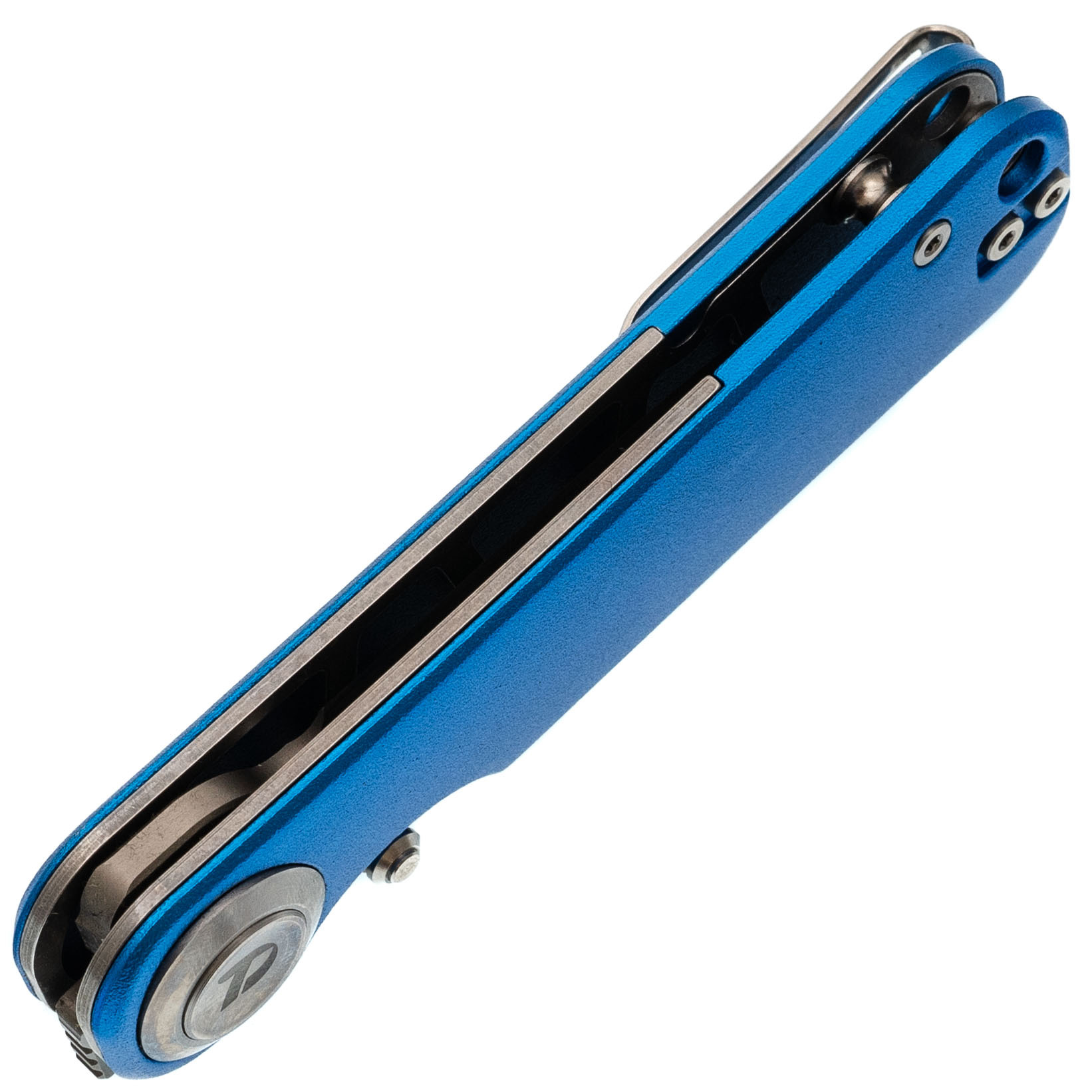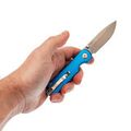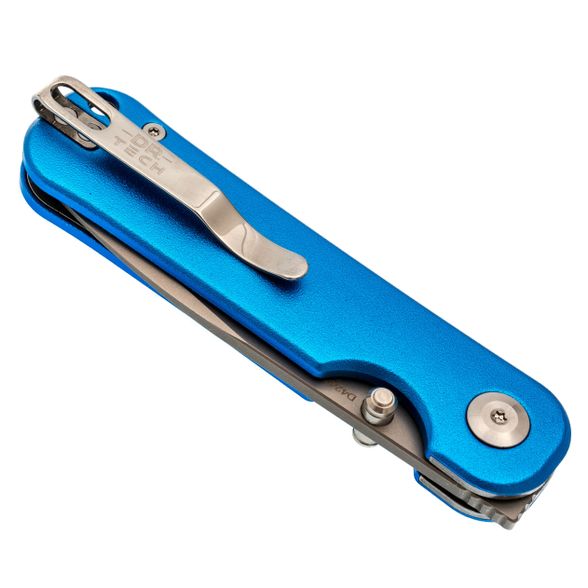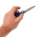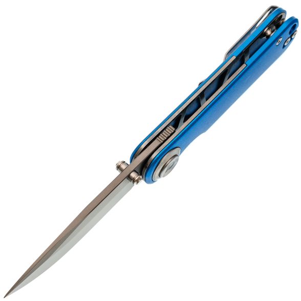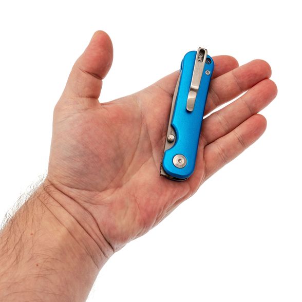 Нейтральная форма рукояти с крупной подпальцевой выемкой держит кисть на месте и помогает контролировать клинок даже при силовом резе. Ярко-синий алюминий смотрится свежо и современно, визуально перекликаясь с названием Zefir. В глаза сразу бросается крупный осевой узел - он выполняет роль кнопки разблокировки замка Liner-Lock, что делает складывание ножа интуитивным и безопасным. Переставляемая карманная клипса позволяет носить нож так, как удобно вам, на любой стороне и в привычном положении в кармане.