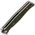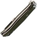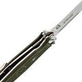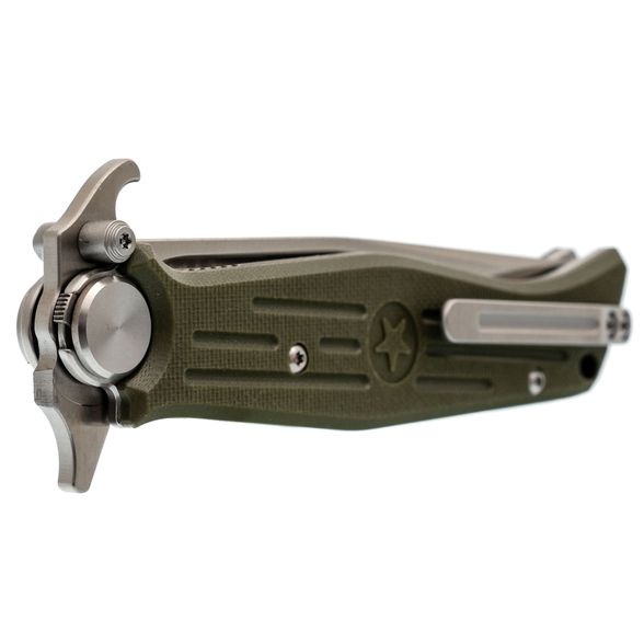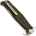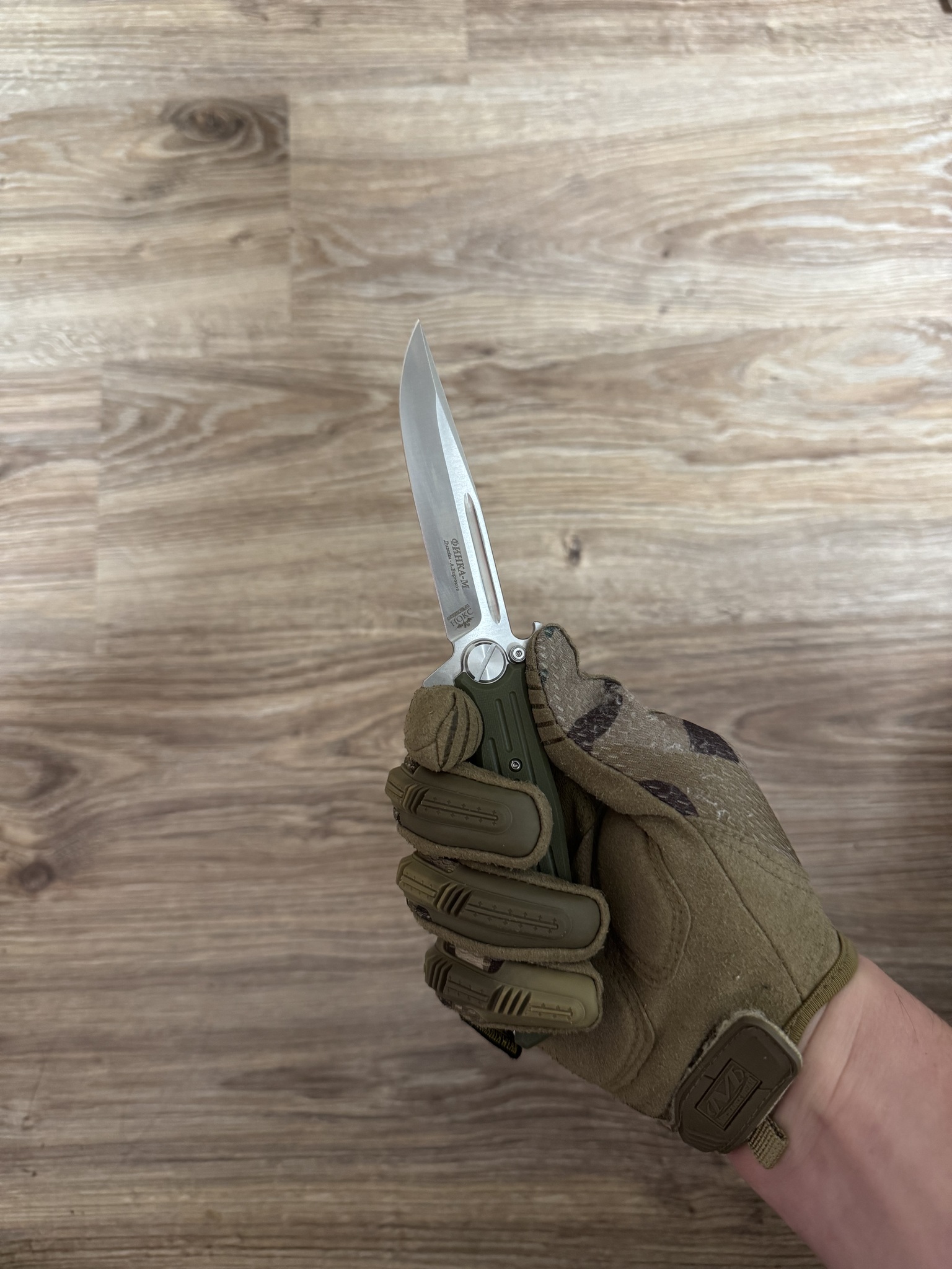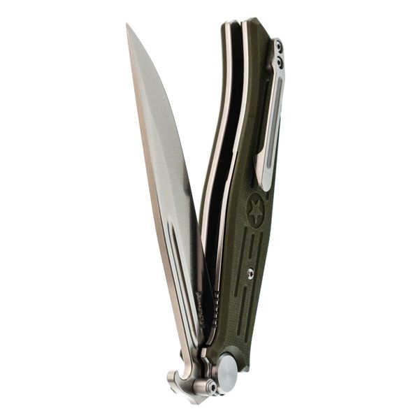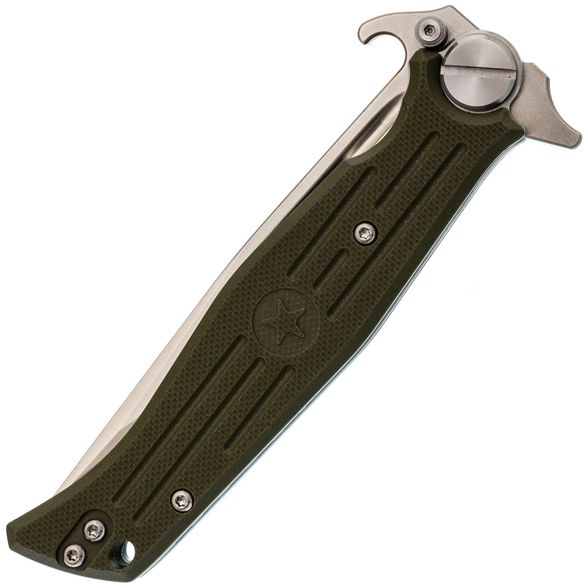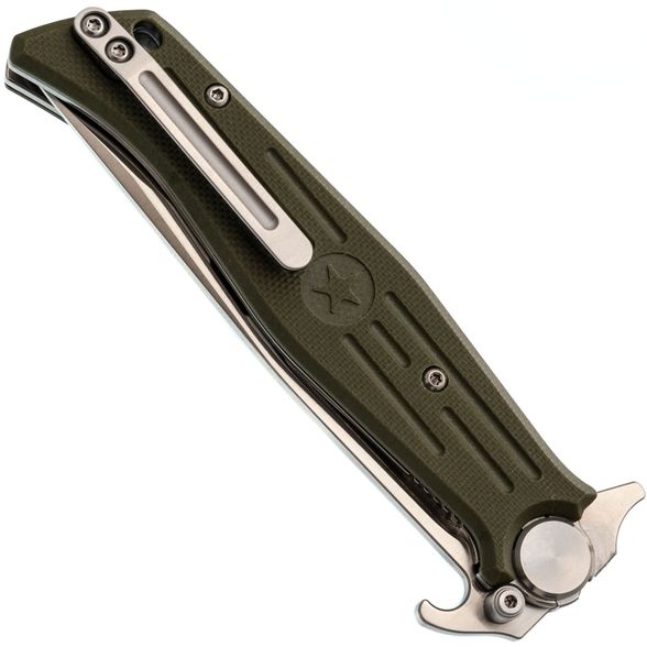 Рукоять ножа имеет эргономичную форму и изготовлена из стальных лайнеров с накладками из стеклотекстолита G10. Этот материал отличается прочностью, устойчивостью к влаге и загрязнениям. Один из лайнеров выполняет функцию надежного замка, обеспечивая безопасность при использовании. Рукоять удобно лежит в руке, а наличие переставляемой клипсы и темлячного отверстия позволяет удобно носить нож.