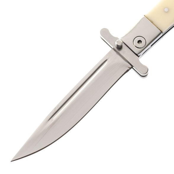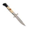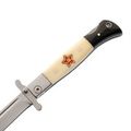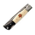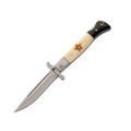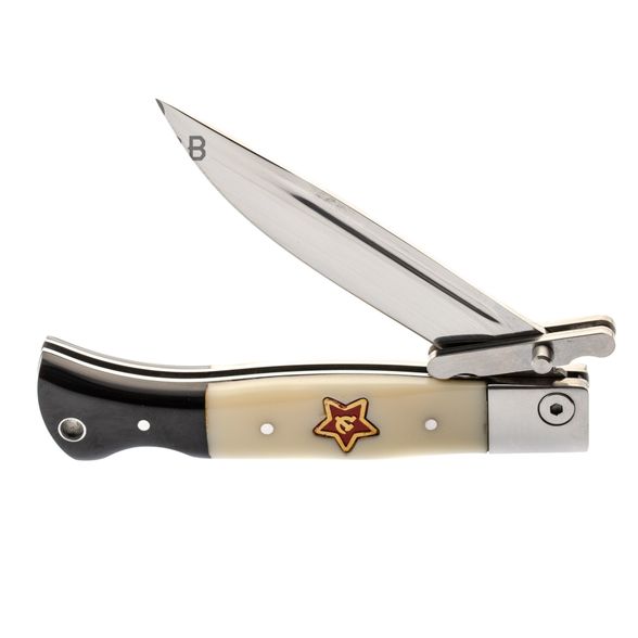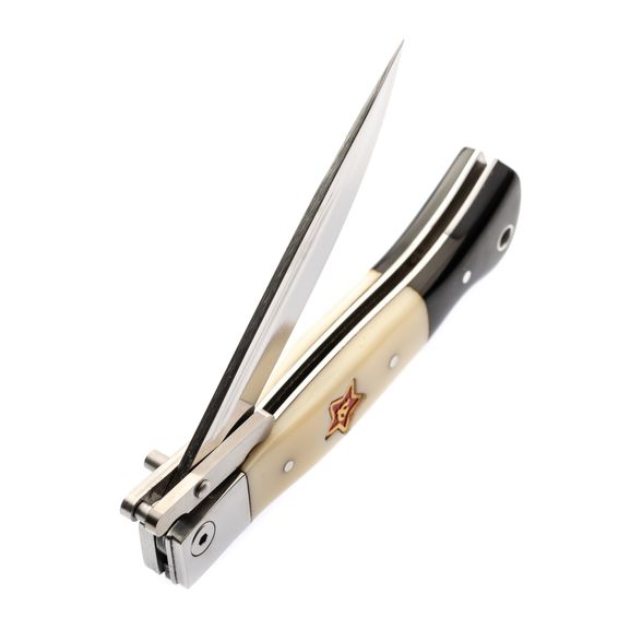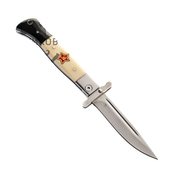Складной нож Финка НКВД, совершенно точно понравится ценителям истории своей страны. Этот вариант выполнен по мотивам фиксированных ножей в финском стиле, которые получили народное название "финка НКВД". Складной формат немного непривычен для ножей такого типа, но надо отметить, что здесь все получилось очень удачно. Особенно стоит отметить интересный момент, когда двухсторонняя гарда также является складывающимся элементом. Клинок классической формы имеет ровный обух и острый кончик. На рукояти используется двухцветный твердый пластик в который вплавлена пятиконечная звезда.