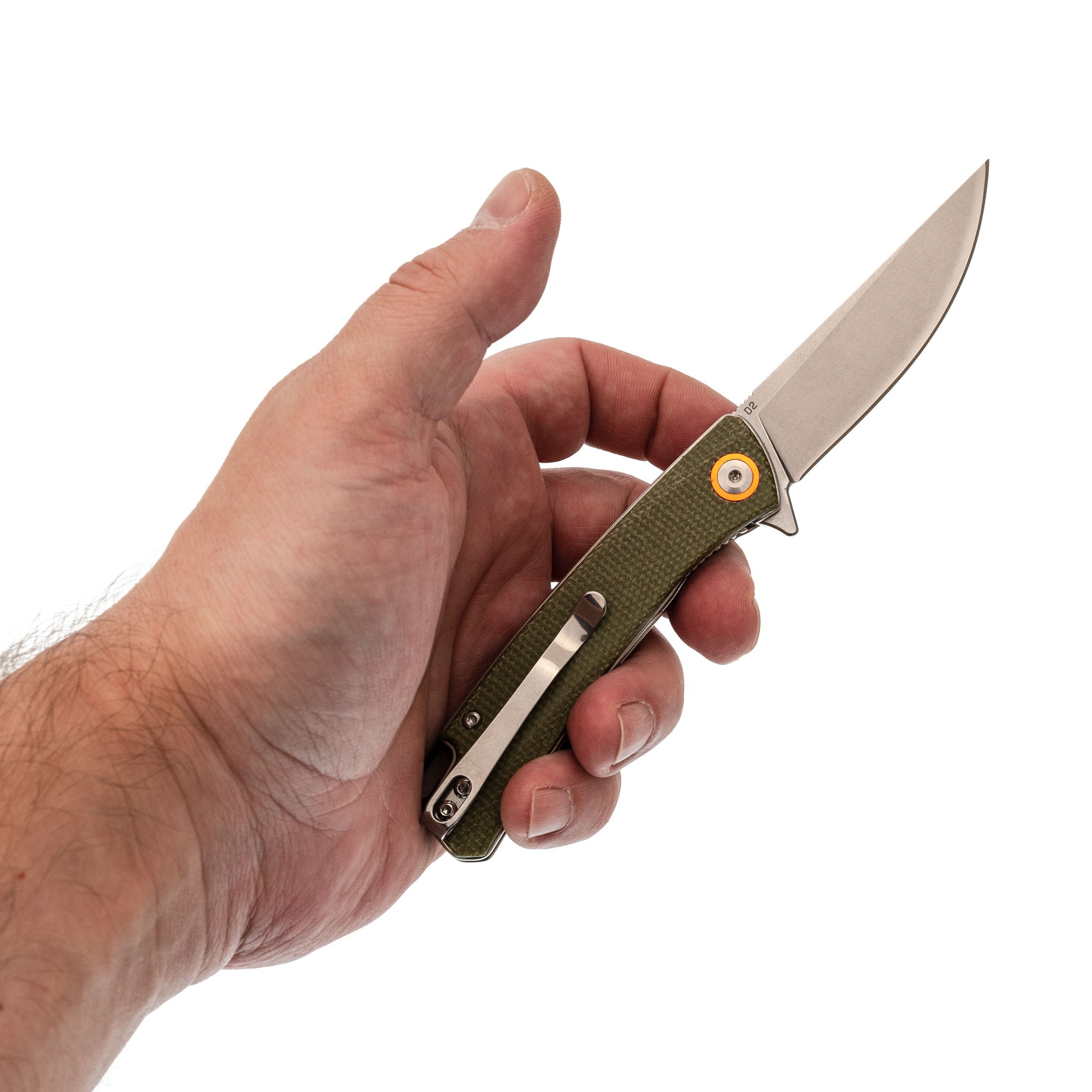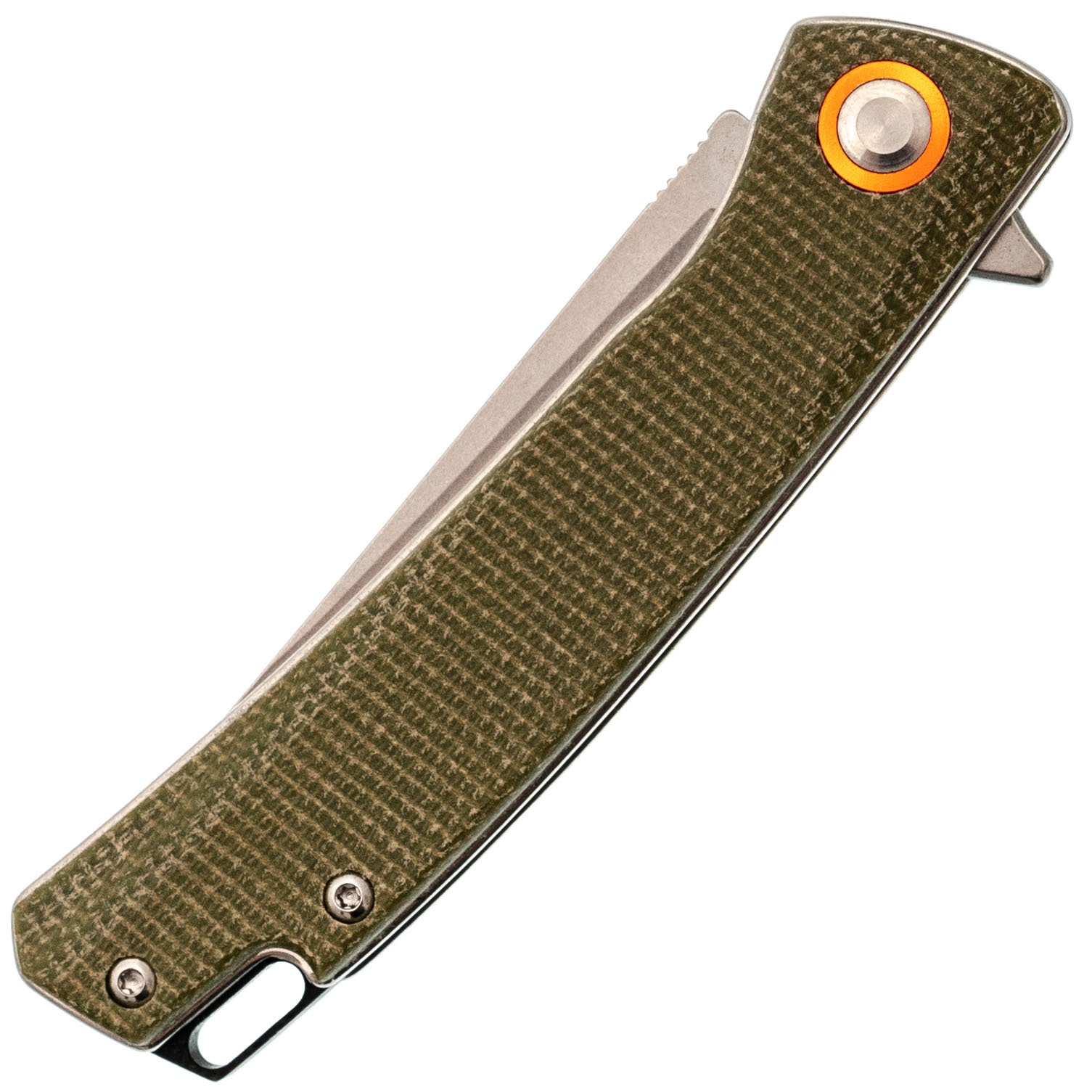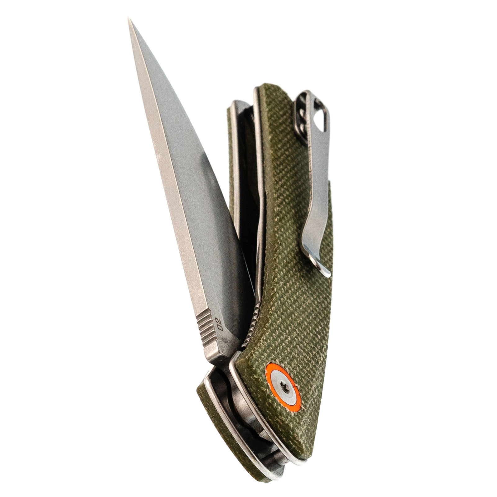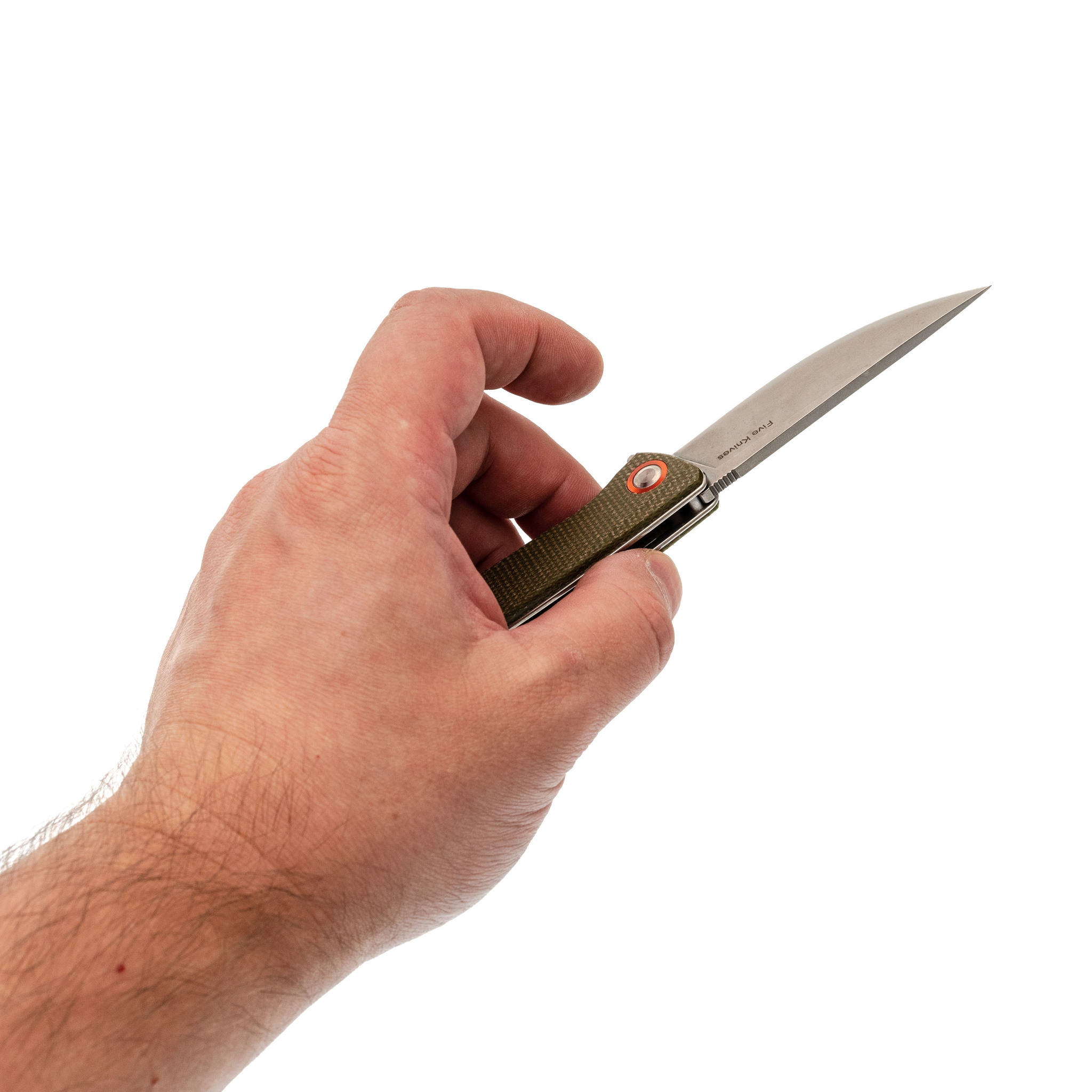 Рукоять модели имеет нейтральную изогнутую форму, благодаря чему нож комфортно лежит в руке большинства пользователей. Накладки выполнены из уникального материала - микарты. Микарта - это прочный полимер, устойчивый к воздействию влаги, ударов и перепадов температур. Кроме того, со временем она затирается и приобретает уникальный внешний вид, делая каждый нож индивидуальным.