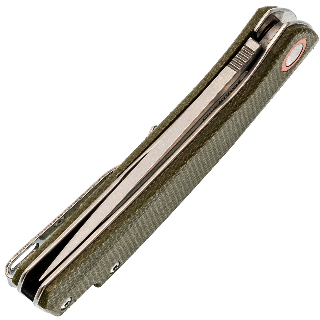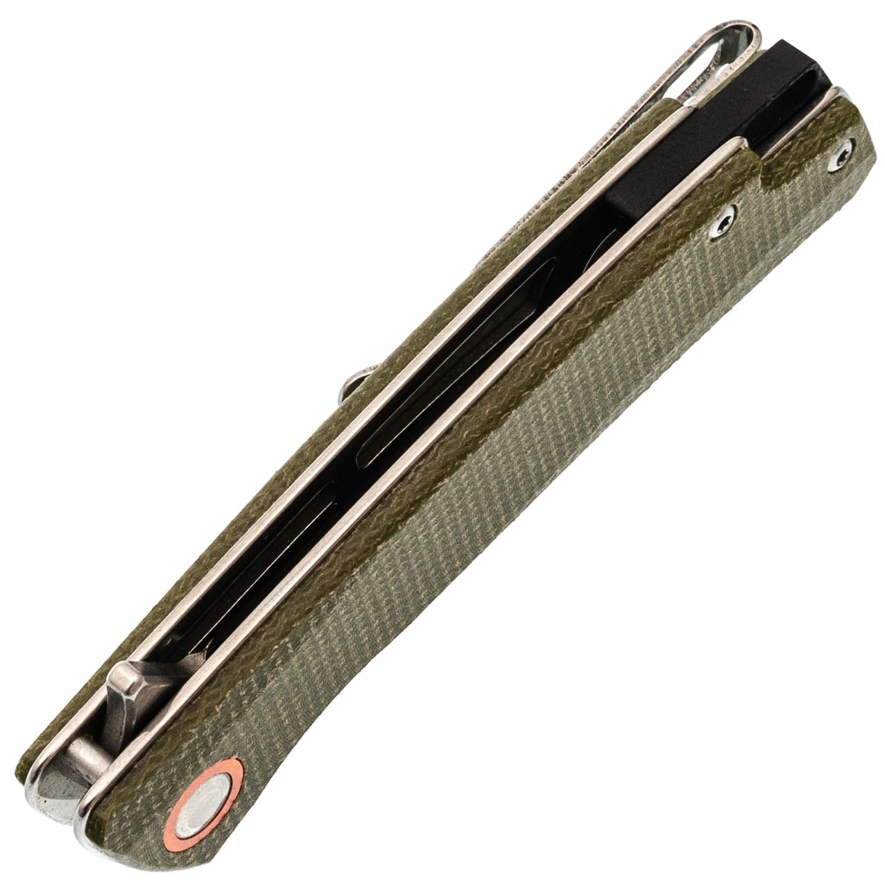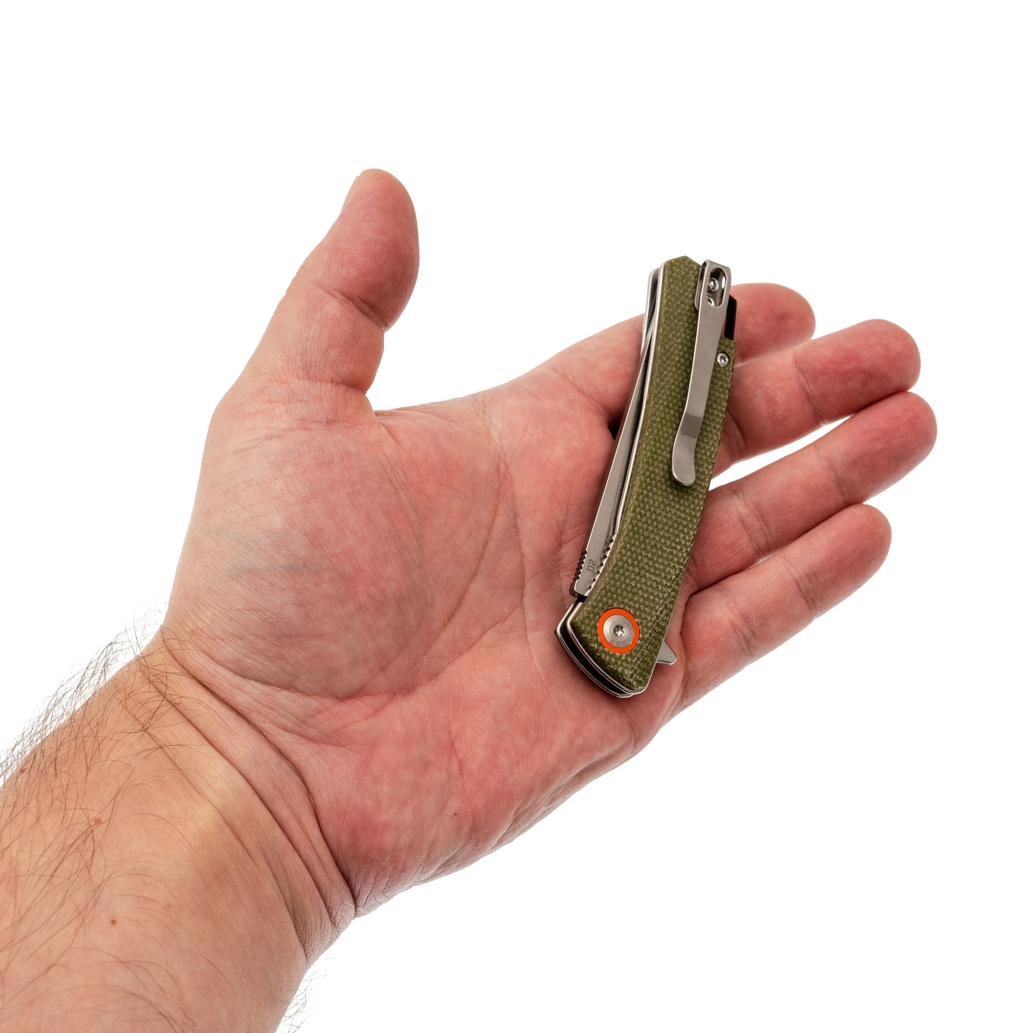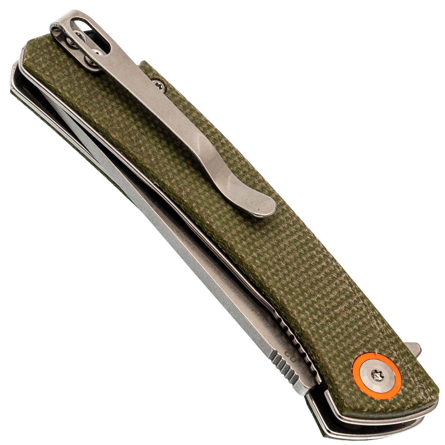 Рукоять модели имеет нейтральную изогнутую форму, благодаря чему нож комфортно лежит в руке большинства пользователей. Накладки выполнены из уникального материала - микарты. Микарта - это прочный полимер, устойчивый к воздействию влаги, ударов и перепадов температур. Кроме того, со временем она затирается и приобретает уникальный внешний вид, делая каждый нож индивидуальным.